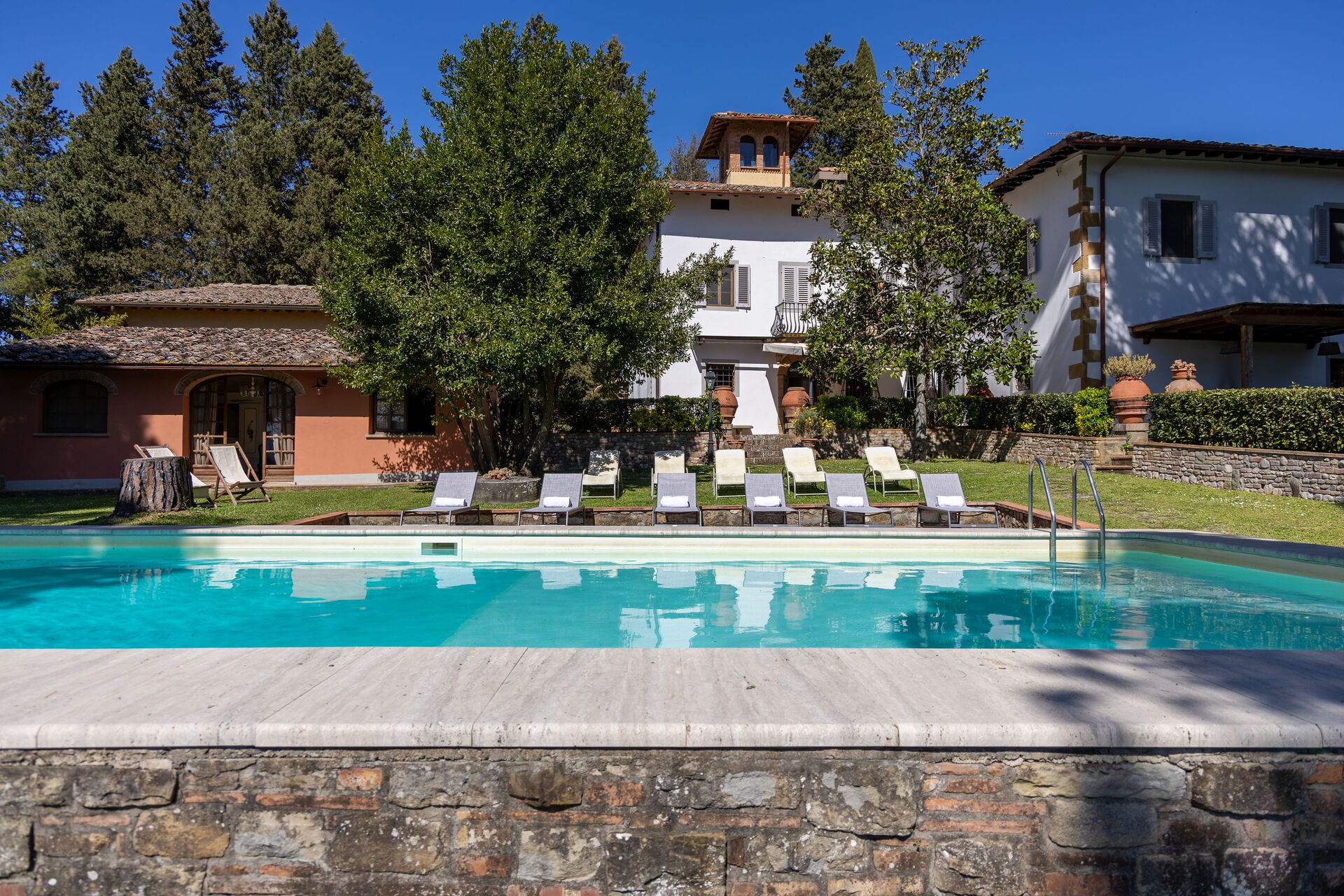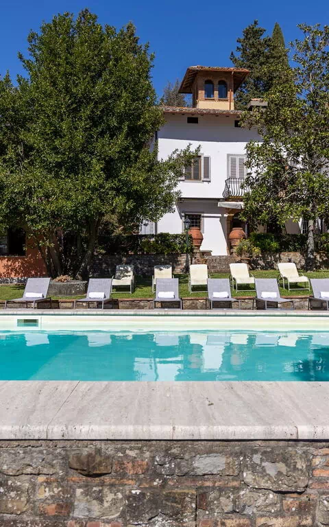 Les 8 chambres sont un hommage au classicisme toscan, dotées d'un mobilier raffiné et entièrement climatisées. La répartition des pièces entre la demeure principale et l'annexe discrète au bord de la piscine garantit une harmonie parfaite entre les moments de groupe et l'intimité individuelle, assurée par la présence de salles de bain privées attenantes dans la quasi-totalité des chambres.
