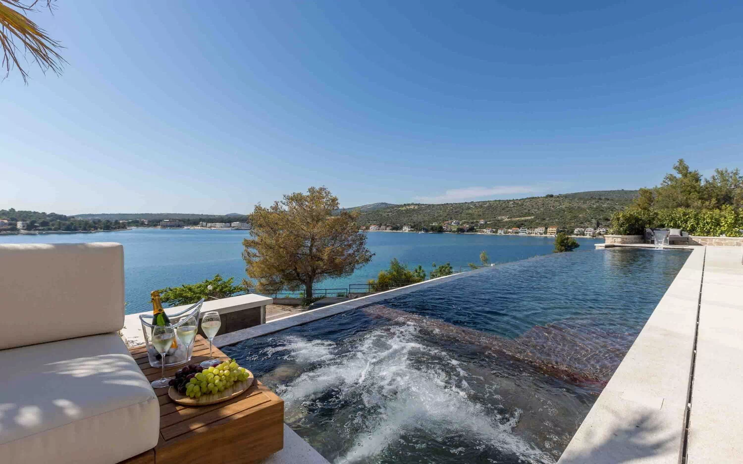 - piscine privée à débordement chauffable (jusqu’à environ 23°C) avec cascade et zone hydromassante intégrée
