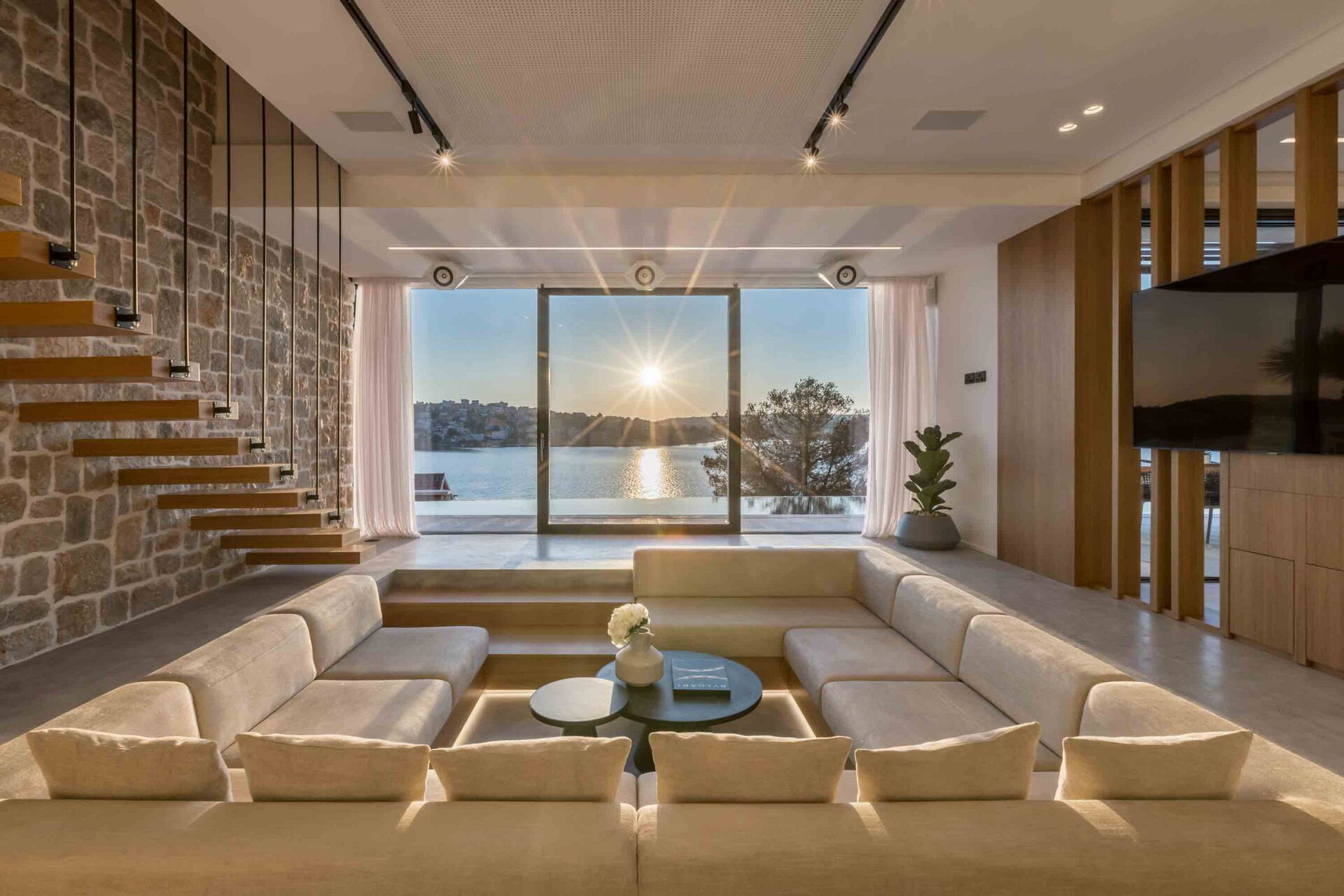 La villa s’étend sur 2 étages et dispose d’un grand espace ouvert avec des baies vitrées panoramiques donnant sur l’extérieur (air conditionné, TV satellite, Wi-Fi Starlink), coin repas, cuisine (plaque de cuisson, four, réfrigérateur, congélateur, lave-vaisselle, micro-ondes, machine à café) et espace salon (air conditionné, TV satellite).