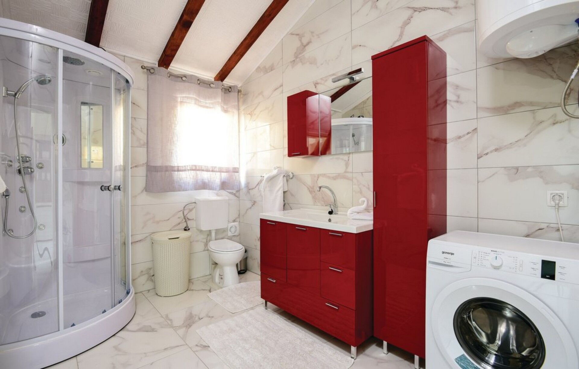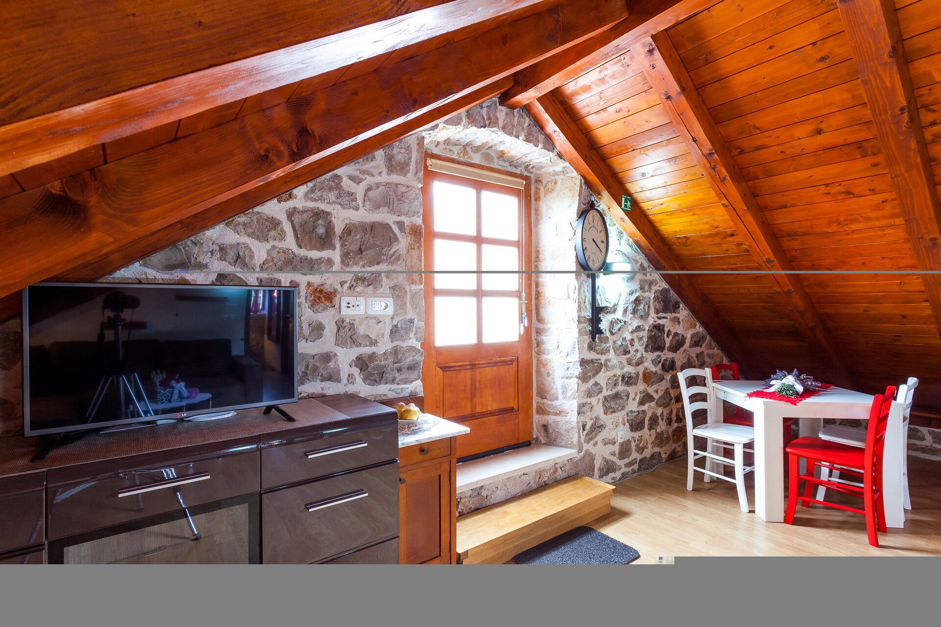 Premier étage: grenier avec mini-appartement avec cuisine et salon, chambre double avec salle de bain privée avec douche.