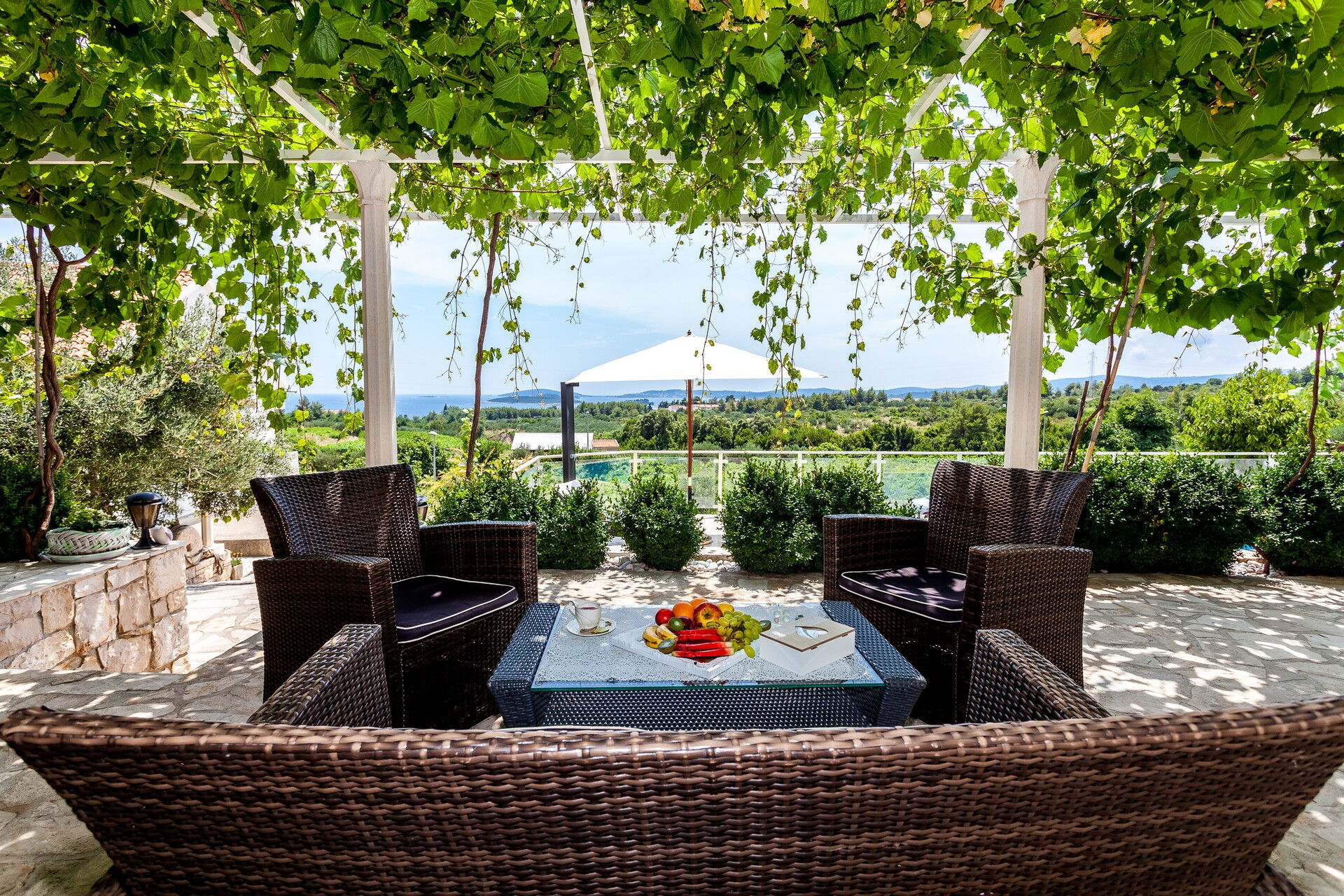 La position vallonnée et panoramique offre à toutes celles et ceux qui séjournent à la Villa Azurit une vue incroyable sur la mer, qui se trouve à moins d'un kilomètre de distance, aussi bien depuis la belle piscine et le bain à remous "fait maison" incrusté dans les pierres, ou depuis les espaces de détente et les pergolas équipées pour les repas en plein air.