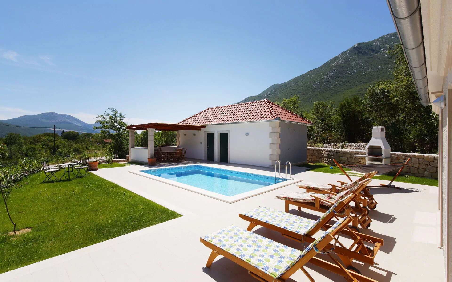 À l'extérieur, en plus de la belle piscine avec solarium et chaises longues, la villa dispose d'un barbecue en briques et d'une véranda couverte avec table et chaises où vous pourrez dîner à l'extérieur, le tout entouré d'une pelouse bien entretenue.