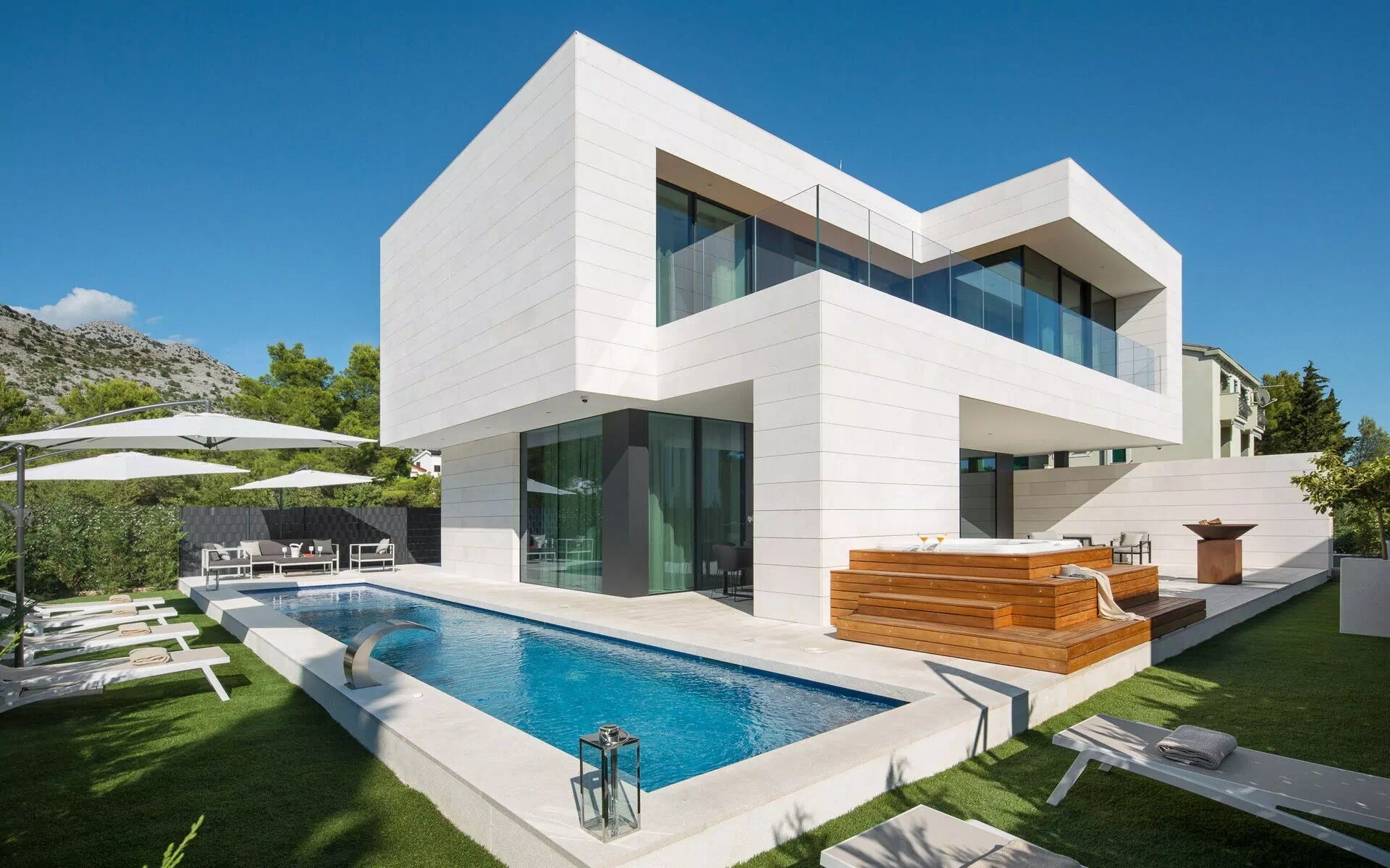 L'architecture innovante de la structure se reflète également à l'extérieur avec l'emplacement et la forme particulière de la piscine (chauffable sur demande et moyennant un coût supplémentaire), du bain à remous (également chauffable, mais sans frais supplémentaires) et du barbecue; elle offre également une grande véranda couverte avec espace repas et espace détente.