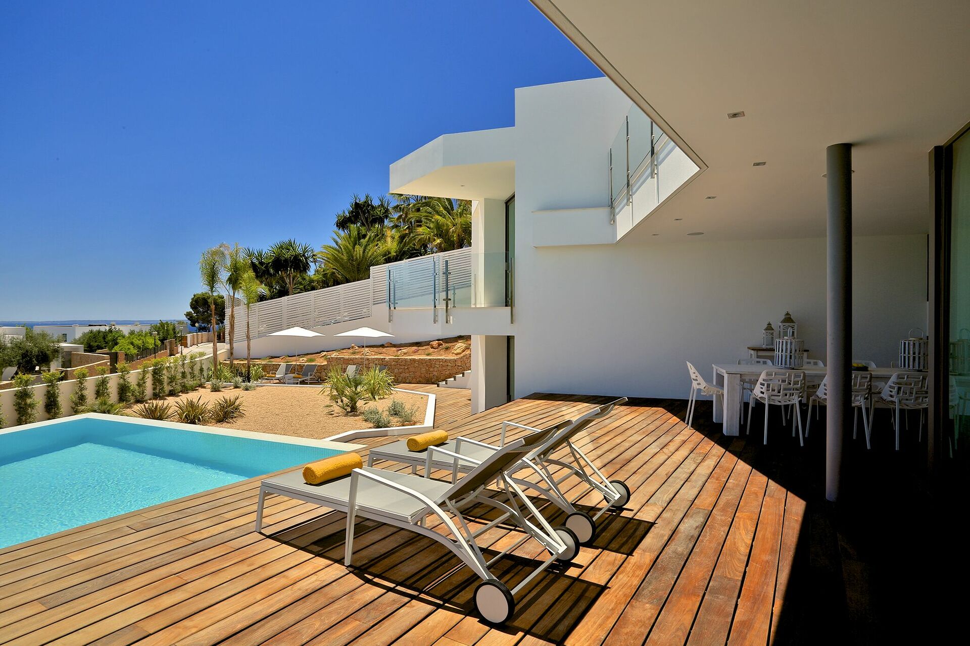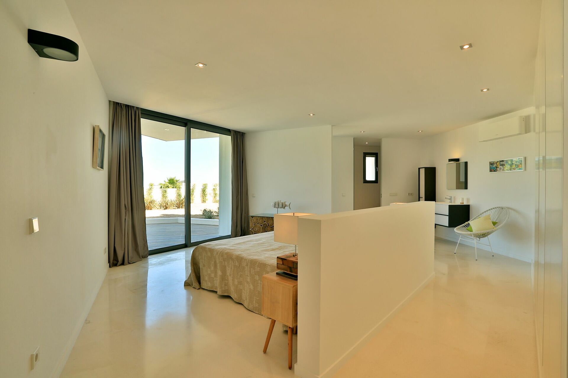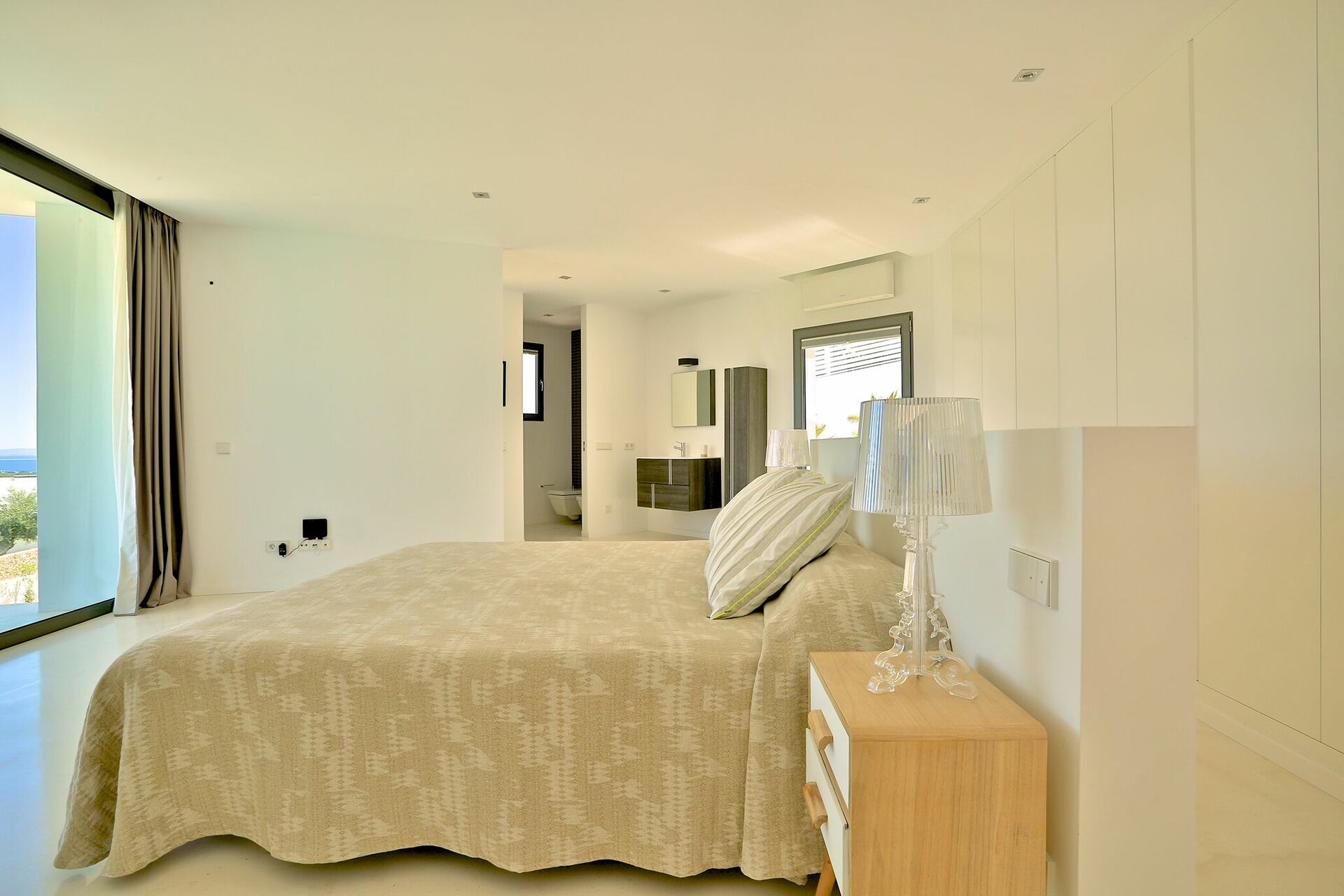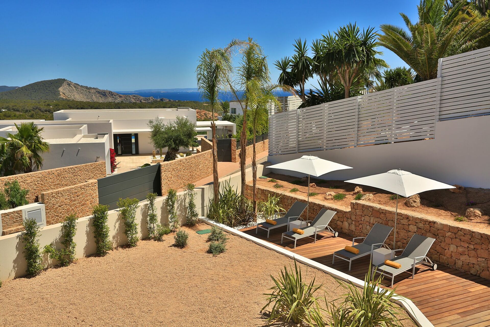 La particularité d’ Alegre Villa sont certainement ses extérieurs caractérisés par de grandes terrasses qui donnent sur la nature environnante et des quelles vous pourrez jouir d’une vue magnifique et panoramique sur la mer et les eaux cristallines de Es Torrent. Une zone living à l’extérieur (petits fauteuils, tables et chaises) est le lieu idéal pour préparer déjeuners, dîners et apéritifs entre amis ou avec votre famille.