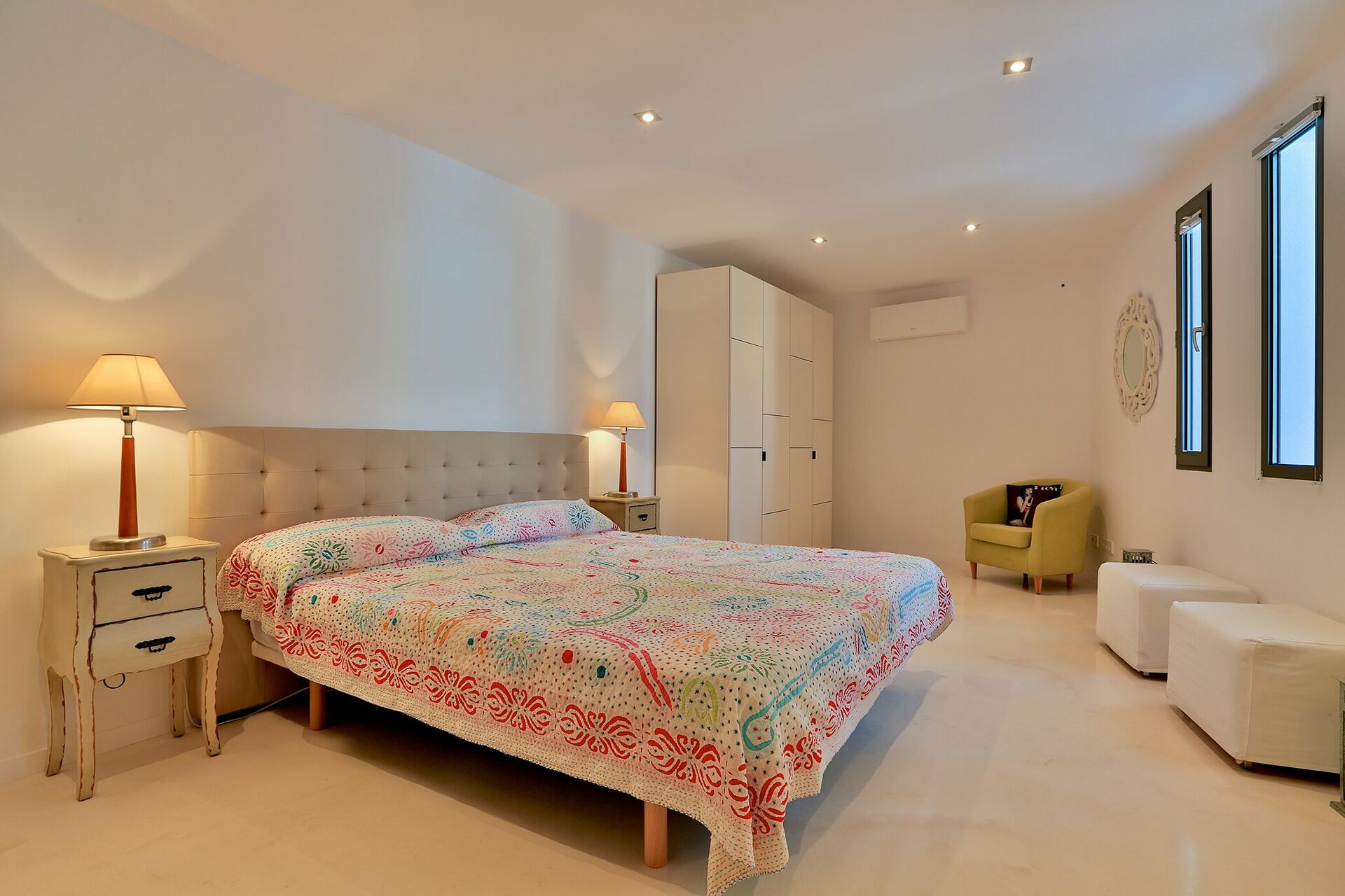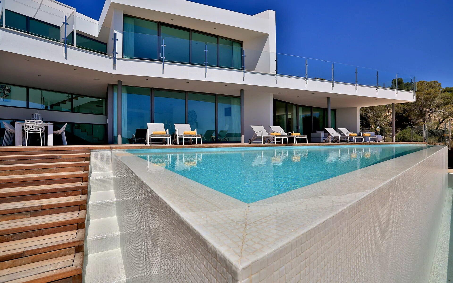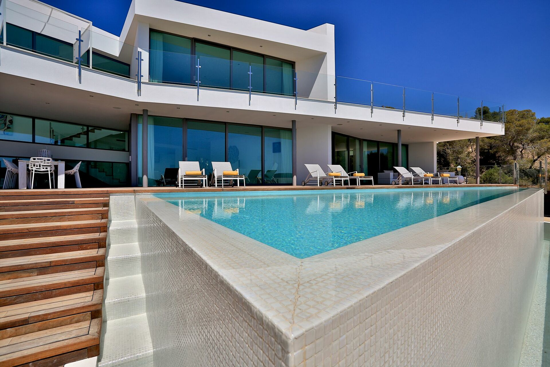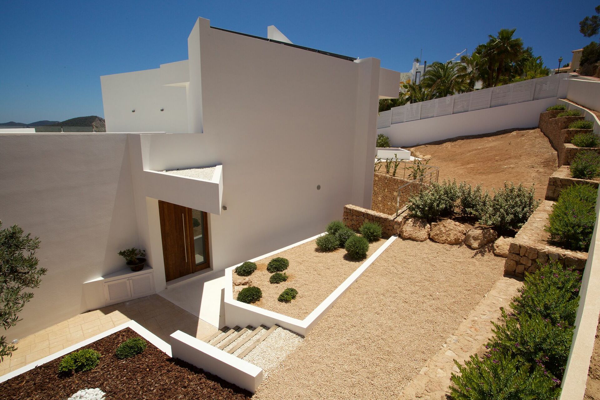 La particularité d’ Alegre Villa sont certainement ses extérieurs caractérisés par de grandes terrasses qui donnent sur la nature environnante et des quelles vous pourrez jouir d’une vue magnifique et panoramique sur la mer et les eaux cristallines de Es Torrent. Une zone living à l’extérieur (petits fauteuils, tables et chaises) est le lieu idéal pour préparer déjeuners, dîners et apéritifs entre amis ou avec votre famille.