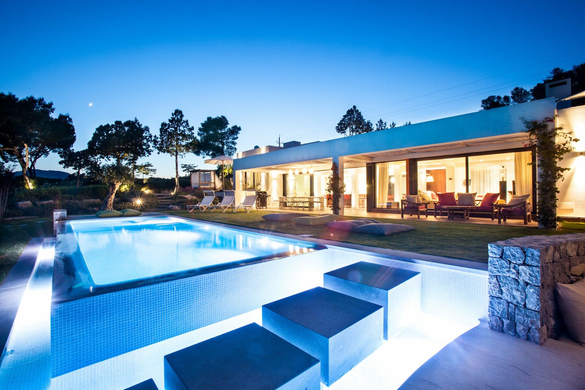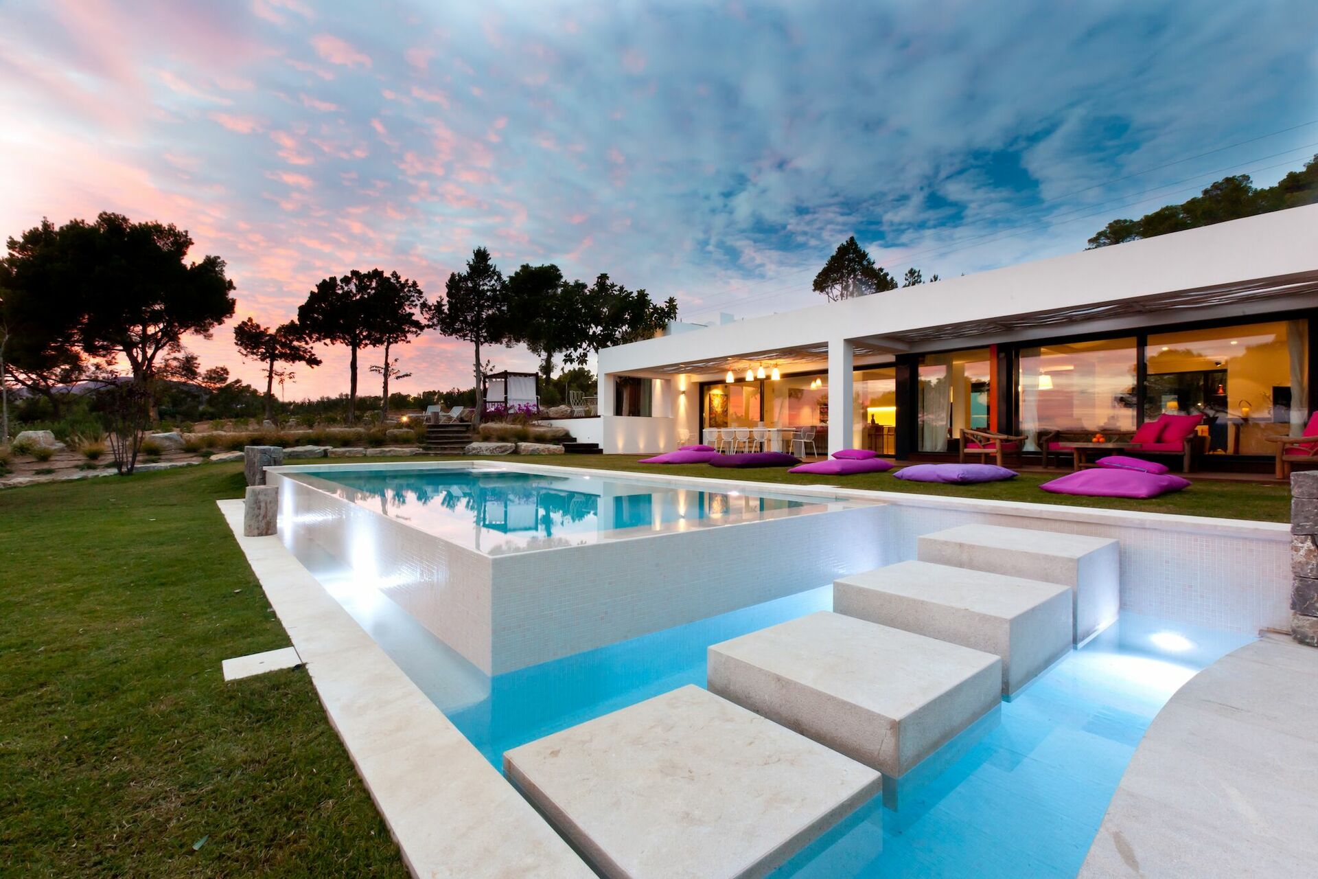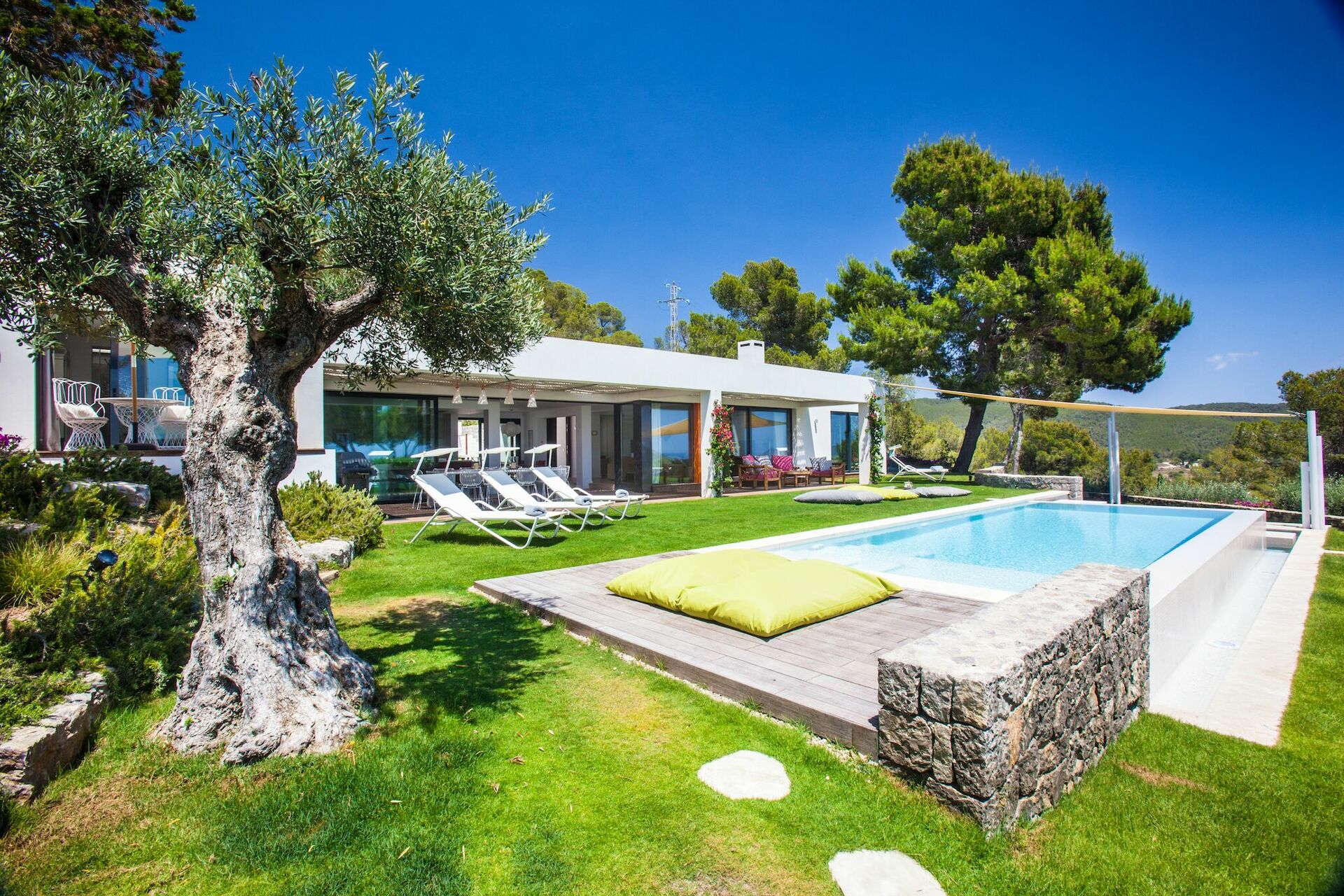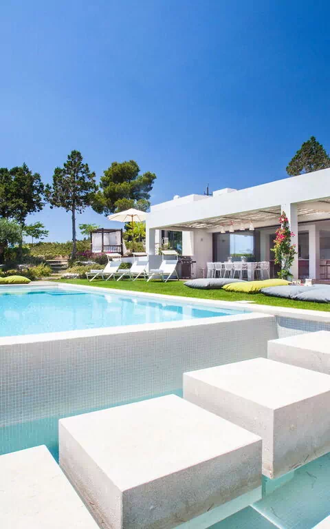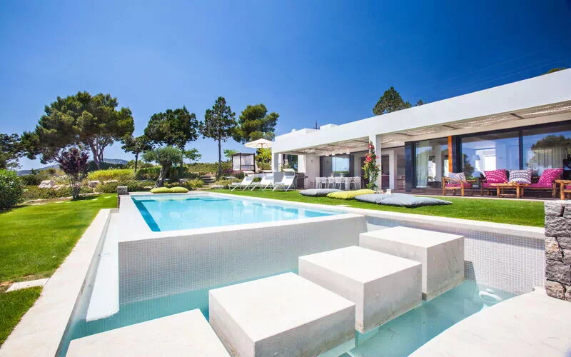 Très belle villa de vacances en location sur l’île d’Ibiza, à quelques kilomètres des magnifiques plages de sables et de la mer cristalline.