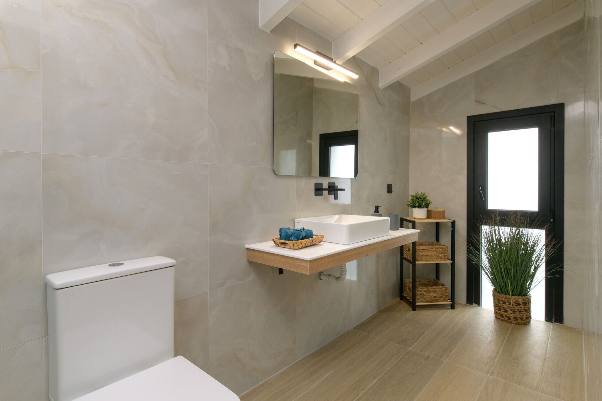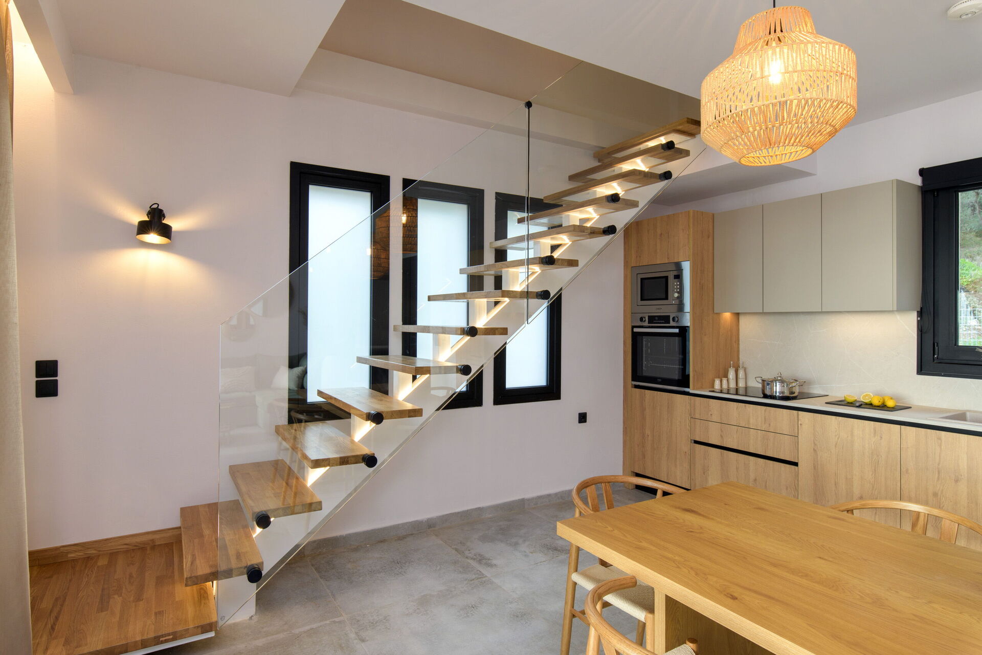 Rez-de-chaussée: espace de vie composé d’un salon avec coin repas et cuisine (four, congélateur, lave-vaisselle, machine à café expresso), chambre double avec salle de bain privée avec douche, chambre double avec salle de bain privée avec douche.