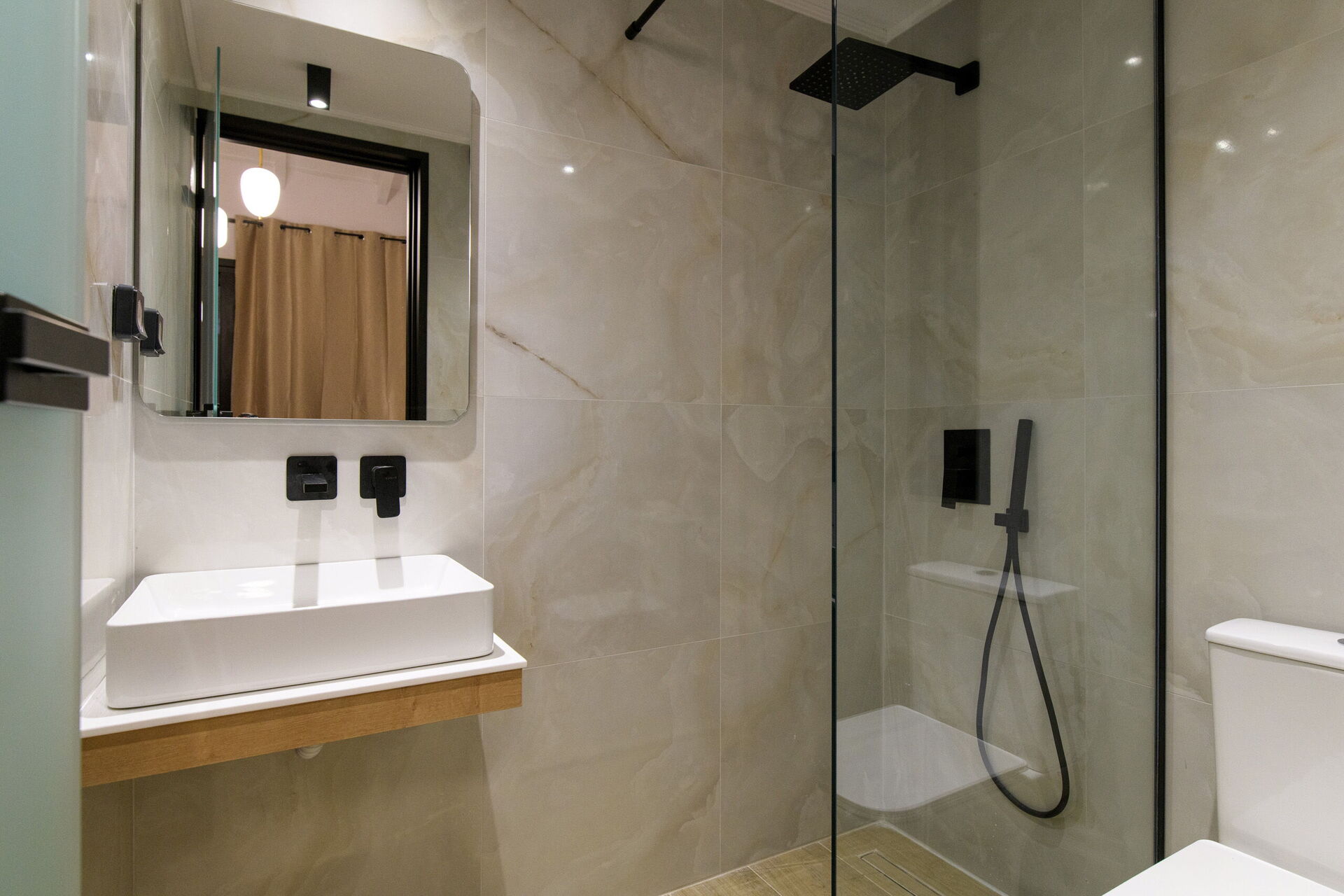 Premier étage: chambre double avec salle de bain privée avec douche et accès à un balcon.