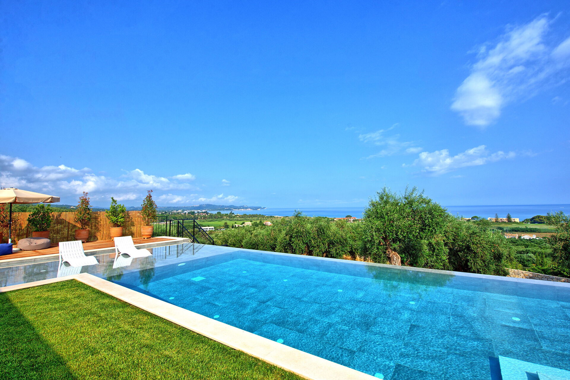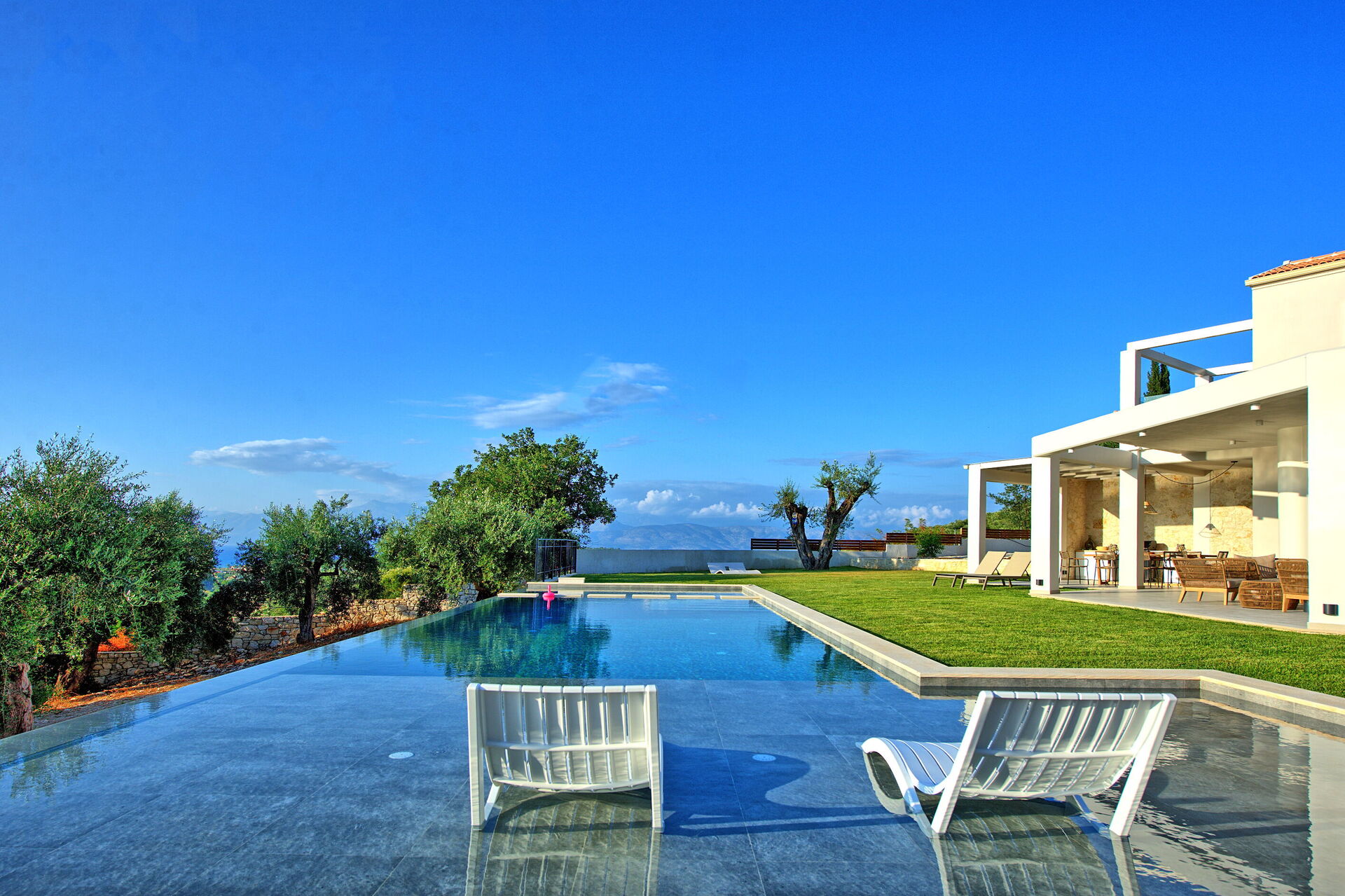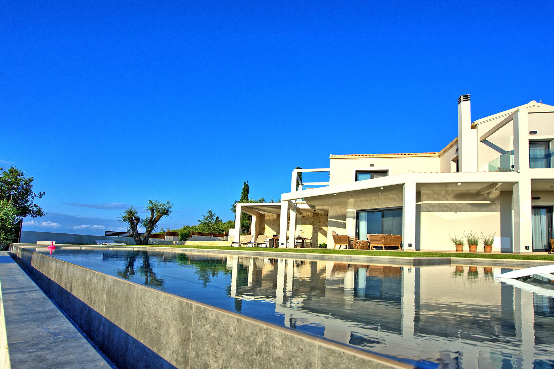 Belle villa de luxe avec fantastique piscine privée et vue panoramique sur la mer à Corfou entre Kassiopi et Acharavi.