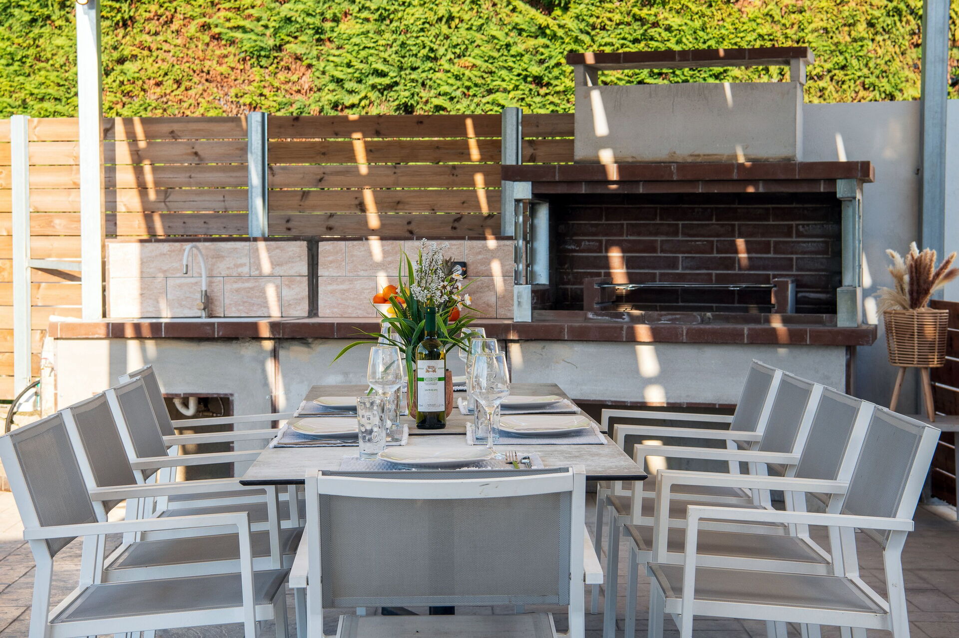 - espace extérieur aménagé avec barbecue, table et chaises pour manger en plein air