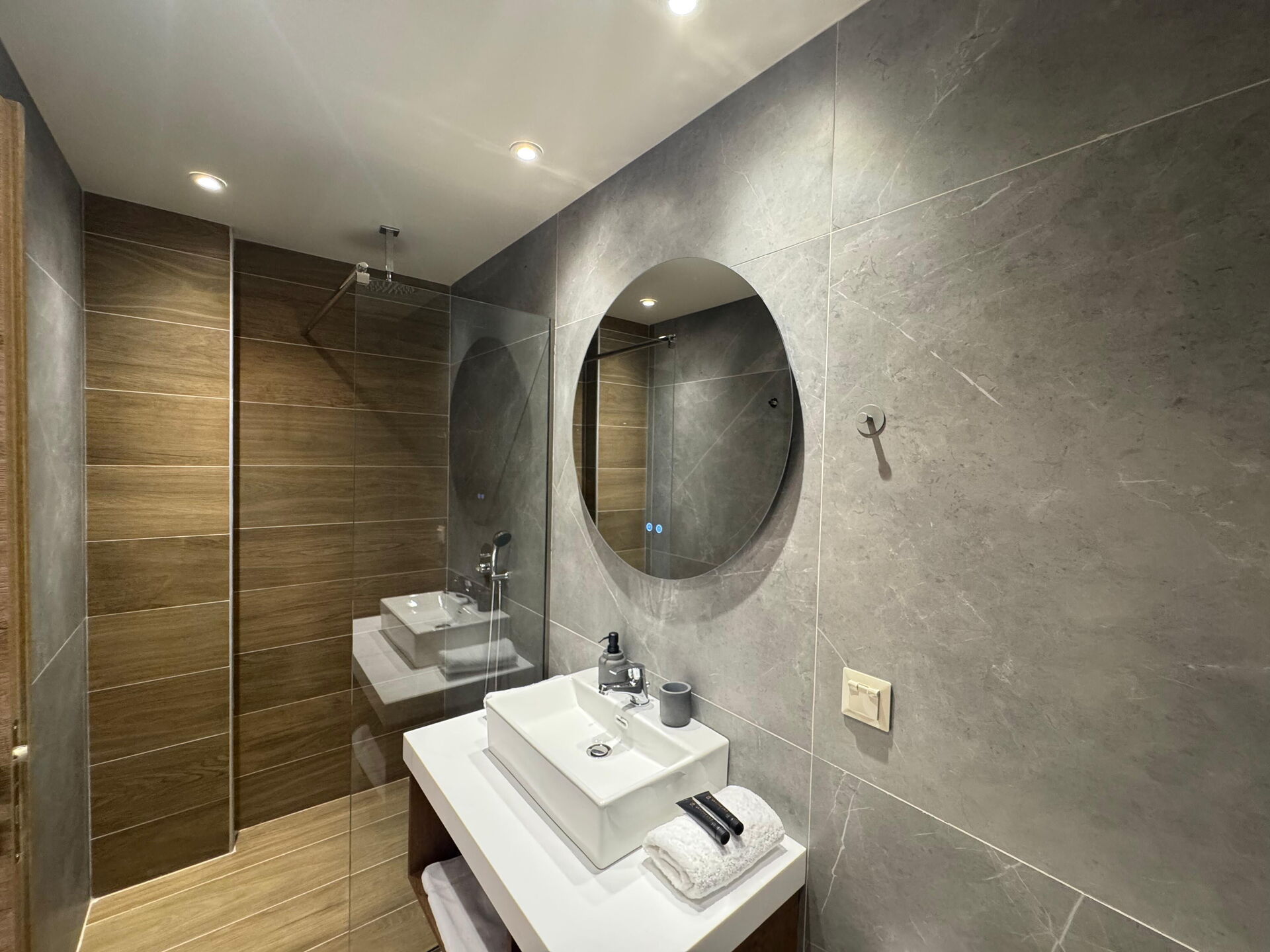Premier étage 2 chambres avec salle de bains privée avec douche, une chambre avec 2 lits à une place (unis sur demande) et salle de bains privée avec douche.