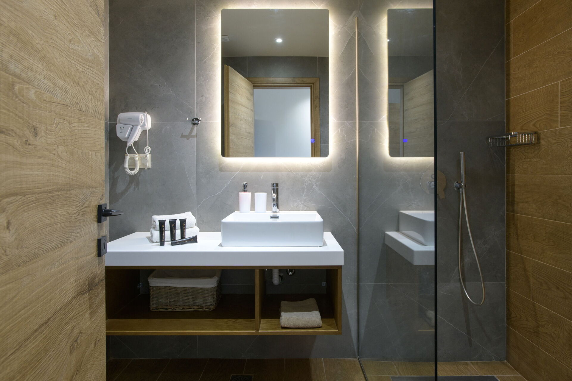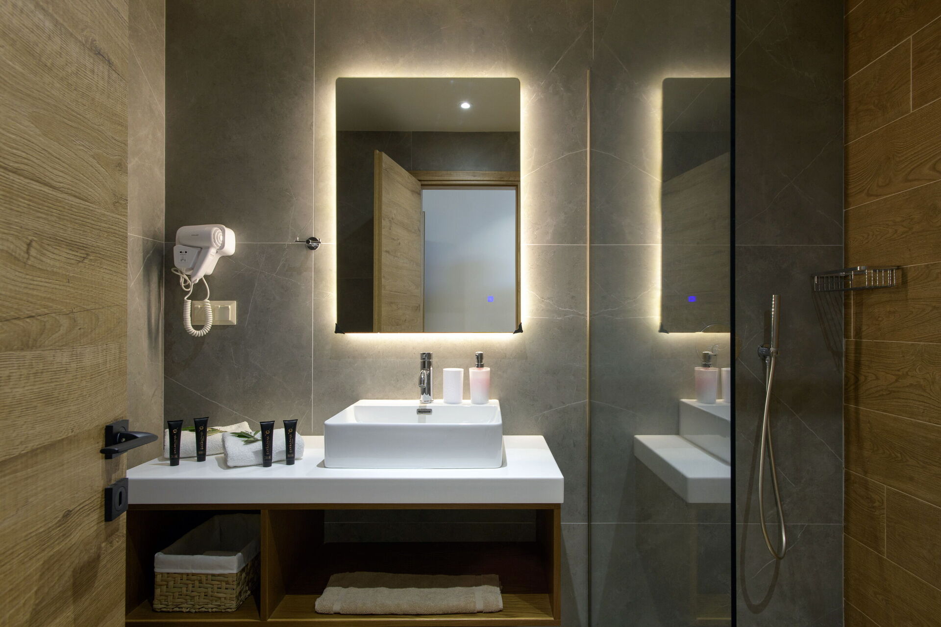 Rez-de-chaussée : partie jour avec séjour (smart TV), zone repas et cuisine (four, freezer, lave-vaisselle, micro-ondes, grille-pain, bouilloire et cafetière), WC, 2 chambres avec salle de bains privée avec douche, une chambre avec 2 lits à une place (unis sur demande) et salle de bains privée avec douche.