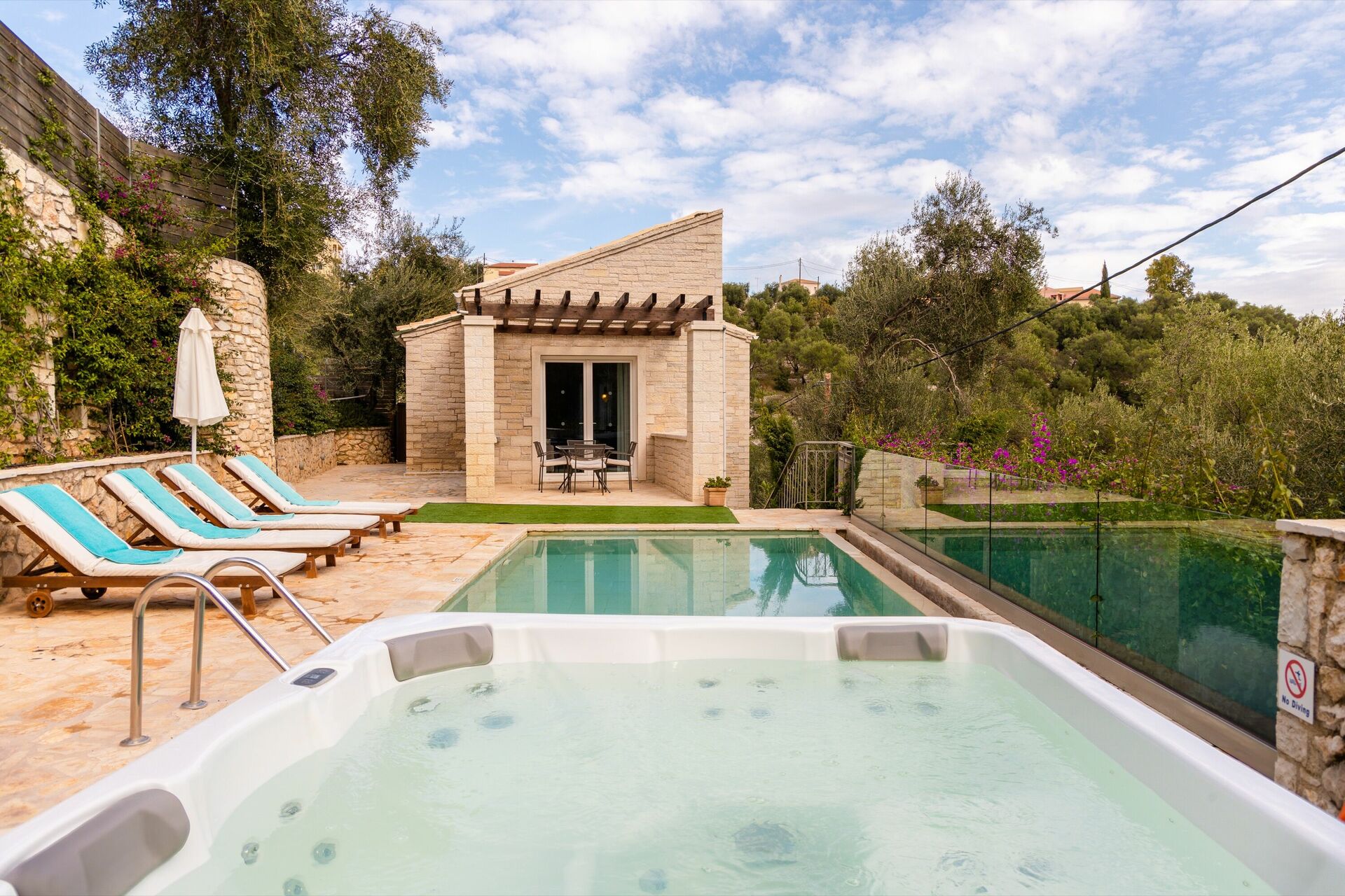 This villa is gorgeous. We loved the walking path through the old olive trees down to the beach. The pool was very refreshing. The hot tub is nice but it only gets lukewarm, which was ok but if you are used to a HOT tub you may be disappointed. The house has stunning views and nice spaces to enjoy.