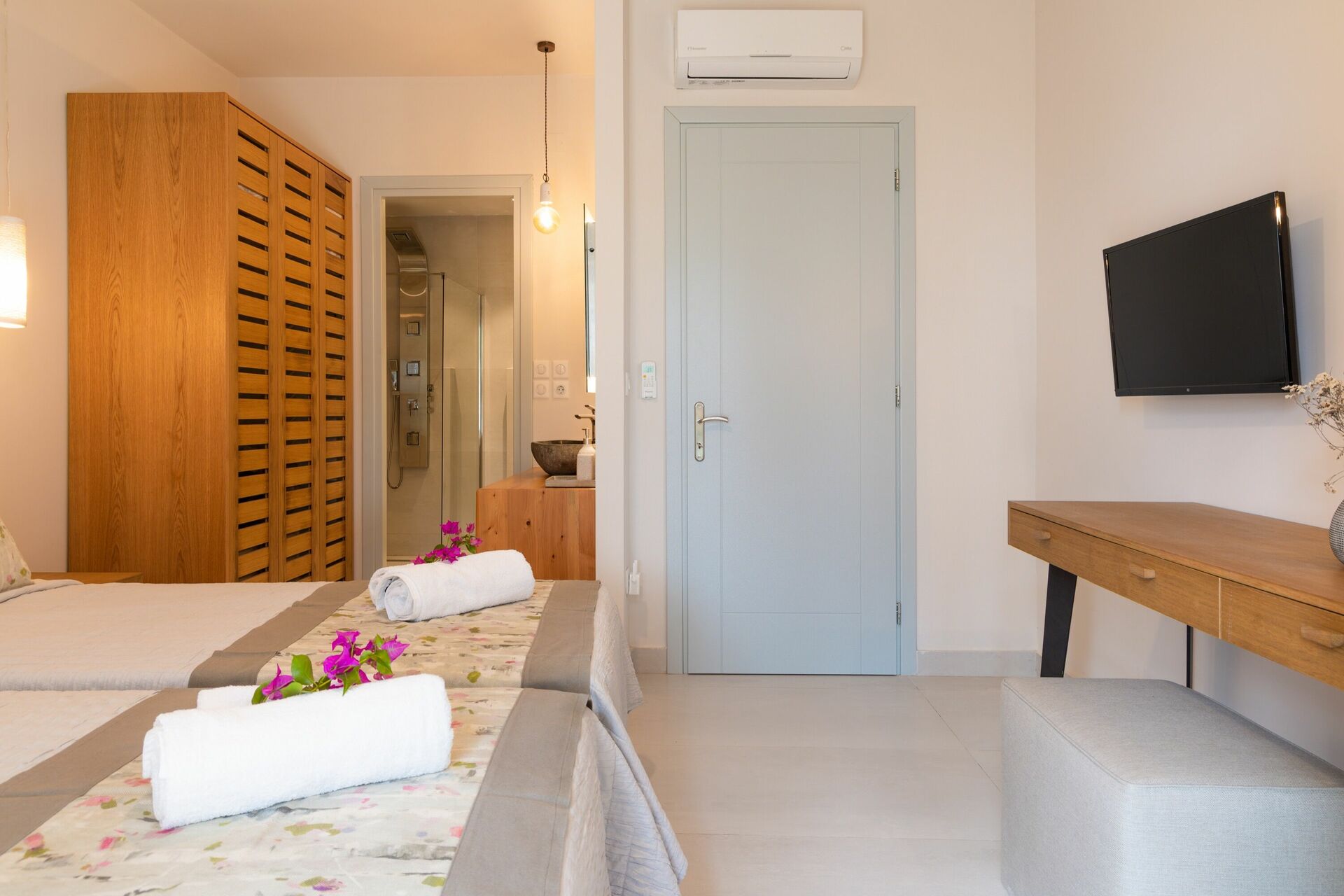- 2 chambres à coucher chacune avec une salle de bain privée avec douche