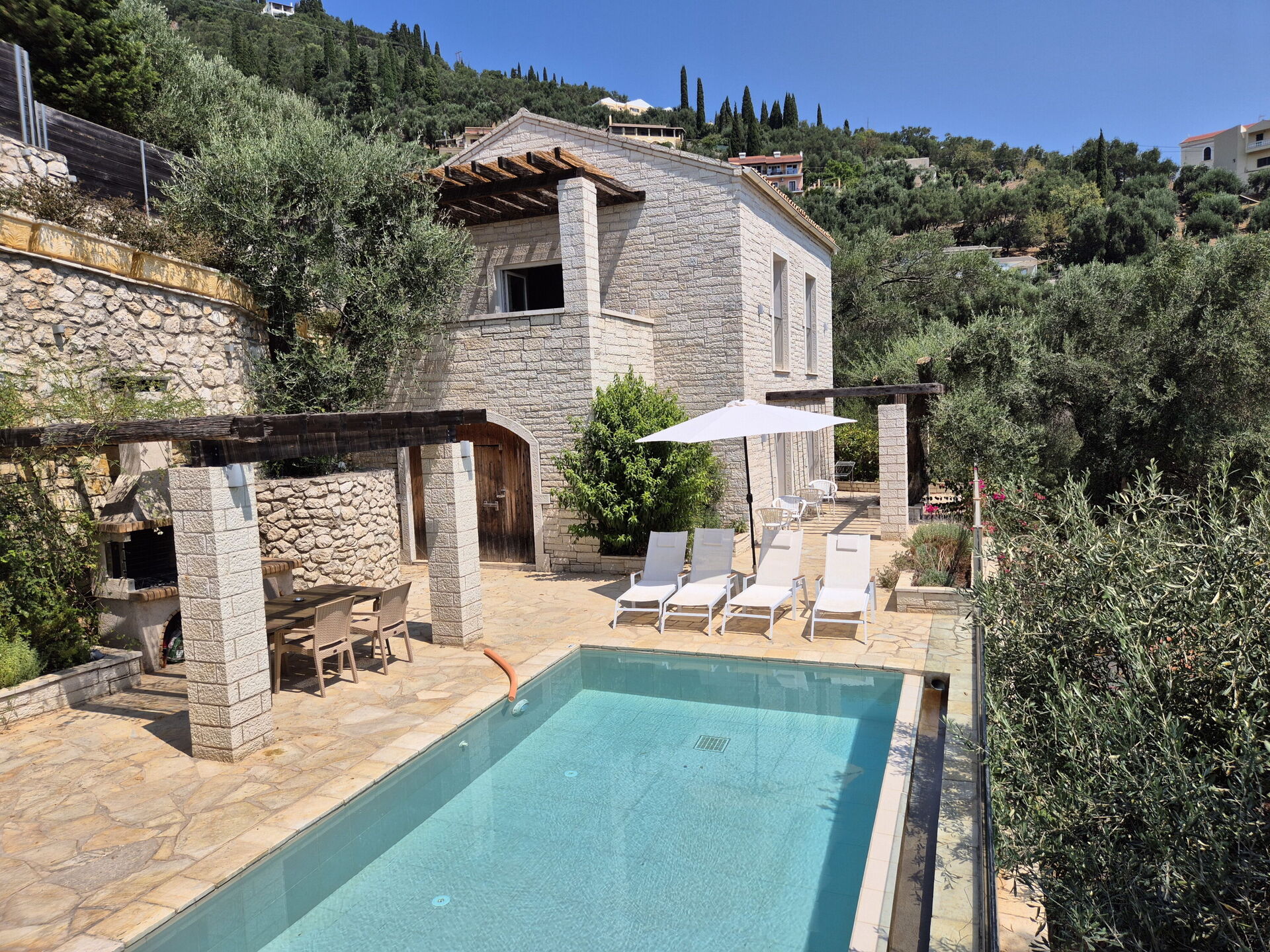 A lovely villa in a secluded, quiet location. The sun moves from the pool area around 5pm in the afternoon. The pool area is accessible from the bedrooms so if you want to eat by the pool then you need to take the food downstairs. But there is an upstairs balcony with a table and chairs to eat outside directly from the living room. If you want to use the dying rack for wet clothes, then bring some pegs! As other reviewers have mentioned it is located up a steep hill but it is only a short distance to walk. Note that there are no shops in Agni Bay, but 3 lovely tavernas - they need to be booked ahead of time
