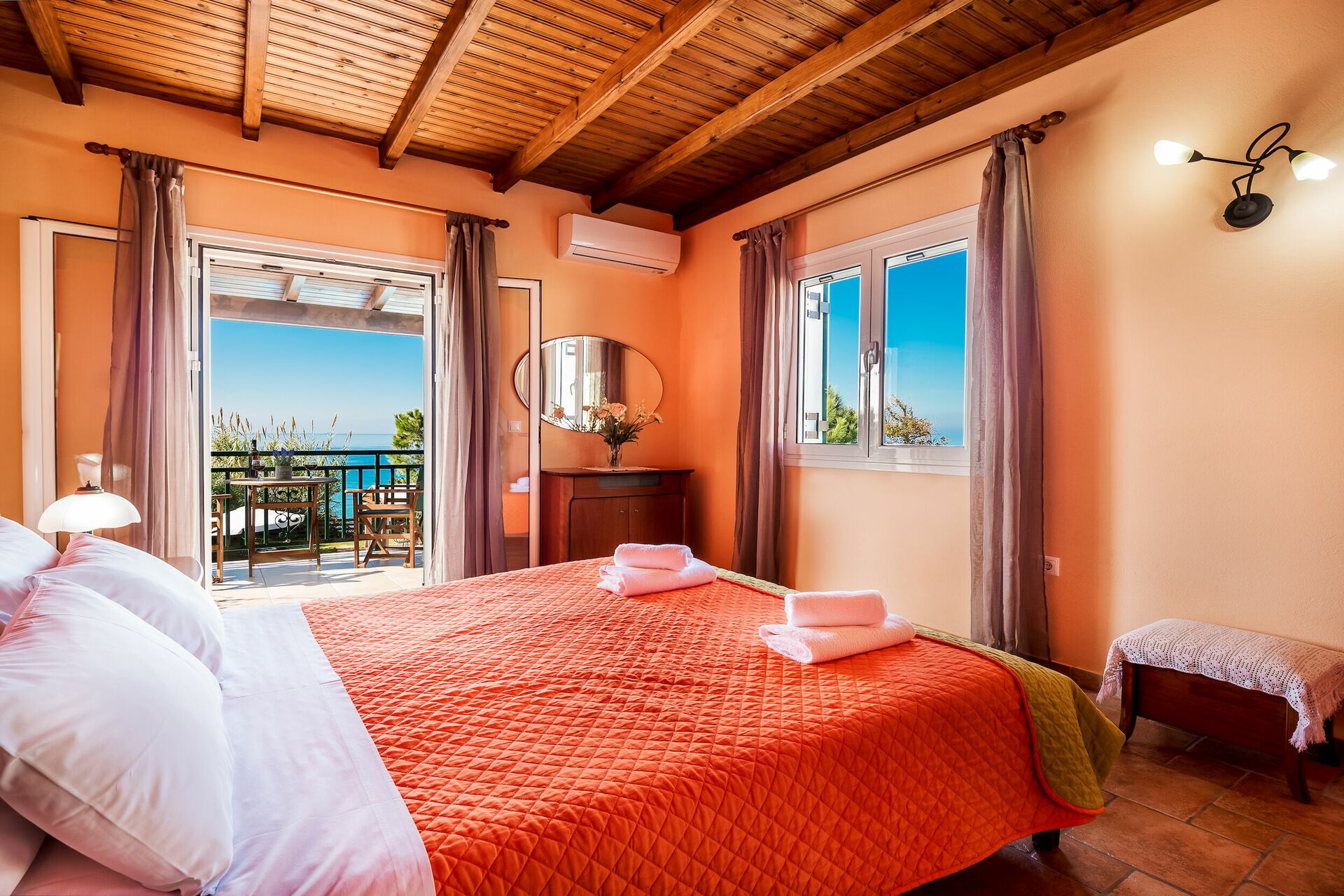 Villa Rania is a really nice beach house! The view was outstanding. The location is quite remote so I would recommend renting a car, ATV, motorcycle, or scooter on arrival. You will need to have an international drivers license in order to do that! You can’t drink the tap water at the house so be sure to stock up on bottled water. There is a lovely beach restaurant an easy and pleasant 20 minute walk from the house- Avra Oceanos. Food was great, sunsets amazing, staff very friendly. They let us buy bottled water and wine to take back to the house each night. There is another villa very close, one on each side, and depending on neighbors you may have to deal with noise and less privacy. There are a little more than 5 dozen steps to get down to the beach. Worth it!! There are air conditioning units in each bedroom, and black-out shutters. The breeze during the day was amazing! Overall a really great place and I would recommend it for a nice peaceful relaxing beach vacation.