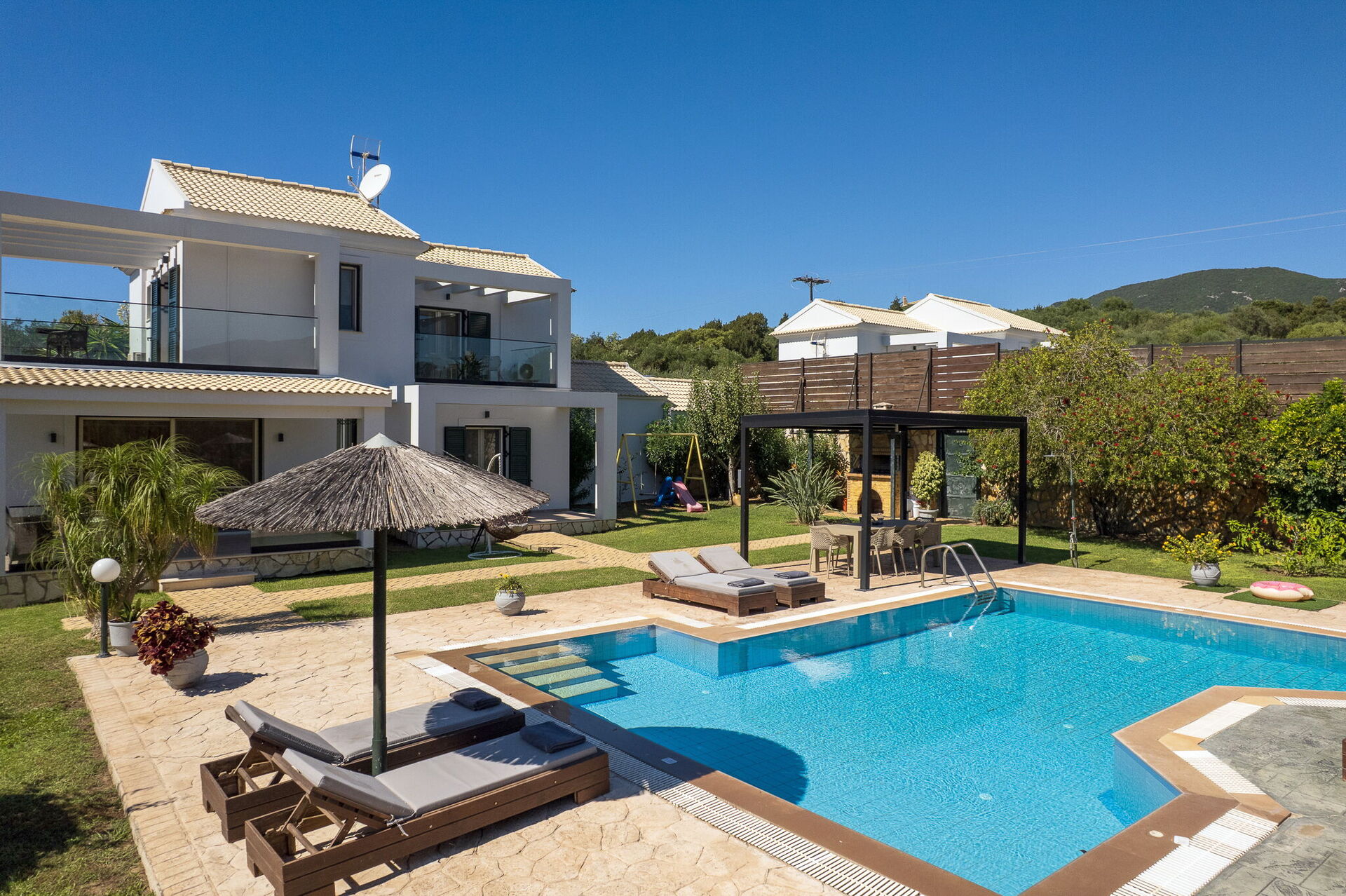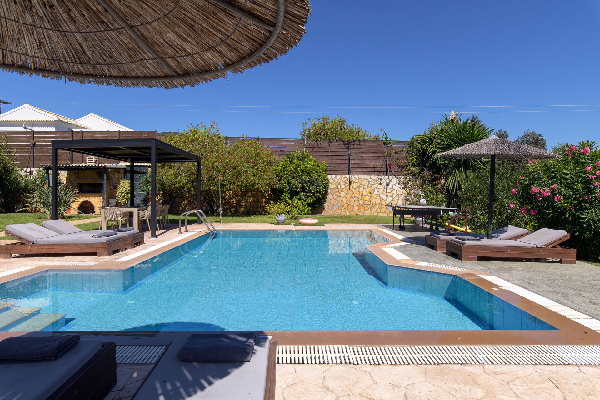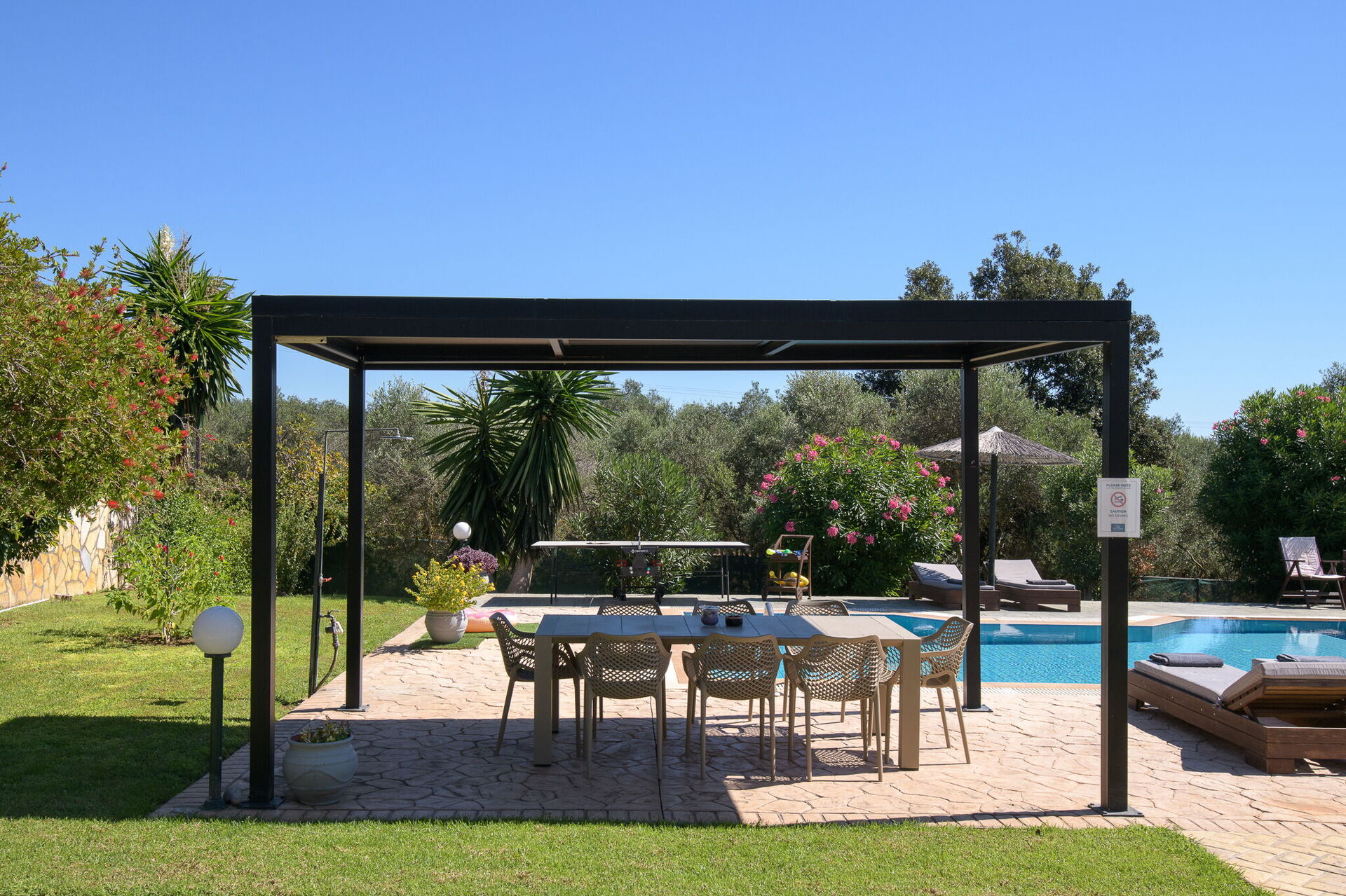 Les espaces extérieurs offrent des aires communes qui permettent aux hôtes de passer un agréable séjour en famille ou entre amis en se relaxant sous le gazebo équipé pour les repas en plein air ou dans le vaste espace piscine avec solarium, idéal pour des moments inoubliables sous le soleil de Corfou.