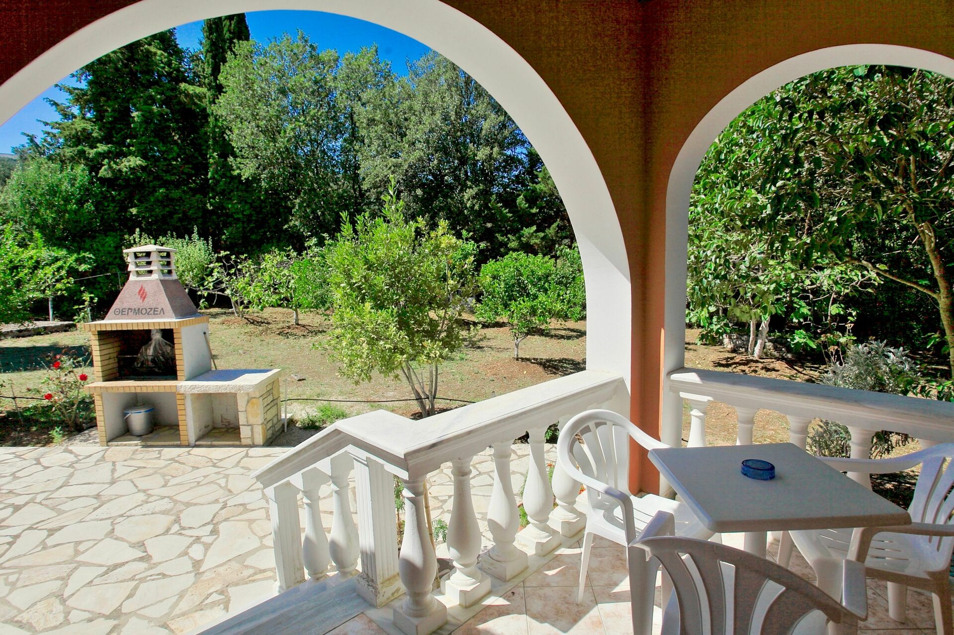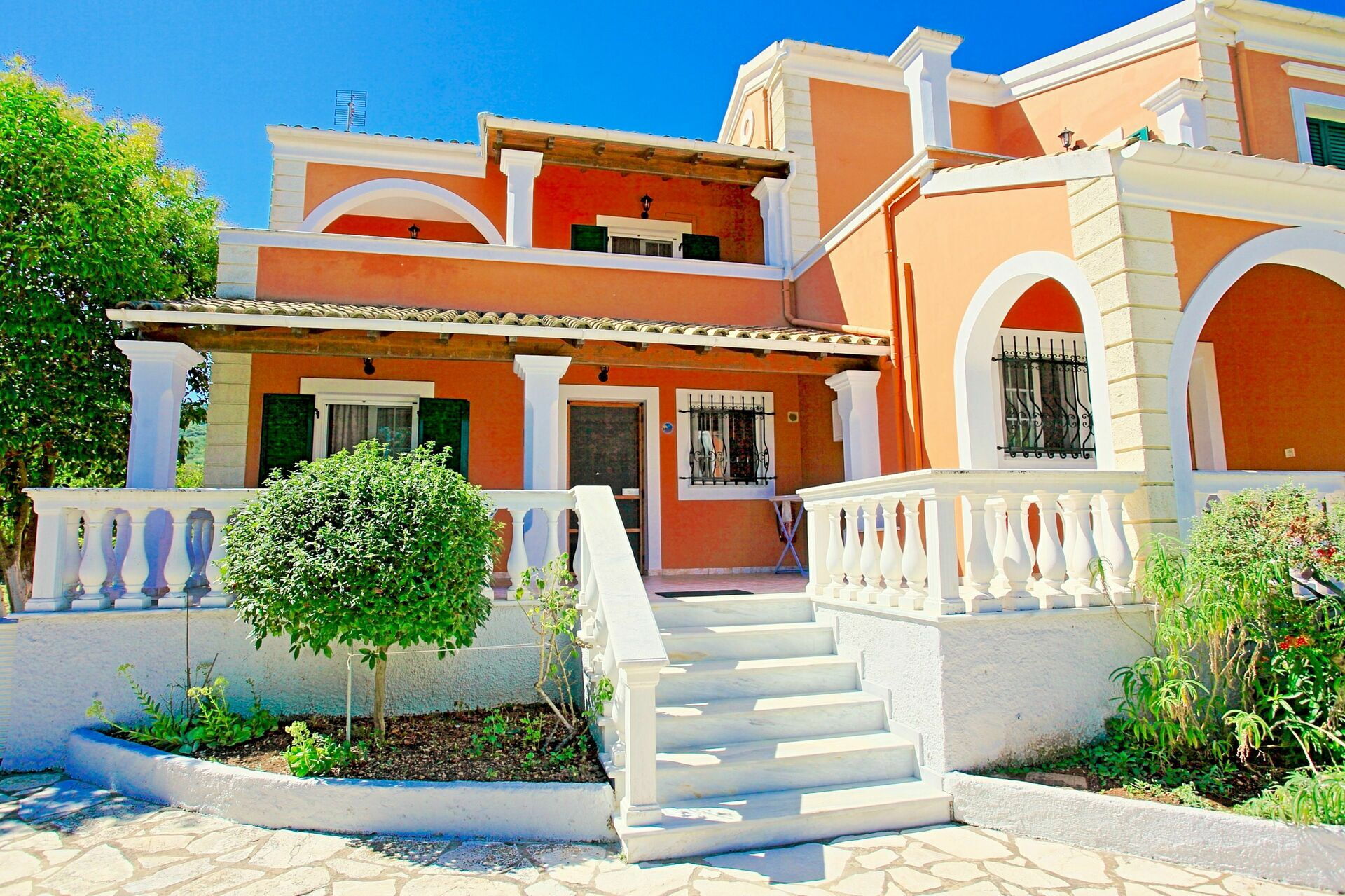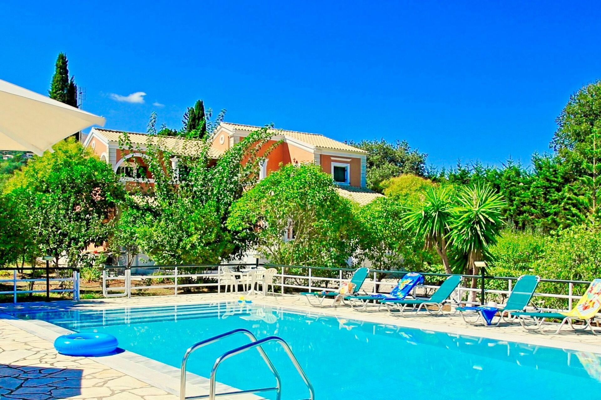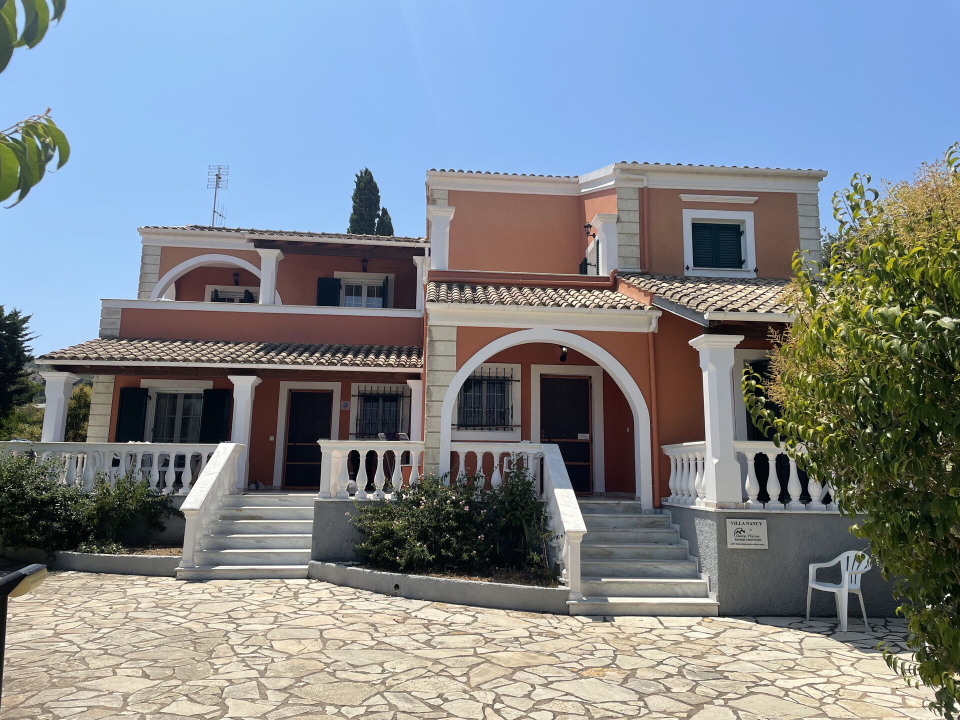 Lovely villa we stayed 19 (12 adults) in this villa the owner was so lovely and helpful his English is limited but he can phone someone to translate if needed the villa was perfect and the pool area was amazing. The shop is about 10 minutes walk but if you spend €50 they will drop you and your shopping back. Kassiopi harbour is beautiful and the beaches are fabulous (pebbles) but crystal clear water. The villa is four separate apartments all with either balcony or terrace and a bbq area which we had one night. All in all a fabulous break in a lovely villa would highly recommend"