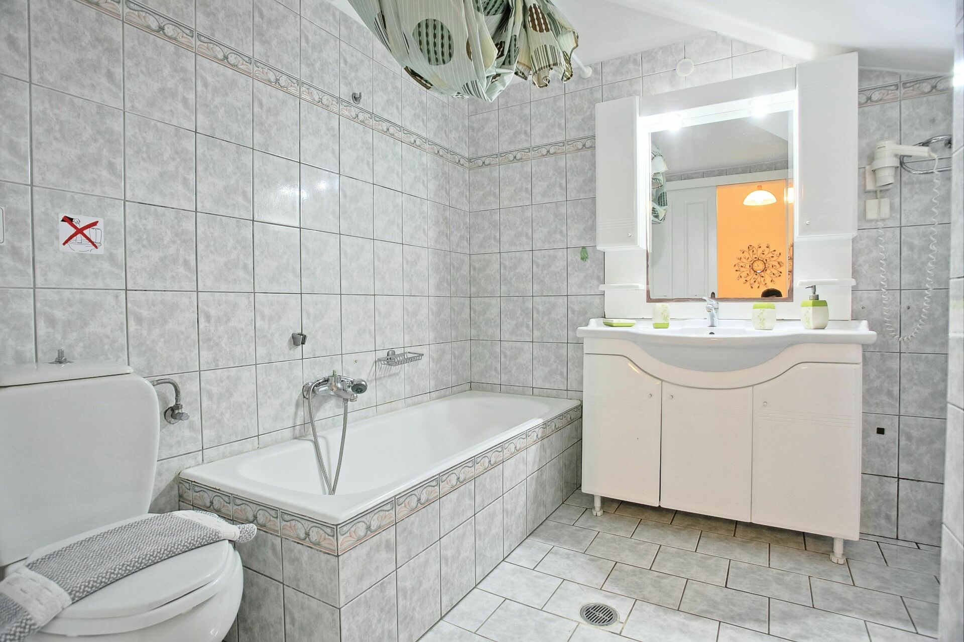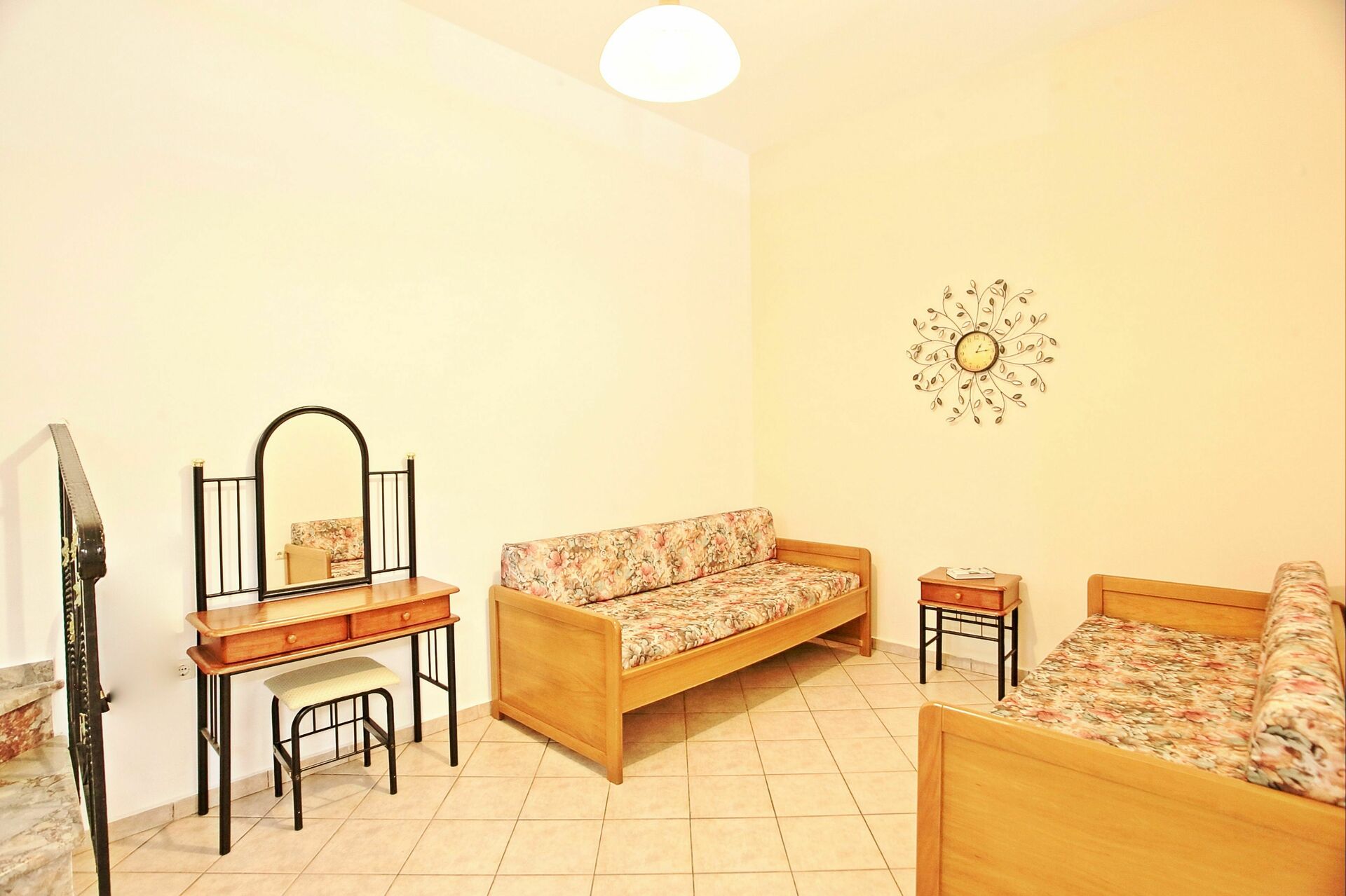 En partie au sous-sol : séjour avec 2 lits à une place/canapés, une chambre double (air conditionné), une chambre avec 2 lits à une place (air conditionné), salle de bains avec baignoire (lave-linge).