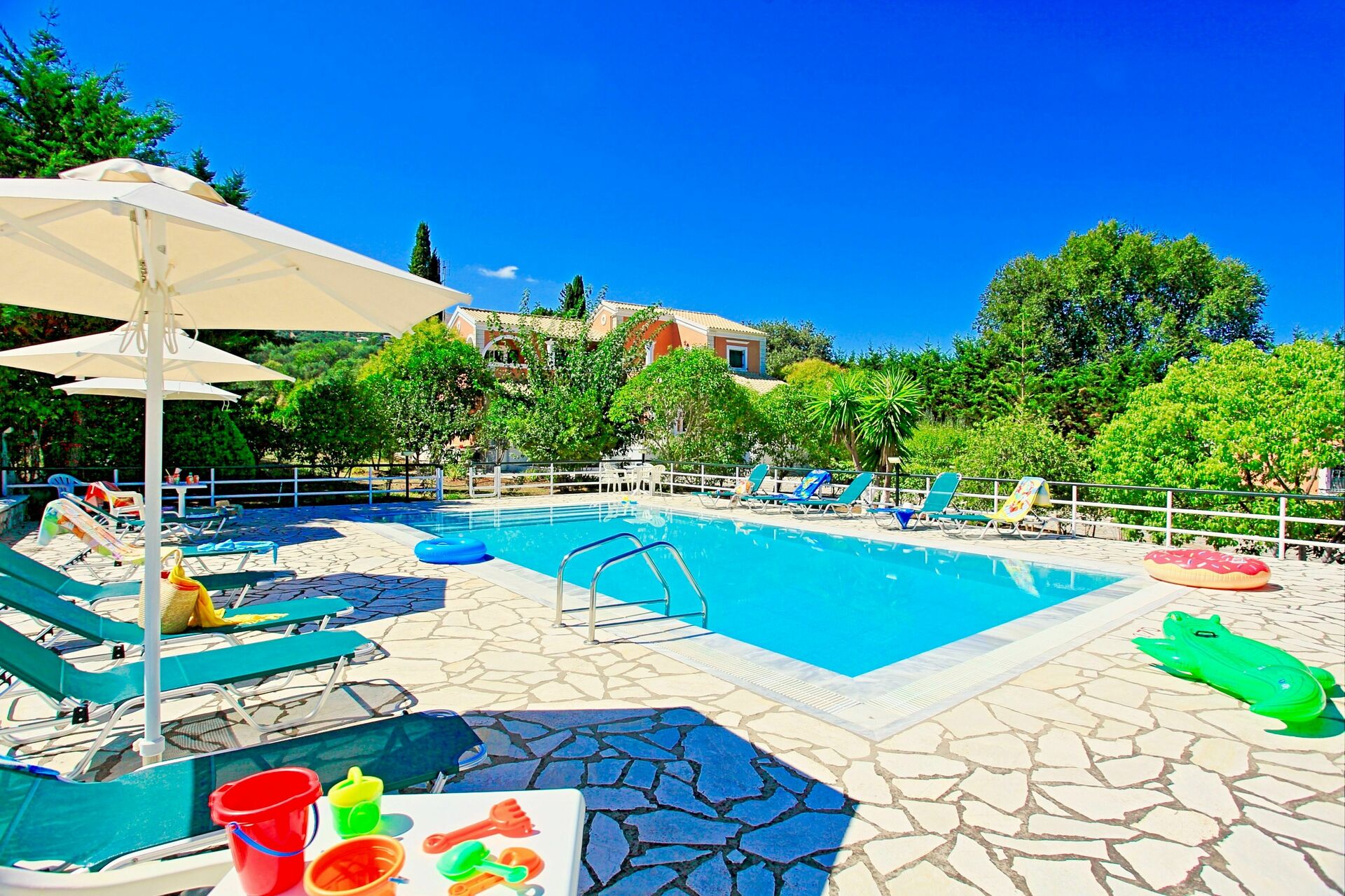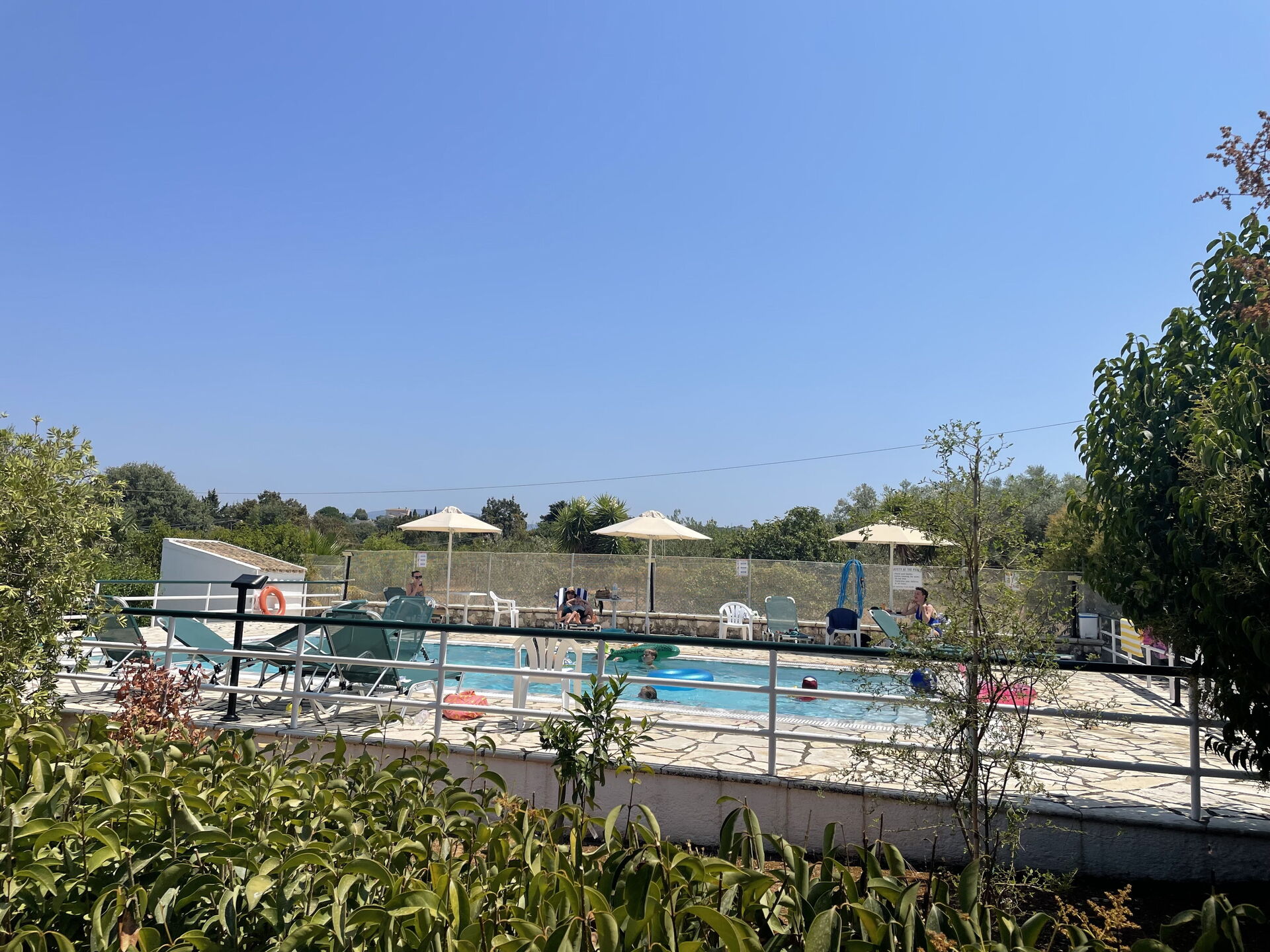 Ein Traum wurde war: wir konnten uns mit 4 befreundeten Familien einen Besitz teilen. Jeder hatte sein eigenes Apartment um sich zurückziehen zu können und doch konnten wir die Tage zusammen verbringen, alle zusammen, unter uns. Sehr gut war, dass man alles zu Fuss erreichen konnte, sodass unsere jugendlichen Kinder nicht auf uns angewiesen waren. Die Innenausstattung war nicht unser Geschmack, aber alles war sauber und funktional. Ausserdem lebt man auf Korfu ja draussen!