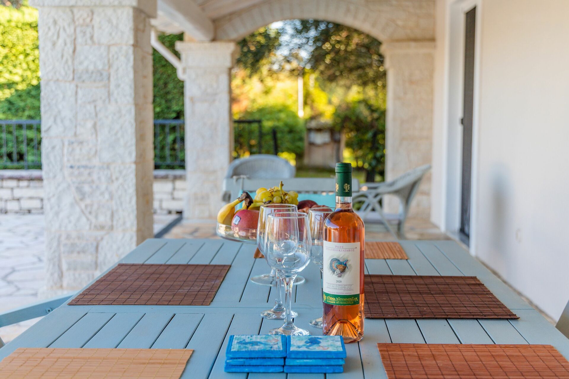 We had a wonderful stay at Villa Dimitris. The villa was perfect for us as a family of 4 ( 2 adults & 2 teenages). Beautifully equipped and clean and with such a lovely pool and grounds around it (olive trees, flowers, fig trees) the outside terrace areas were perfect for alfresco dining and sheltering from the heat. Eleni was the perfect host, she is so lovely and helpful and made us very welcome, she made things so easy for us and even drove us to Kassiopi one morning. Highly recommend the two tavernas at Avlaki, which is only about 5 minutes walk. The boat hire is also great at Avlaki, Toni was very helpful snd we had a wonderful day exploring the coastline. Kassiopi is a 20 minute walk and there are plenty of restaurants, we also got the Cosmos boat to Corfu Town from there, a brilliant day out. The village shop was 10 minute walk from the villa.