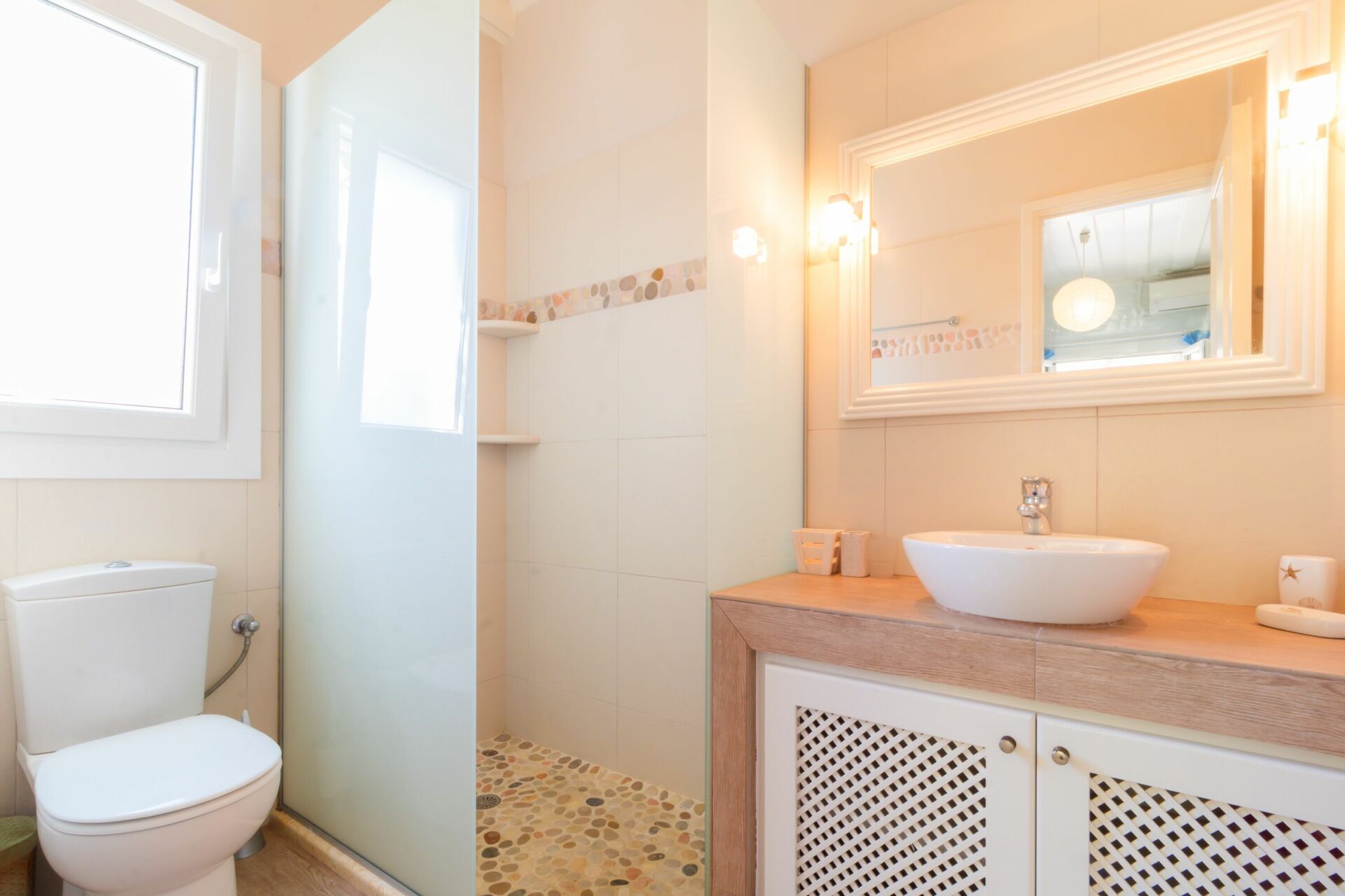 Rez-de-chaussée: grand espace de vie avec cuisine (lave-vaisselle, micro-ondes, four, plaque de cuisson), salle à manger et salon, chambre principale avec salle de bain attenante avec douche et accès direct au patio, deux chambres à coucher avec 2 single lits jumeaux communiquant avec le patio, salle de bain avec douche, salle de bain avec douche et machine à laver.