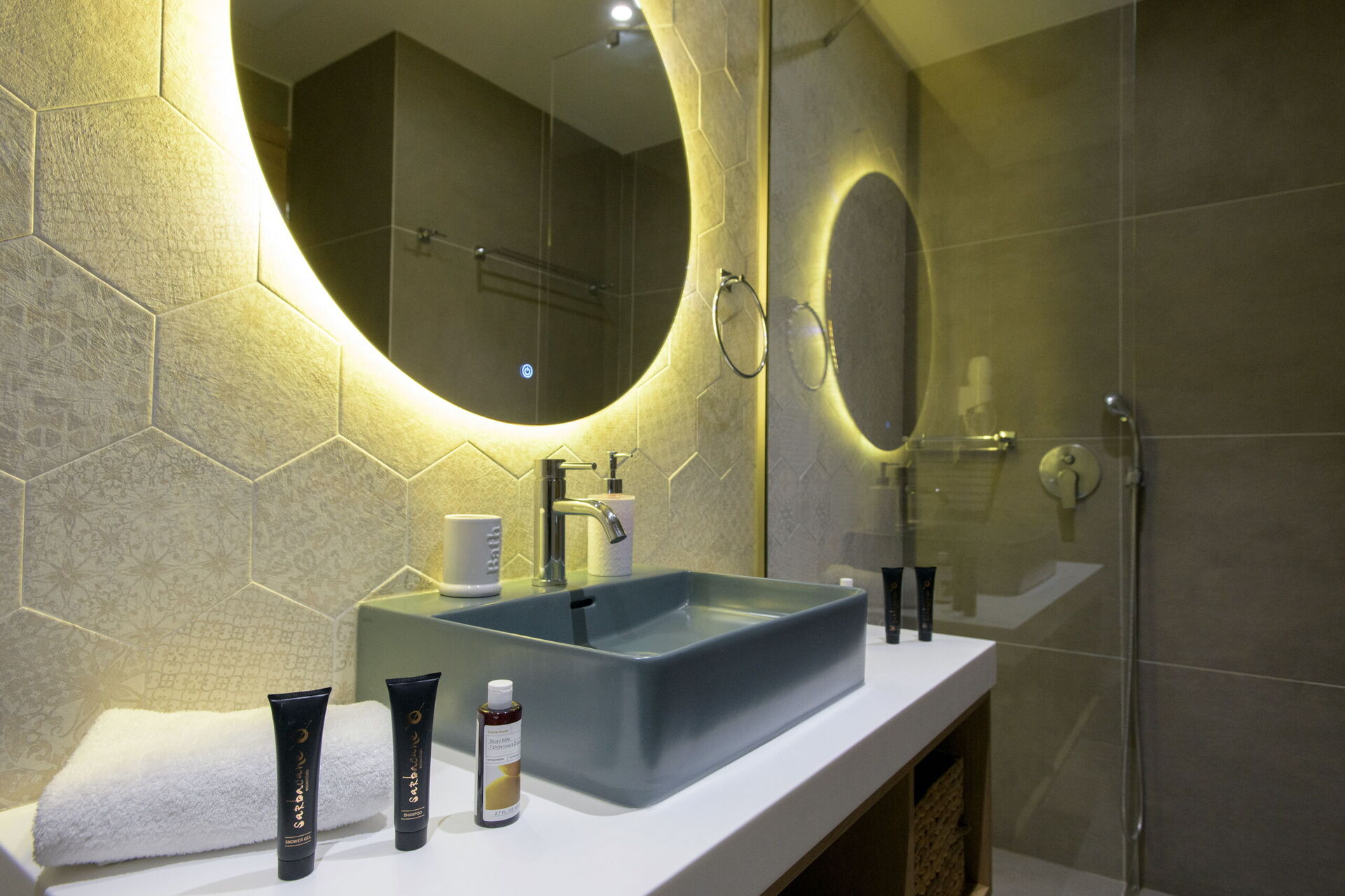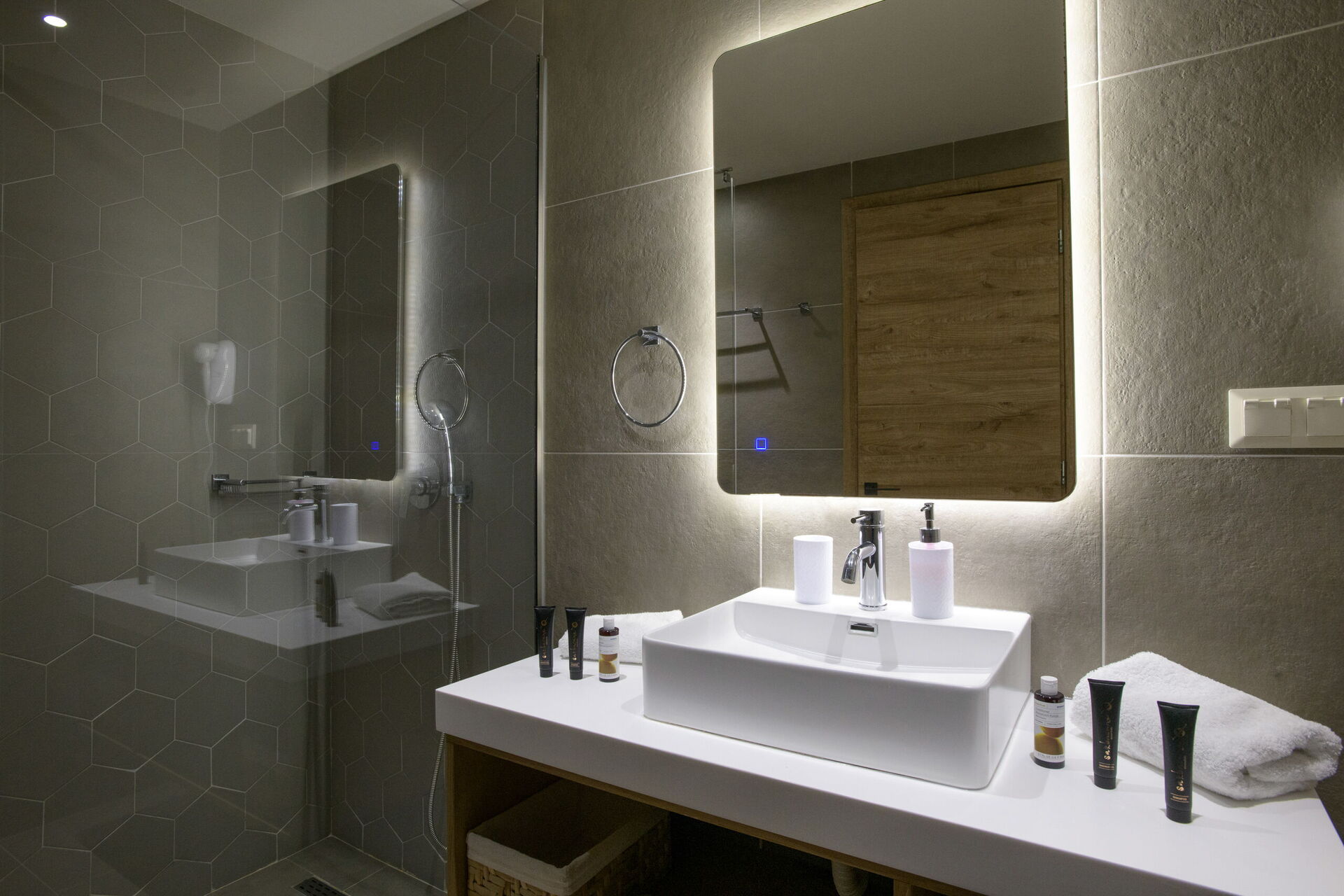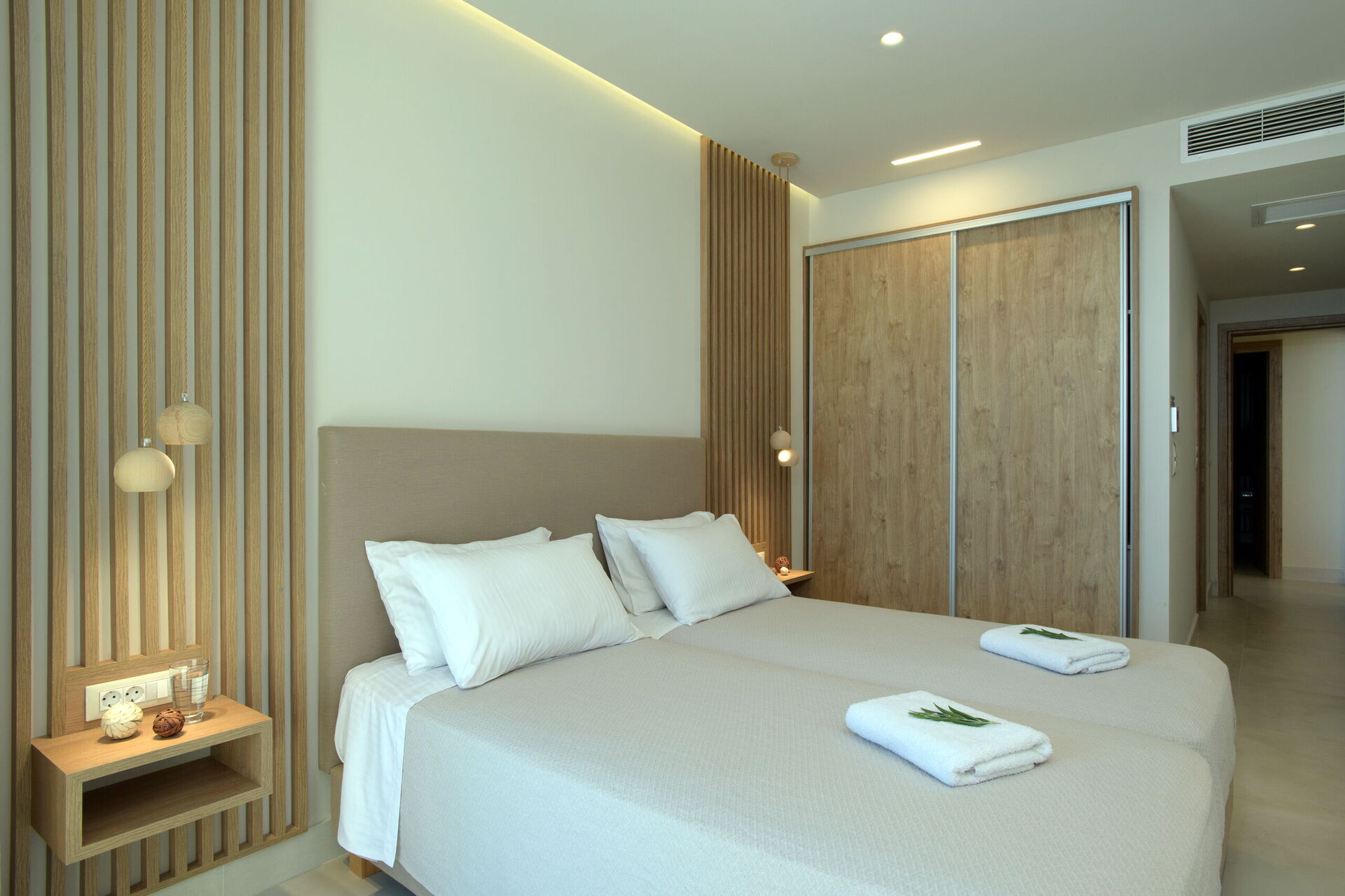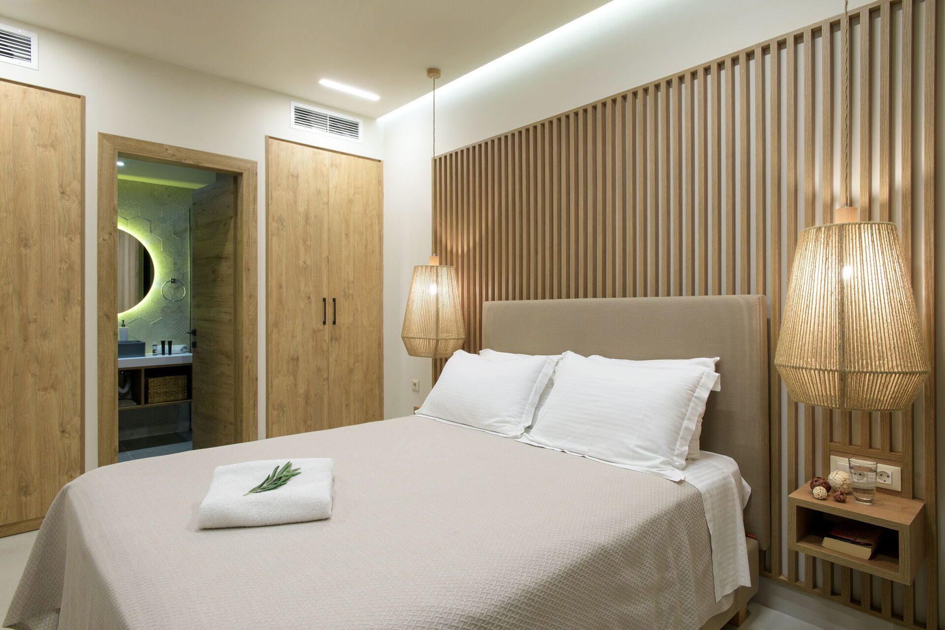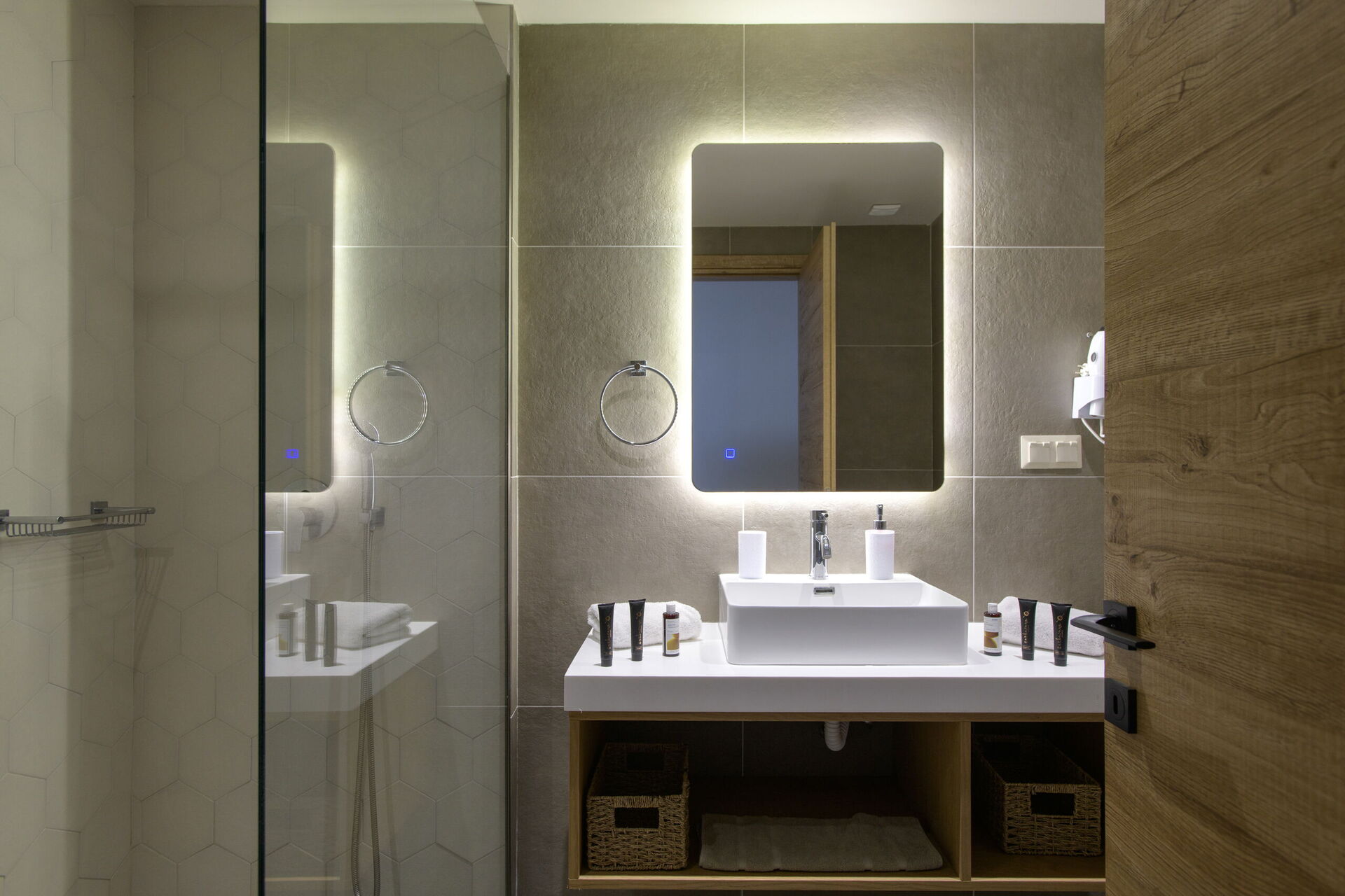 Rez-de-chaussée : partie jour avec séjour (smart TV), zone repas et cuisine (four, freezer, lave-vaisselle, micro-ondes, grille-pain, bouilloire et cafetière), WC, 2 chambres avec salle de bains privée avec douche, une chambre avec 2 lits à une place (unis sur demande) et salle de bains privée avec douche.