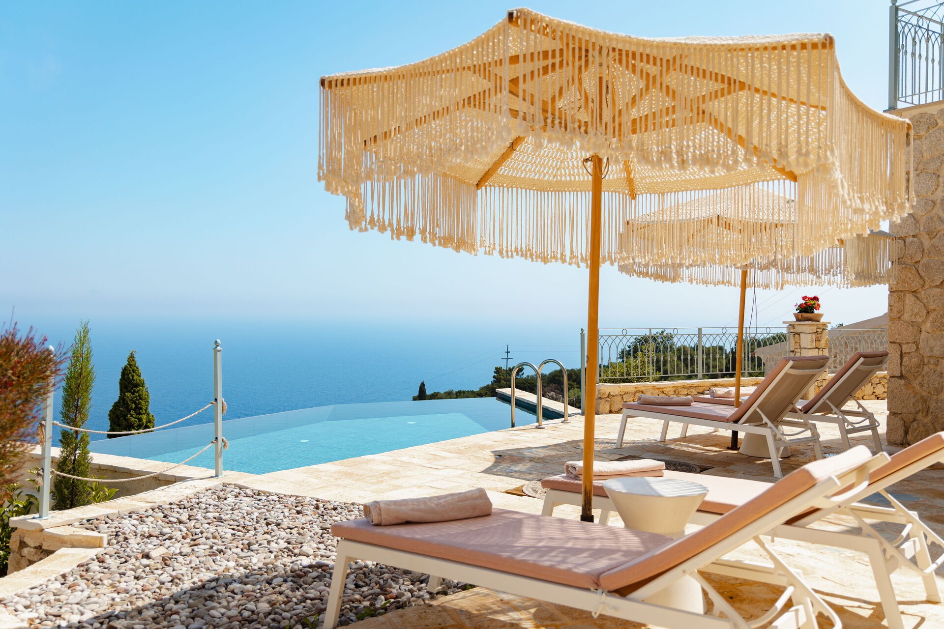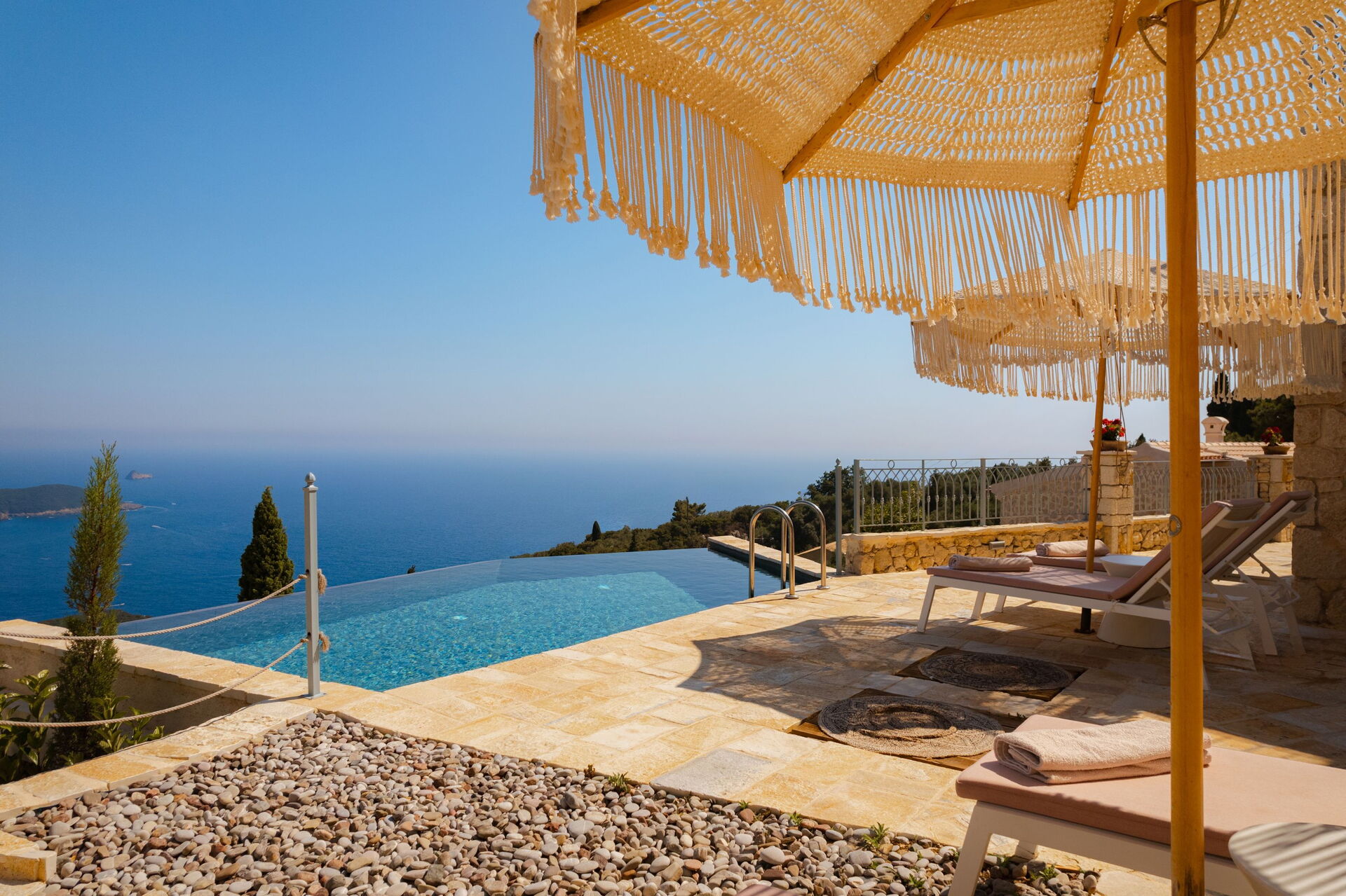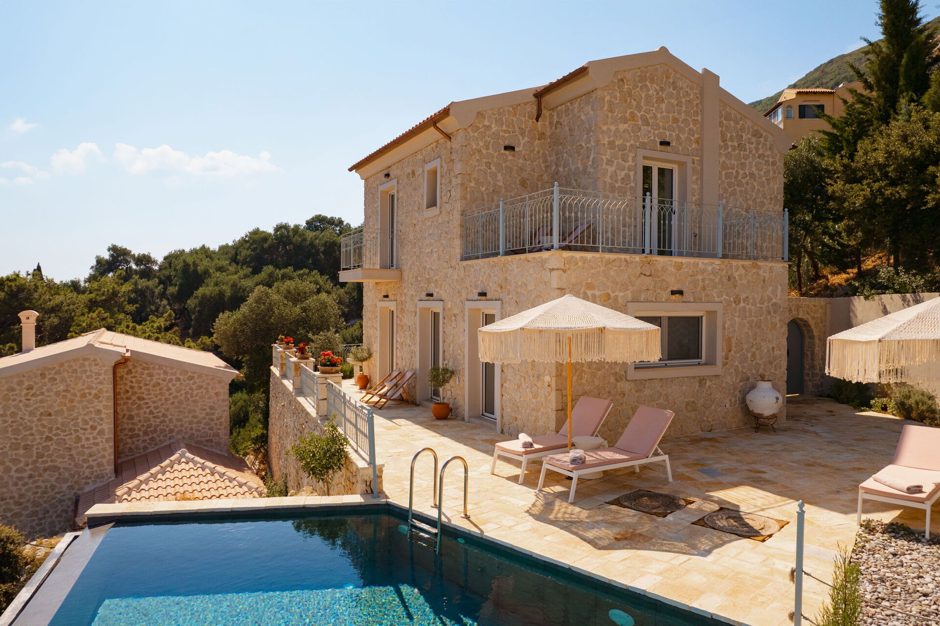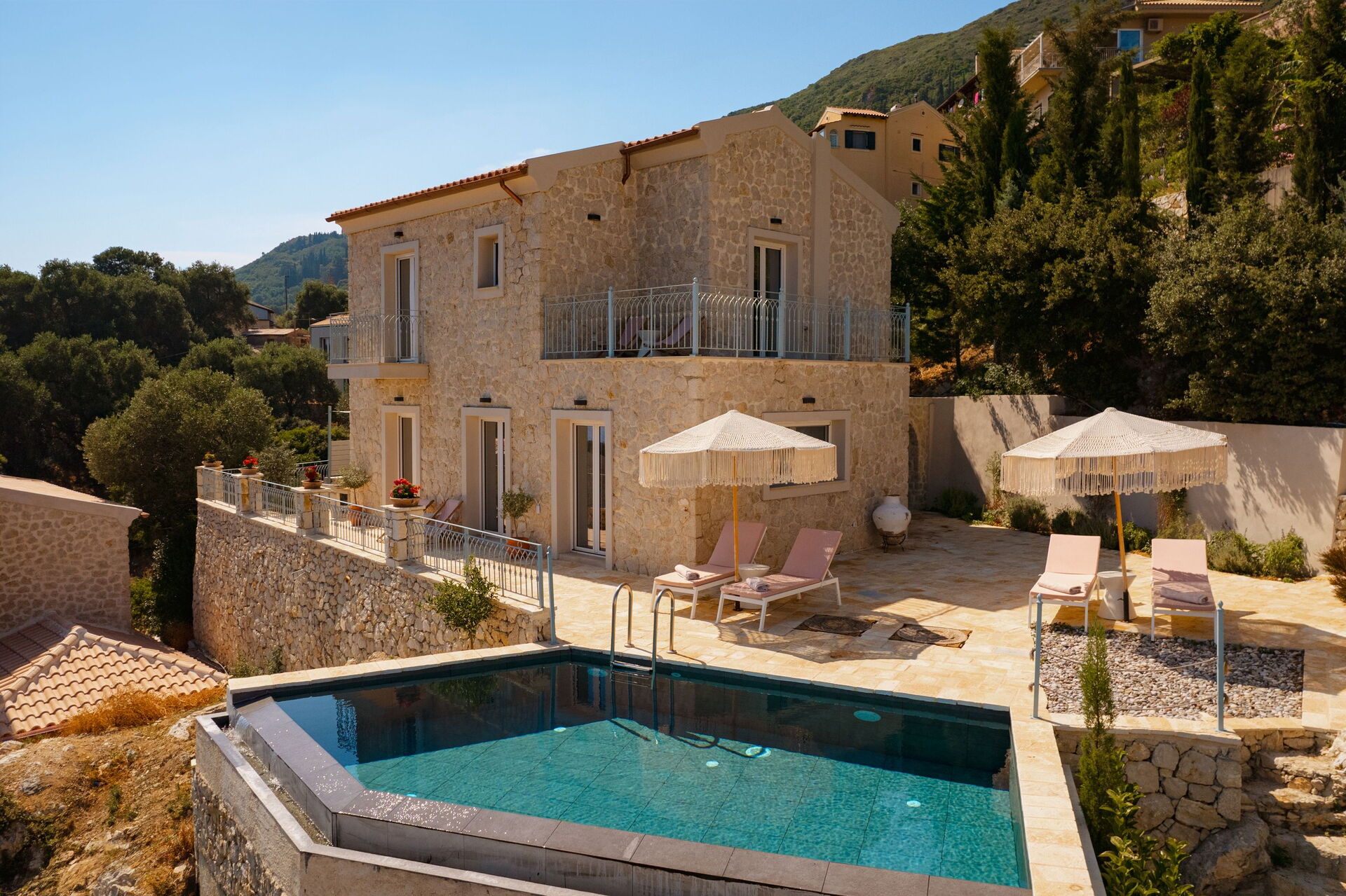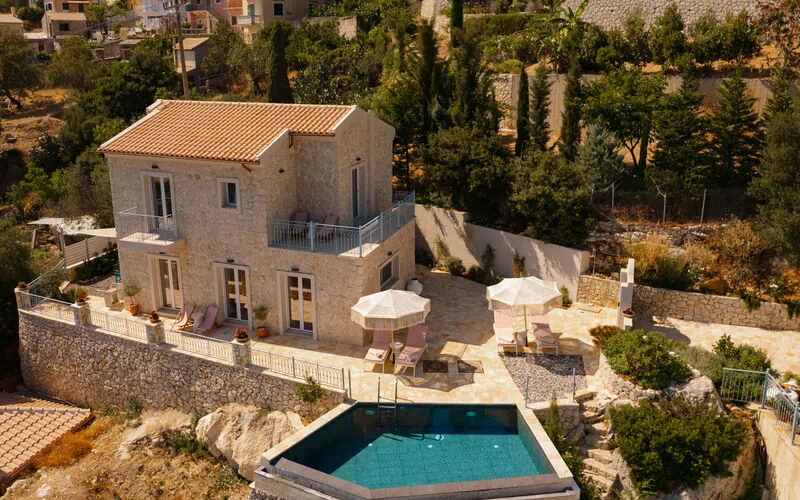 Un espace extérieur panoramique abrite une belle piscine privée et un solarium pour profiter des journées ensoleillées de Corfou.