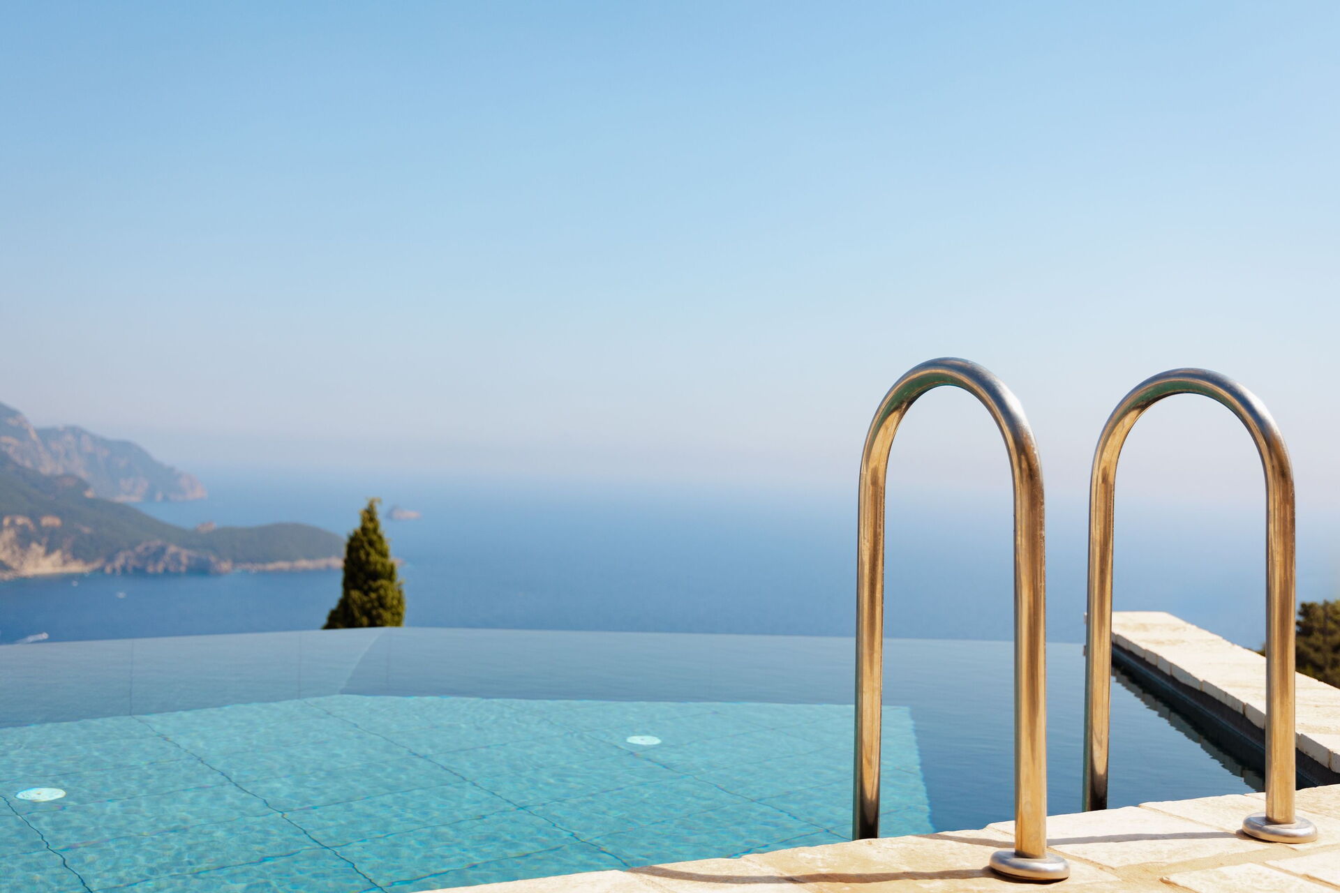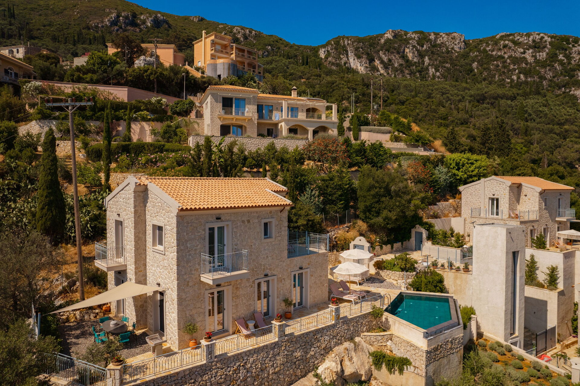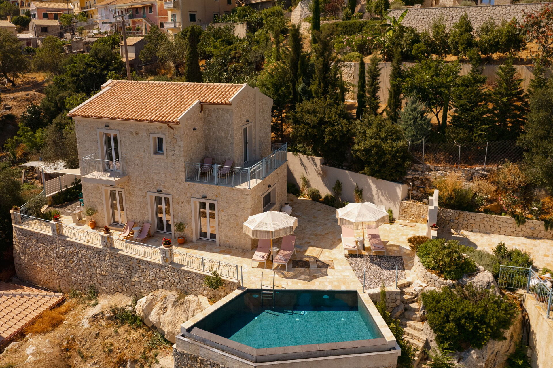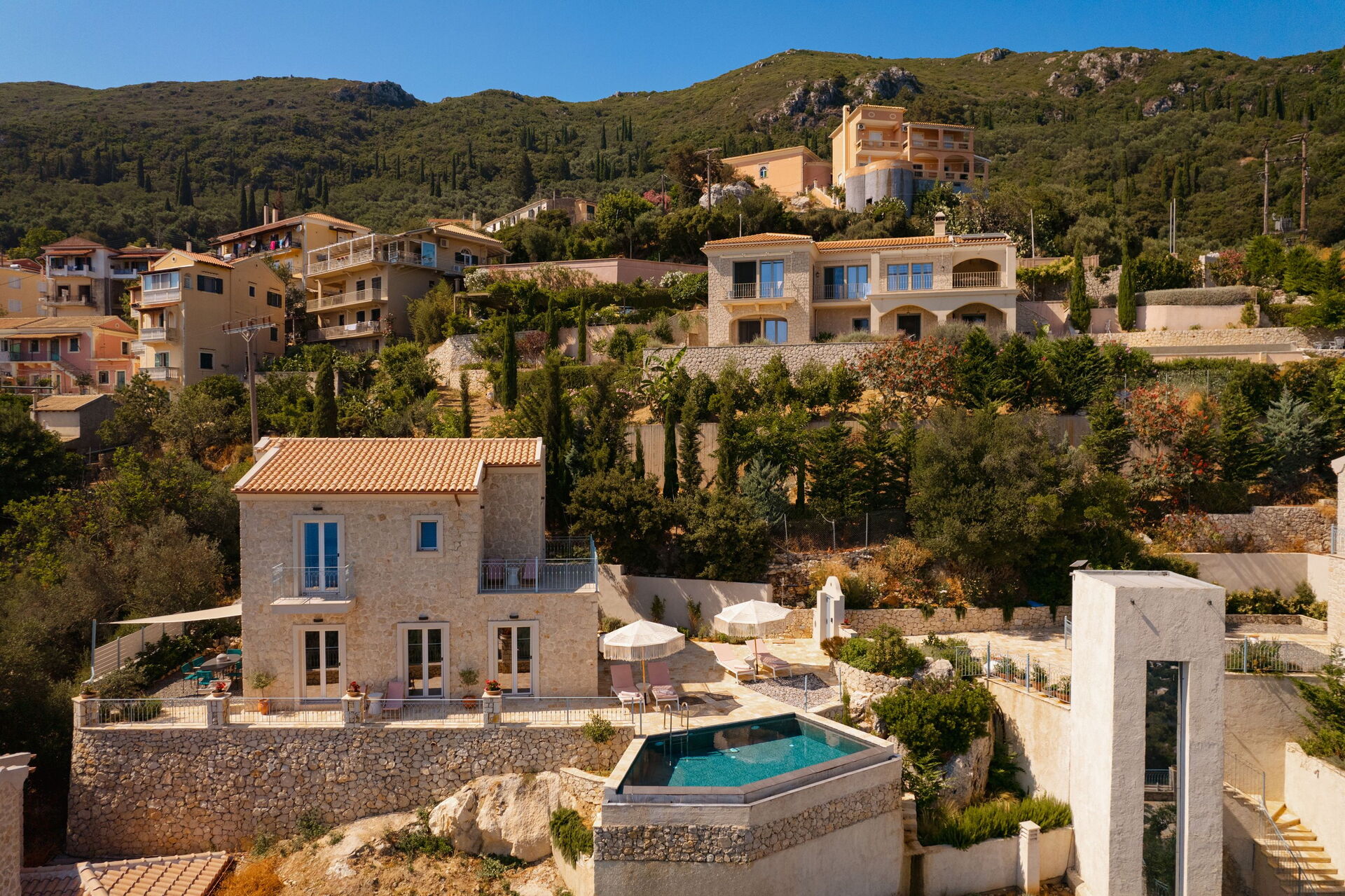 Un espace extérieur panoramique abrite une belle piscine privée et un solarium pour profiter des journées ensoleillées de Corfou.