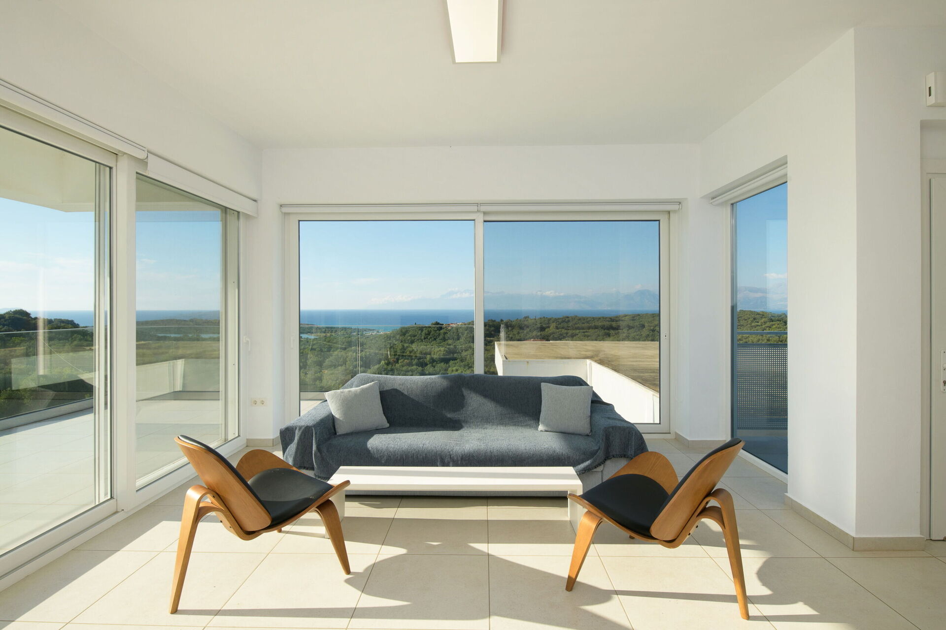 Avec ses immenses portes-fenêtres, ses grandes fenêtres et son mobilier de designer, la Villa Athena profite de tout le soleil et de la lumière que la Grèce peut offrir. Au rez de chaussée il y a un spacieux salon (canapés, Wi-Fi, climatisation) avec cuisine attenante (entièrement équipée) ainsi que 2 chambres (les deux avec salle de bains), une chambre a un lit double + un canapé (qui peut être transformé en un canapé-lit simple) tandis que l'autre chambre est un jumeau. L'étage supérieur est identique à l'étage inférieur, sauf que la chambre principale a juste un lit double et pas un canapé-lit supplémentaire. Les vaste terrasses des deux étages offre des vue magique sur la mer et le littoral Albanais.