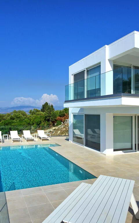 Belle villa avec piscine privée et vastes terrasses privées le long de la célèbre côte nord-est de Corfou.