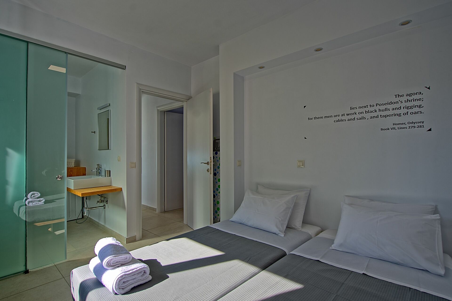 Avec ses immenses portes-fenêtres, ses grandes fenêtres et son mobilier de designer, la Villa Nafsika profite de tout le soleil et de la lumière que la Grèce peut offrir. Au rez de chaussée il y a un spacieux salon (canapés, Wi-Fi, climatisation) avec cuisine attenante (entièrement équipée) ainsi que 2 chambres (les deux avec salle de bains), une chambre a un lit double + un canapé (qui peut être transformé en un canapé-lit simple) tandis que l'autre chambre est un jumeau. L'étage supérieur est identique à l'étage inférieur, sauf que la chambre principale a juste un lit double et pas un canapé-lit supplémentaire. Les vaste terrasses des deux étages offre des vue magique sur la mer et le littoral Albanais.
