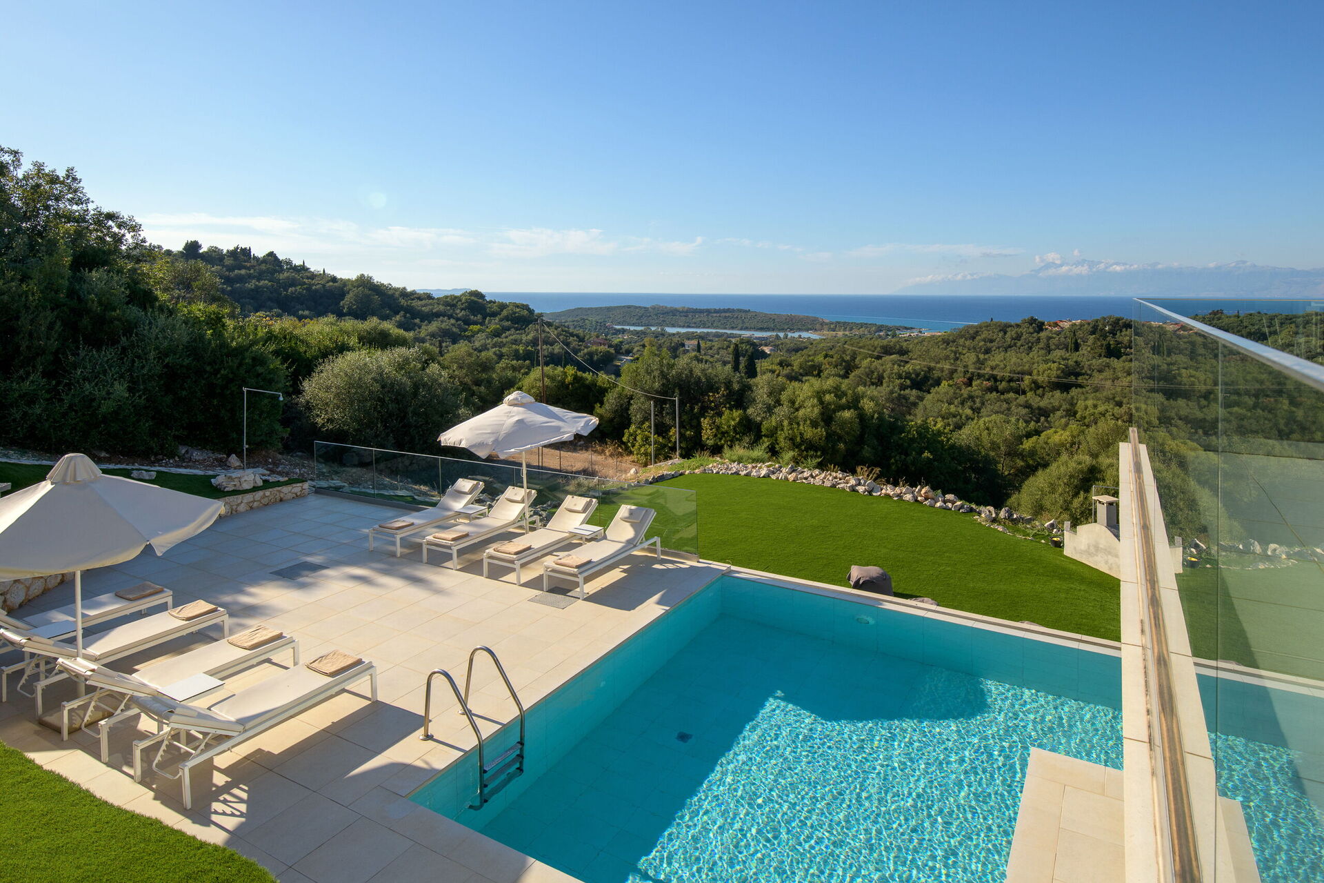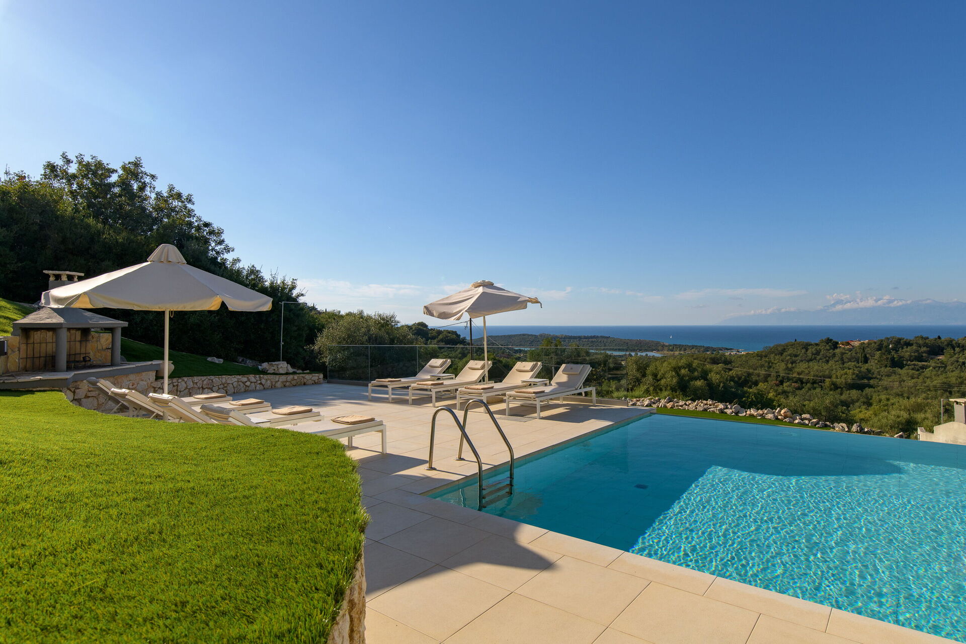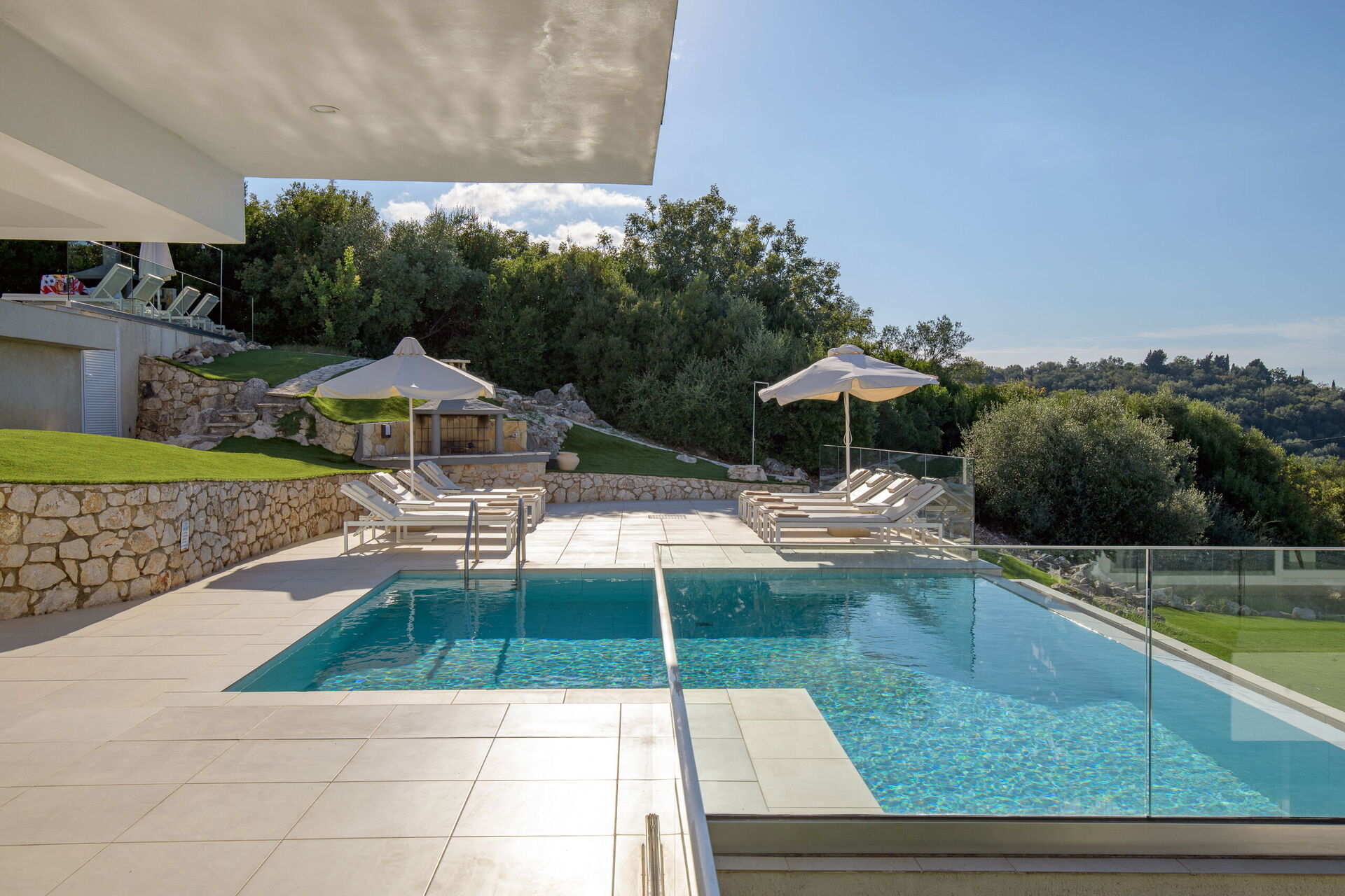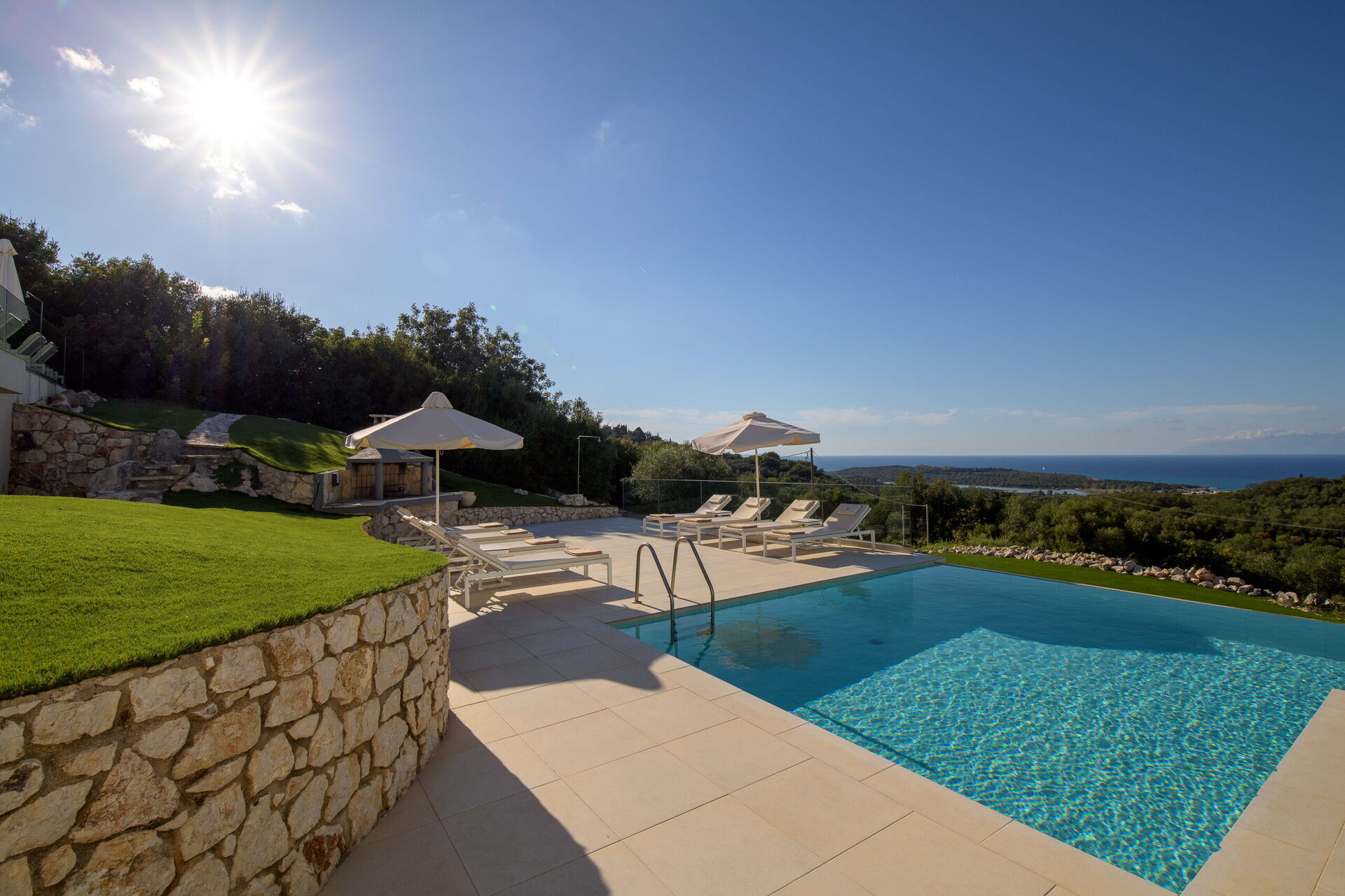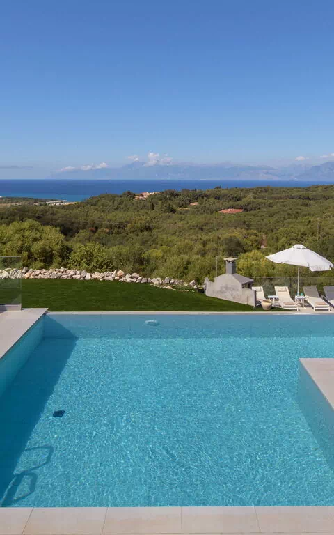 Belle villa avec piscine privée et vastes terrasses privées le long de la célèbre côte nord-est de Corfou.