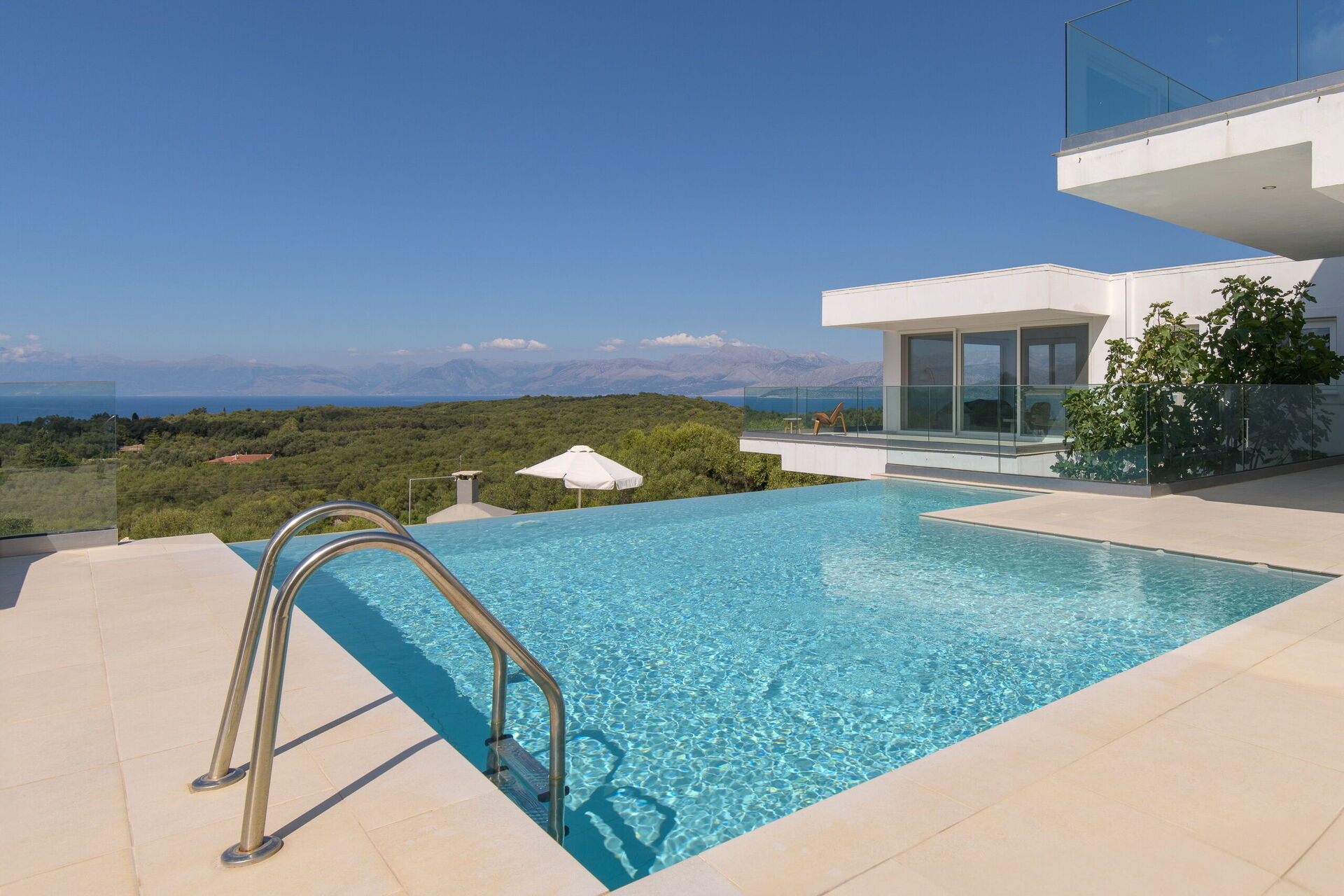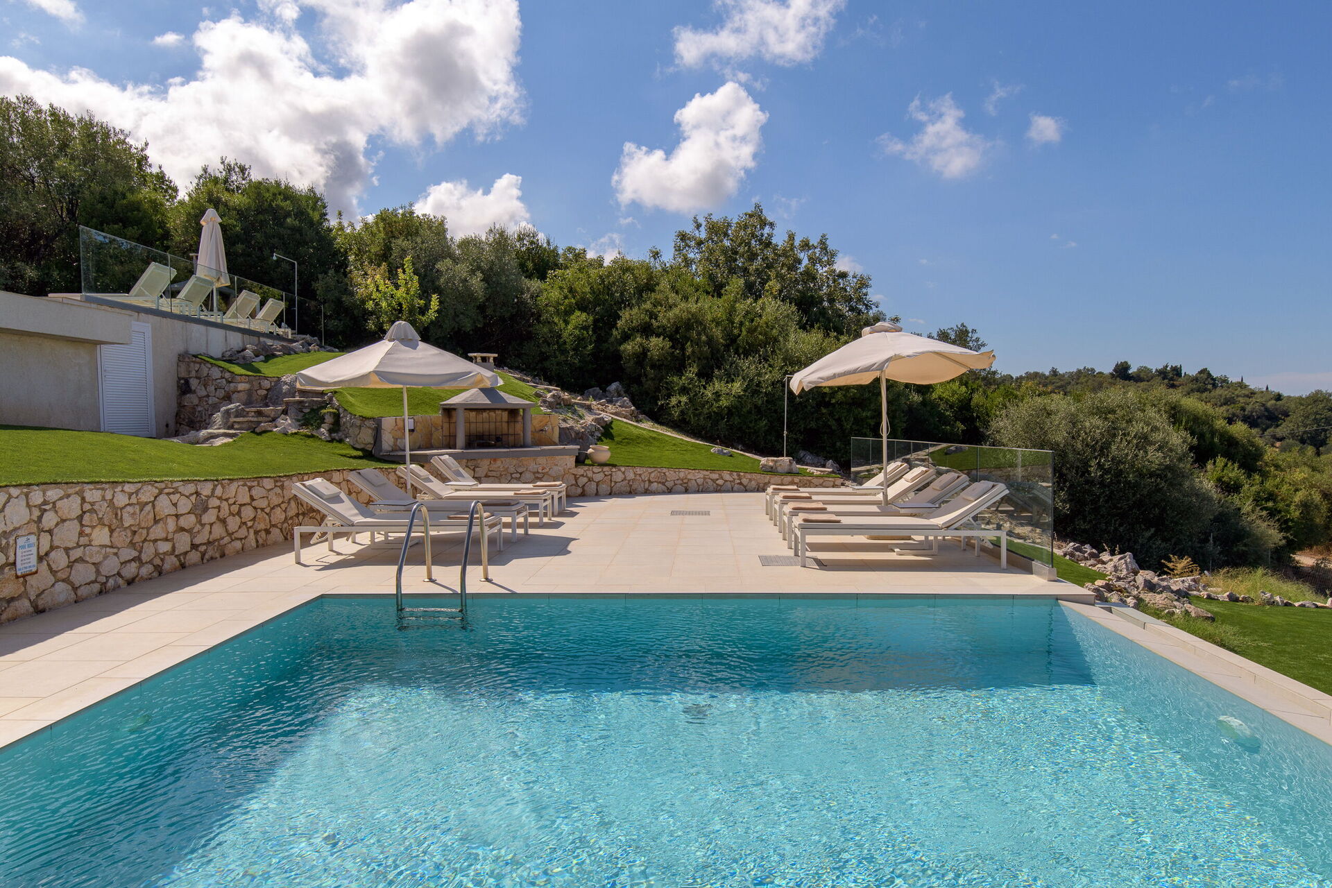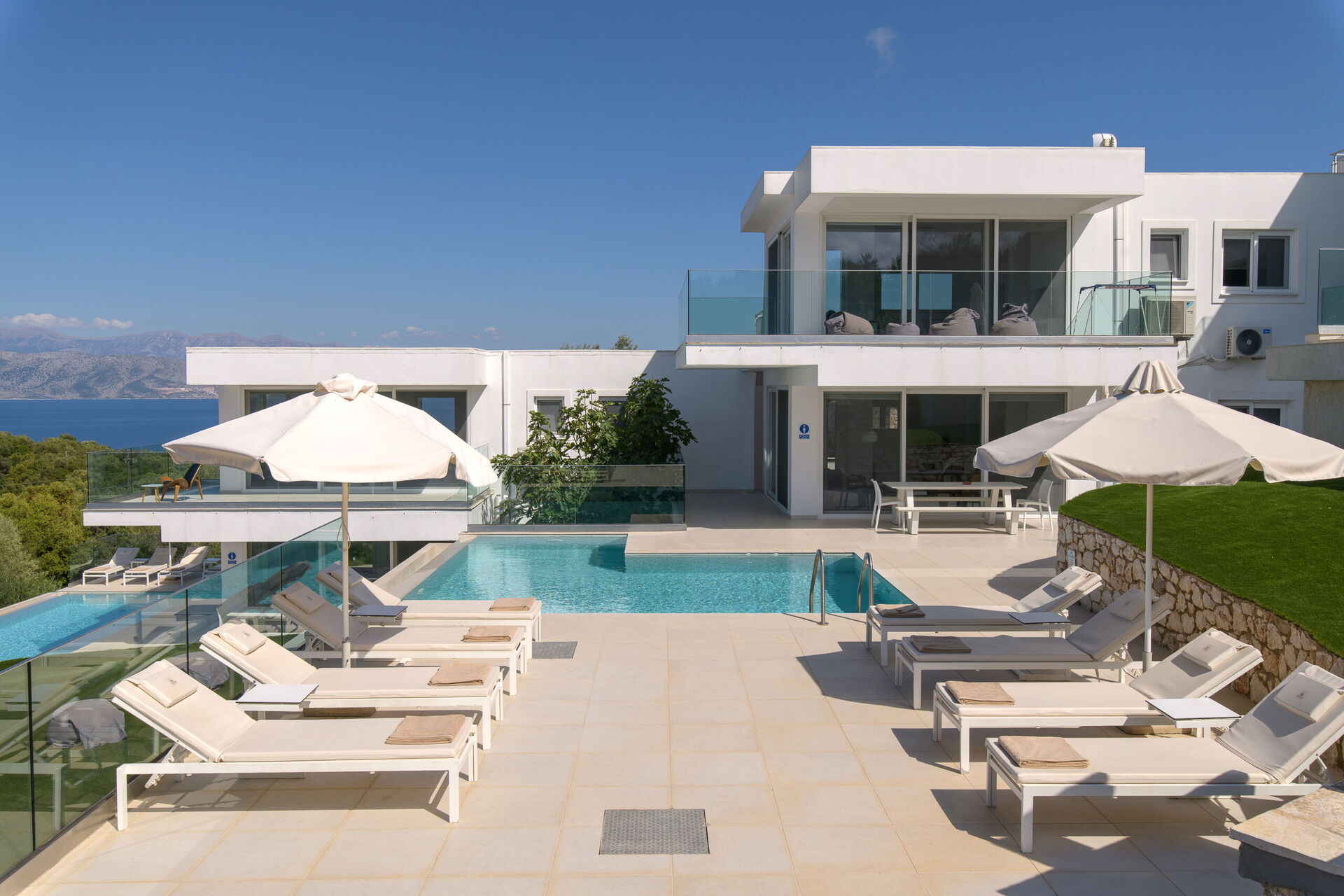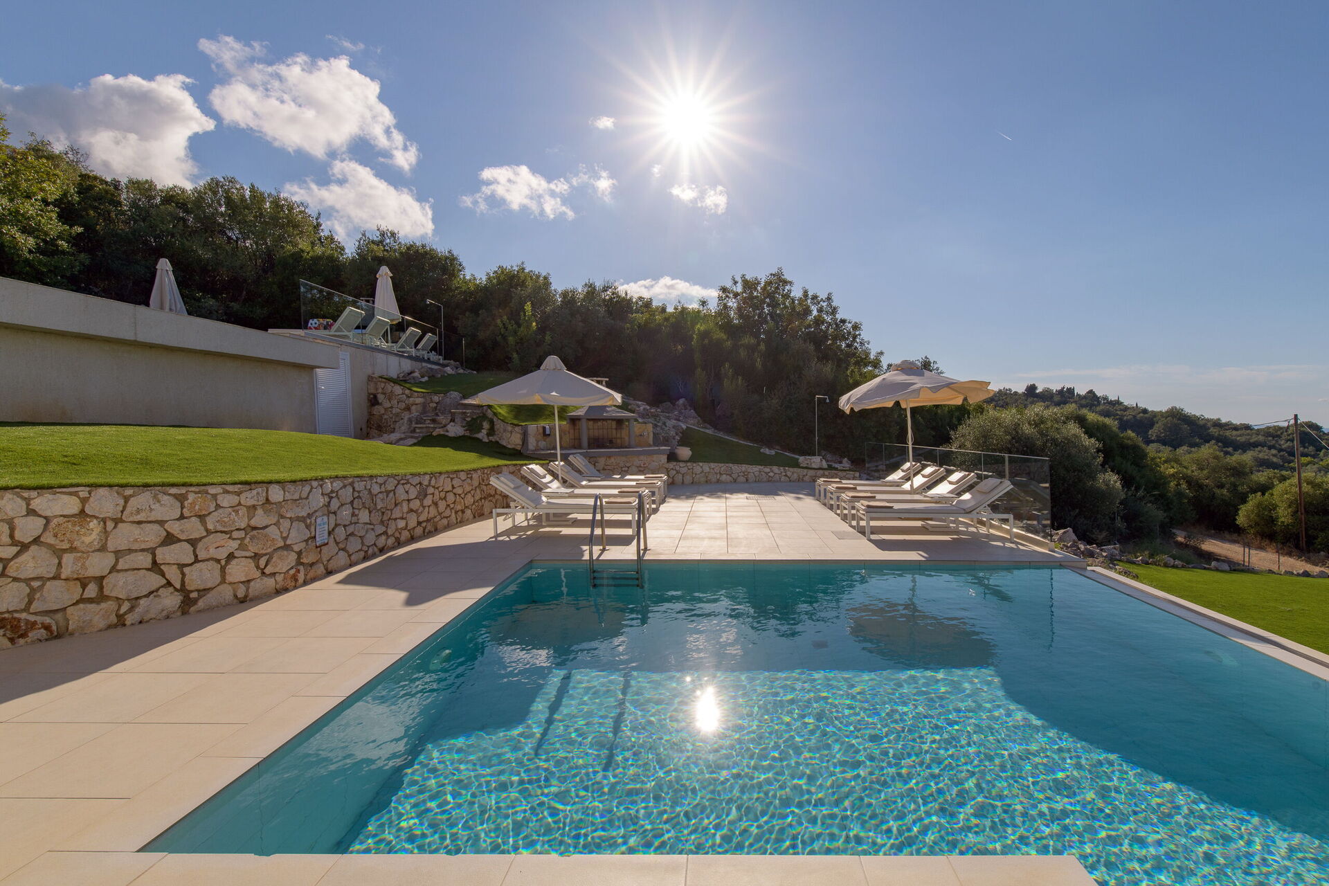 Belle villa avec piscine privée et vastes terrasses privées le long de la célèbre côte nord-est de Corfou.