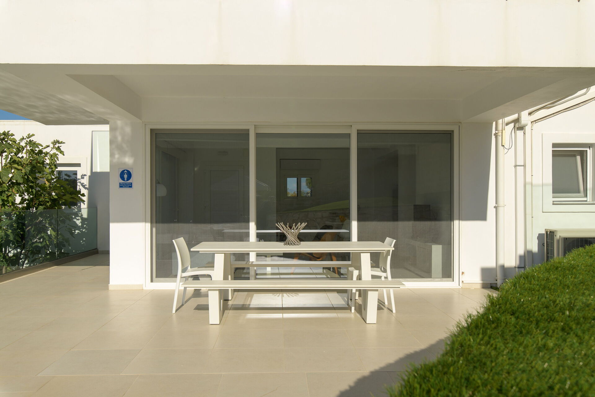 À l’extérieur, des patios joliment pavés avec chaises longues pour tous les invités profitent de toutes les vues les plus sensationnelles et de la brise du littoral.