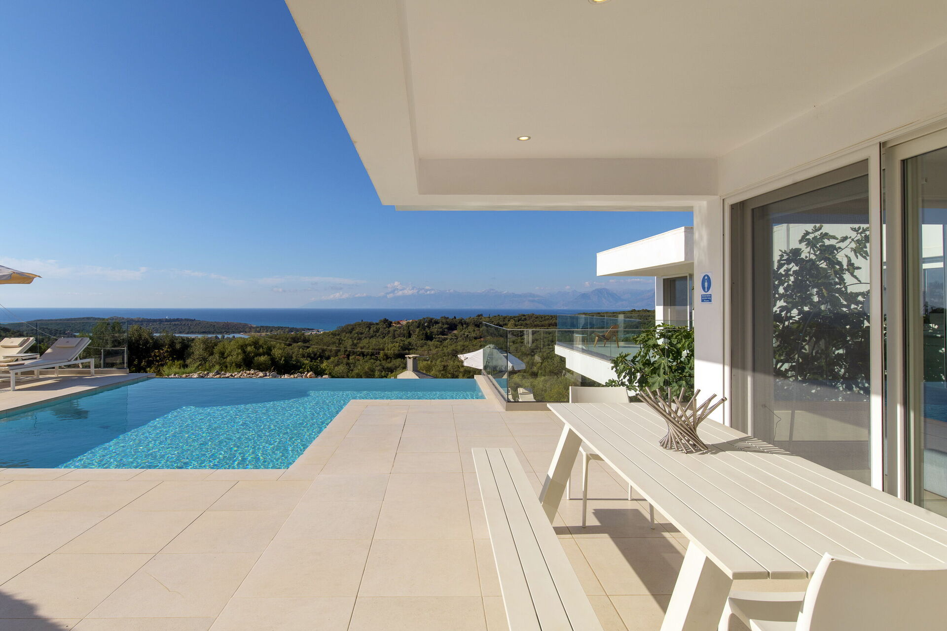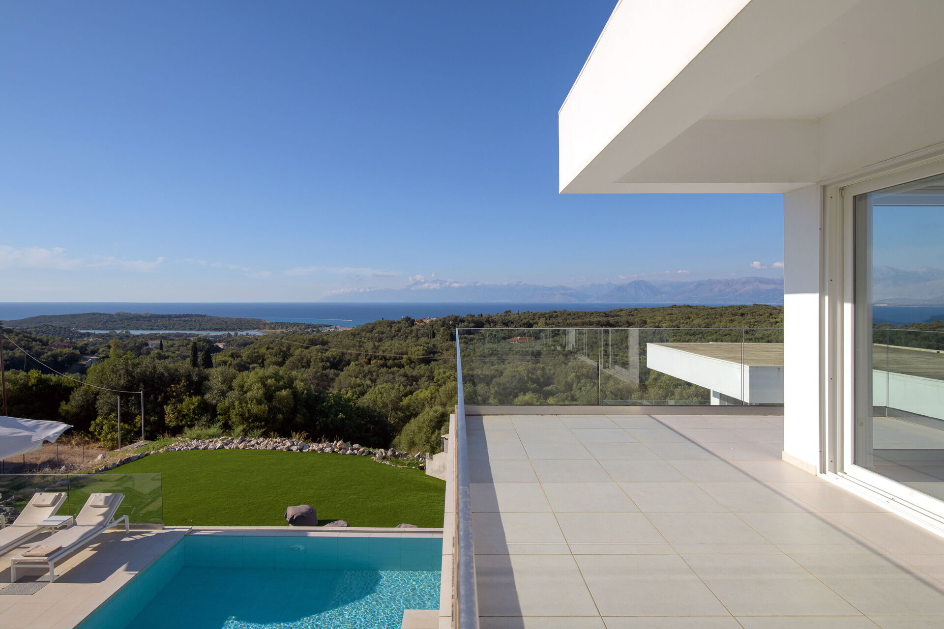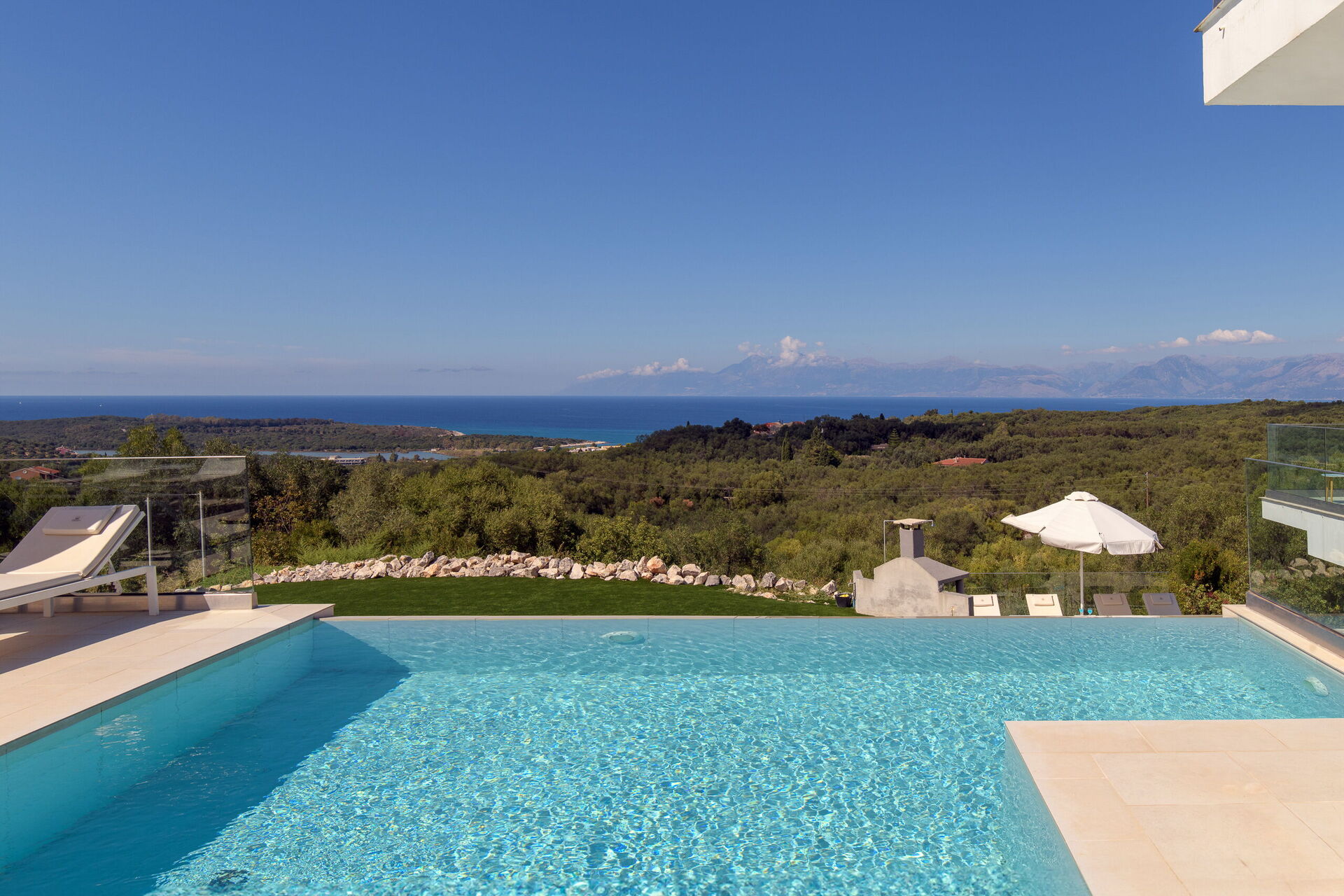 We had a wonderful holiday, villa is very nice with all the essential amenities with stunning views across to Albania. Pool area is lovely with plenty of space and sunbeds, and although villa is in the middle of 3, privacy was not an issue. The only negative is that the villa is split onto 2 levels with no internal staircase, but we made this work by making sure the key was always put back in the lock box. The villa is in the North East part of Corfu, which we found to be the nicest area. The local village / harbour of Kassiopi is stunning with wonderful restaurants, cocktail bars, shops and supermarket. Further along the coastline is Kalami (where The Durrells was filmed) - this is a lovely spot, along with Agni Bay (next bay round) - the restaurants at Agni Bay can be accessed by boat from Kalami which makes it extra special. Local beach of Agios Spyridon is sandy with very shallow water, nice lunch-time restaurants. Would definitely recommend this villa / area but would note that a car is ESSENTIAL.
