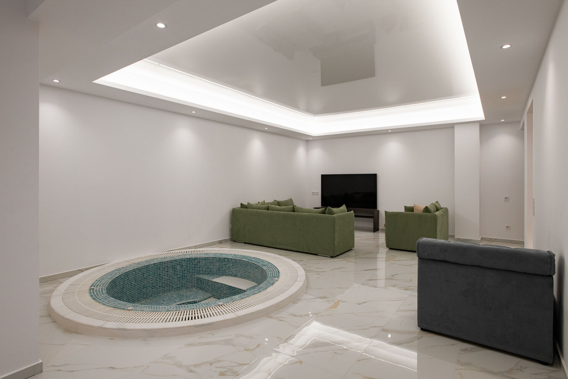 Niveau inférieur: (accessible depuis l’intérieur ainsi que de l’extérieur): espace spa avec bain à remous de forme circulaire (diamètre de 2 mètres; 6 places assises; chauffé jusqu’à 36° C); salle de bain avec douche; canapé-lit double.