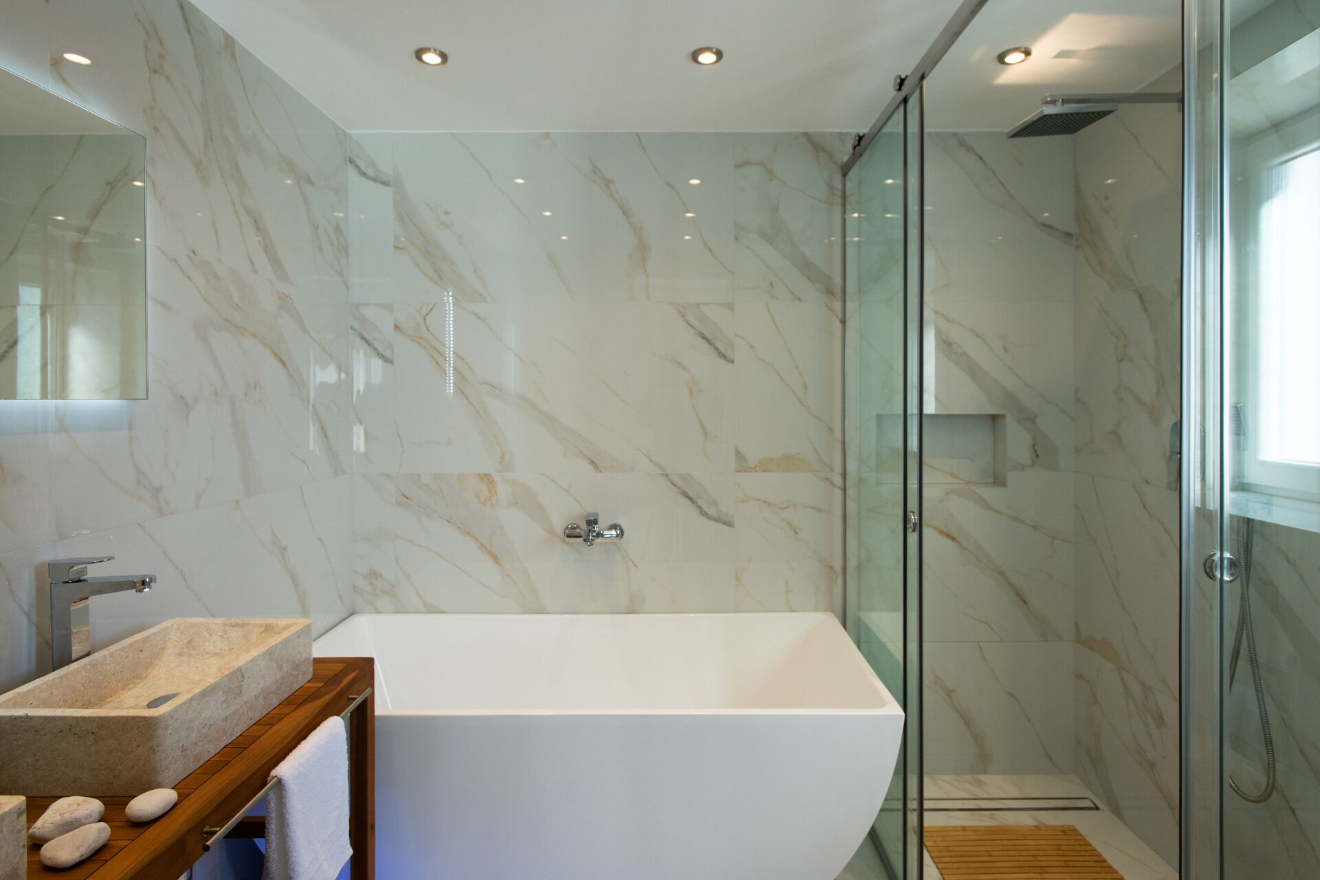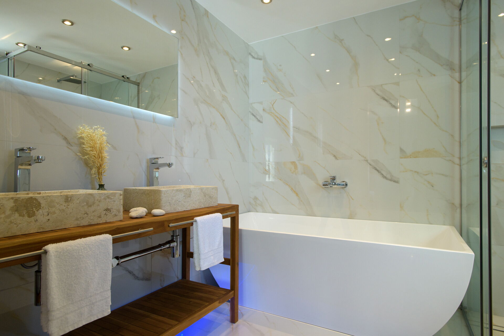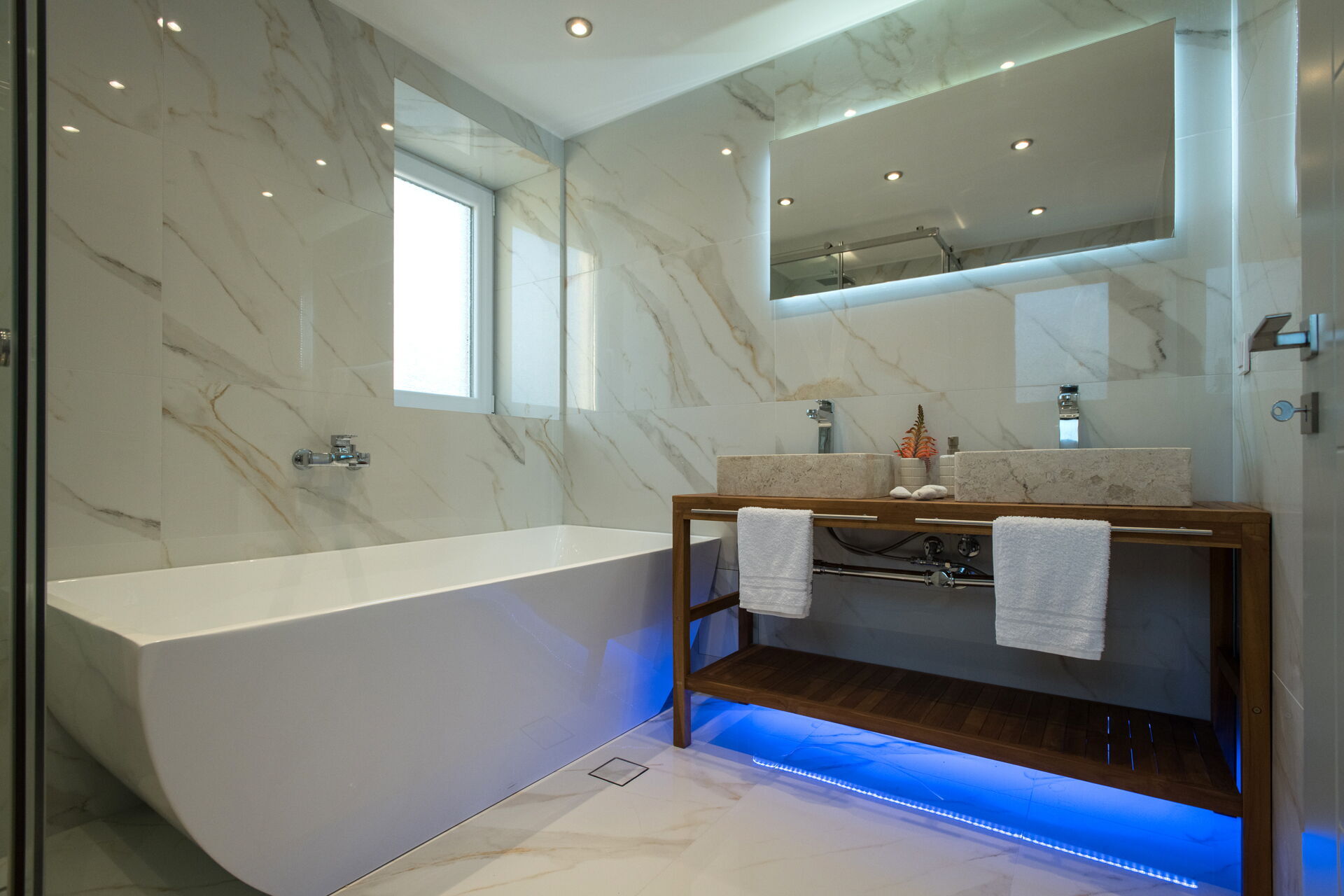 La villa s’étend sur trois niveaux, dispose de 3 chambres et de grands espaces communs comprenant une zone bien-être avec bain à remous intérieur (situé au niveau inférieur de la villa). Elle peut accueillir confortablement jusqu’à 6/8 personnes dans un cadre exclusif et panoramique.