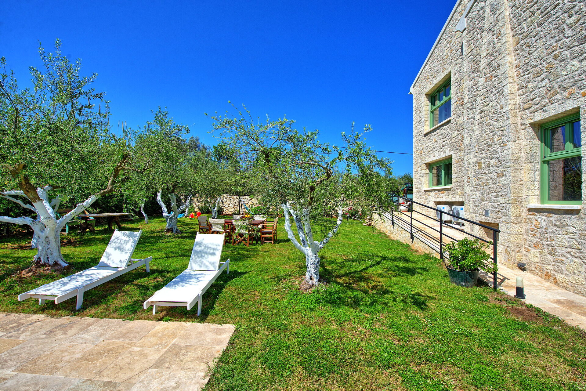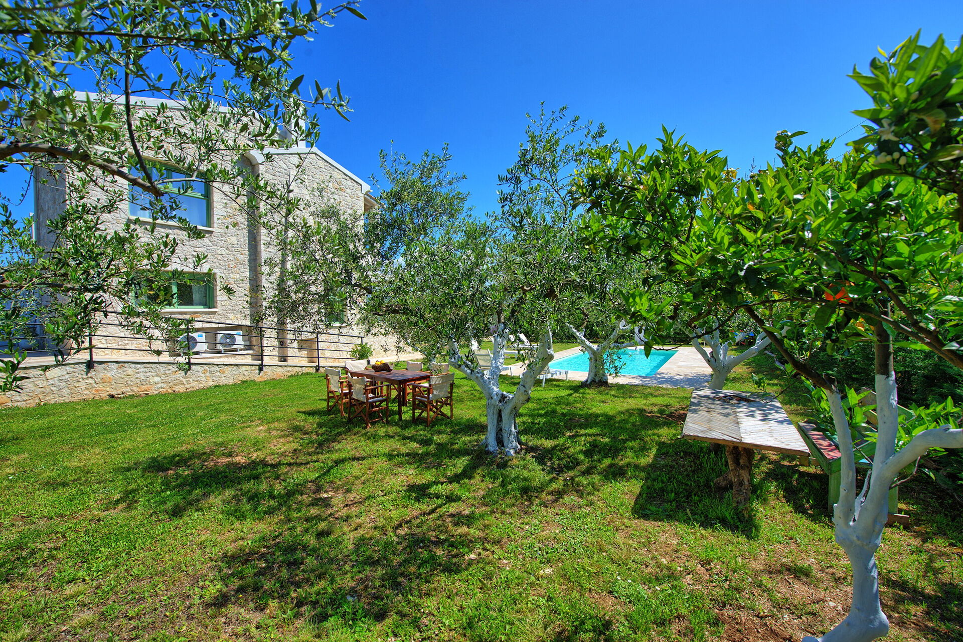 A significant highlight is the inviting outdoor dining area nestled beneath ancient olive trees. This picturesque setting offers delightful natural shade while offering a serene view of the pool. Equipped with a table and chairs, it's the ideal place to savor meals and moments together.