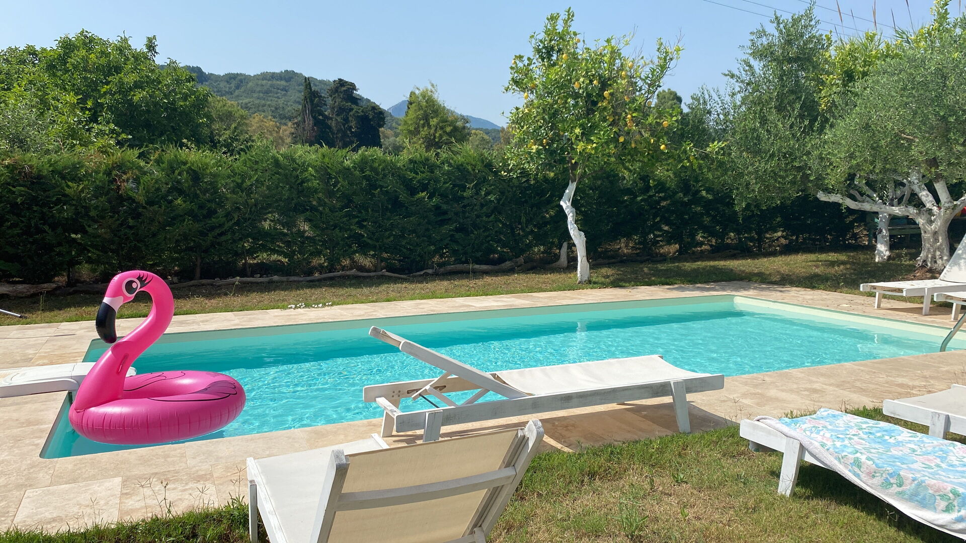 We were 5 people staying for 1 week in August at villa Elaia. The beach is 700m away, nice and quiet. Pool was nice to scape the heat. The villa it‘s not far from supermarkets and from the friendly village of Kassiopi. Car is need it! Athanasia is the owner and she lives in the other half of the house. She does not disturb and always helpful and friendly. Lots and lots of mosquitos at night. We rented a boat at Agios beach and explored the north east of the island (I can only recommend). Negative point was that the dishwasher was broken, We grilled/cooked/breakfast several times at the villa and the dishes needed to be done per hand. We also thought that could be a little cleaner (specially the toilets) but in general I can recommend the place if you get a good offer.