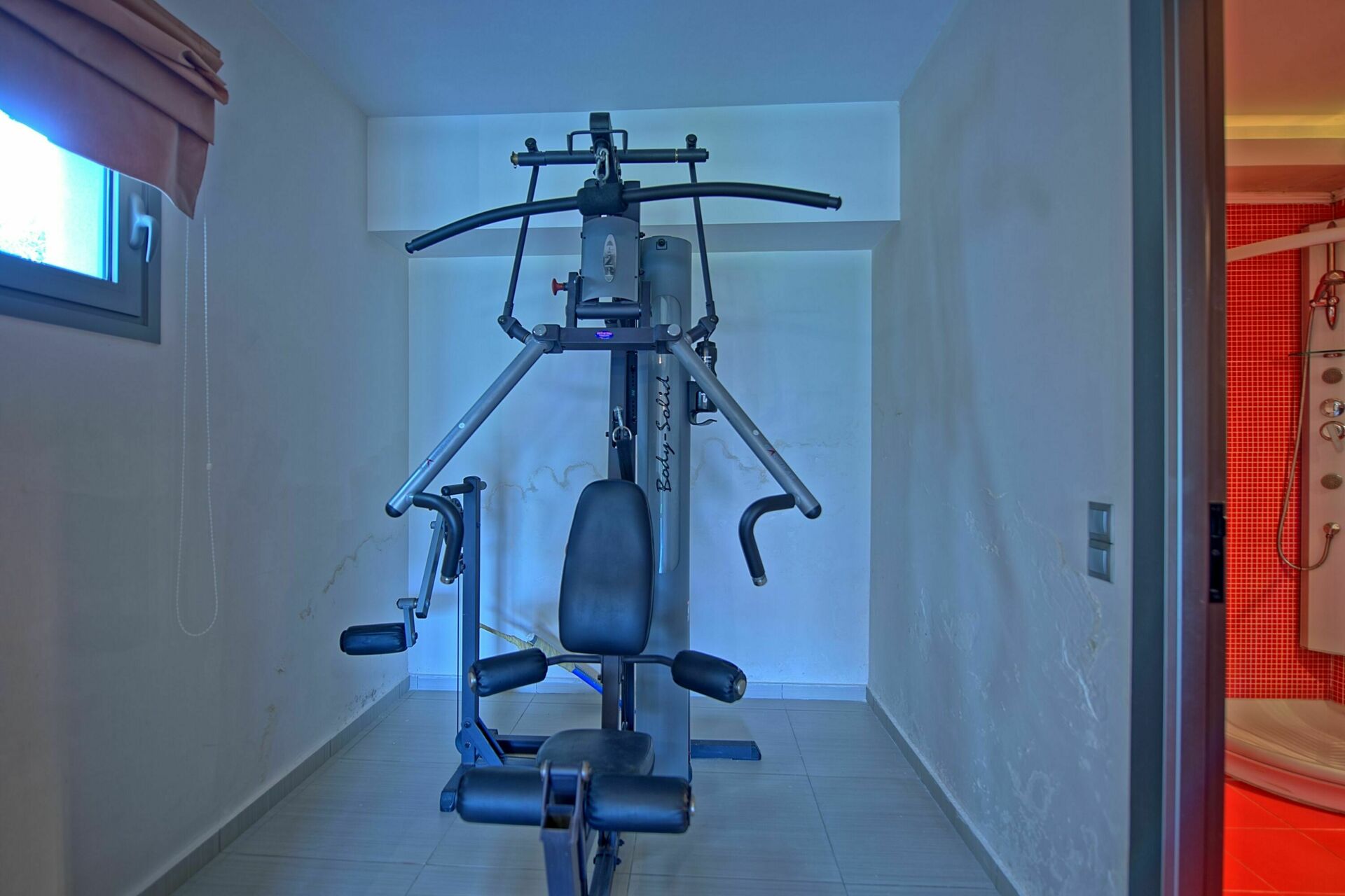 Rez-de-chaussée: séjour (TV sat) et coin gym (tapis roulant, machine de musculation), chambre double, salle de bains avec douche (sans fenêtre), pièce avec machine à laver.