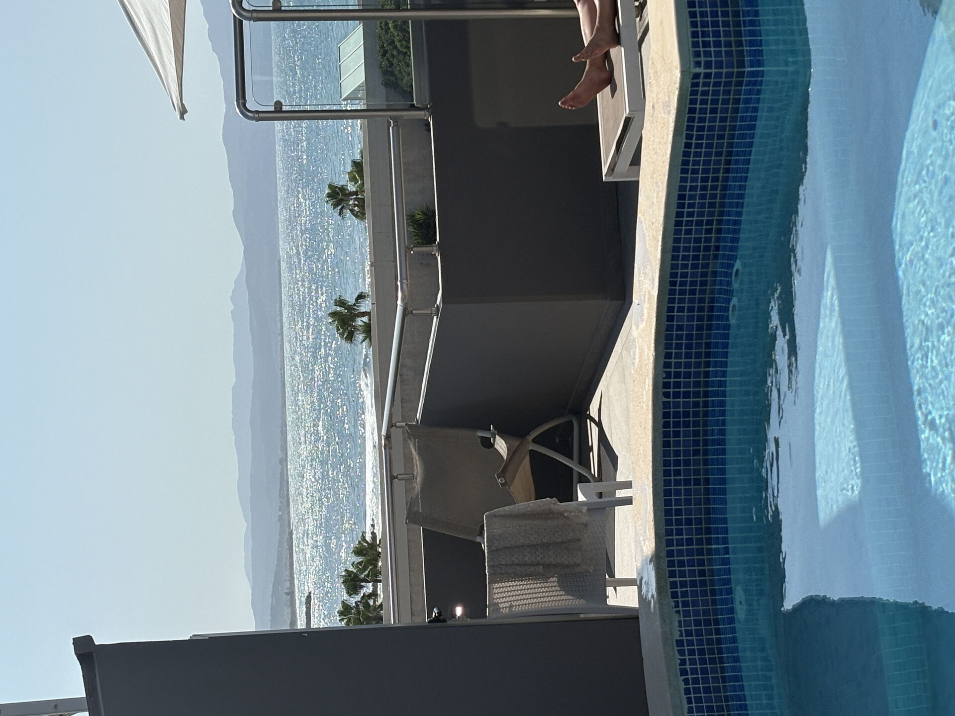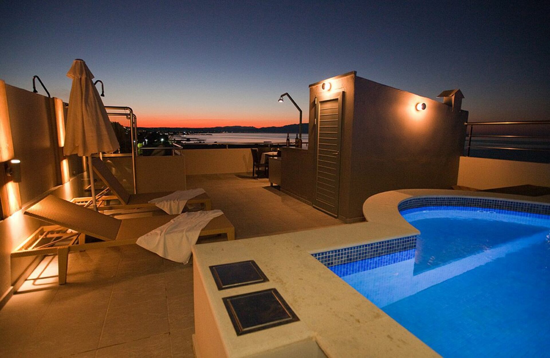 Troisième étage: terrasse panoramique avec piscine privée (profondeur : 0,55 mètres), douche extérieure, table et chaises pour manger en plein air.