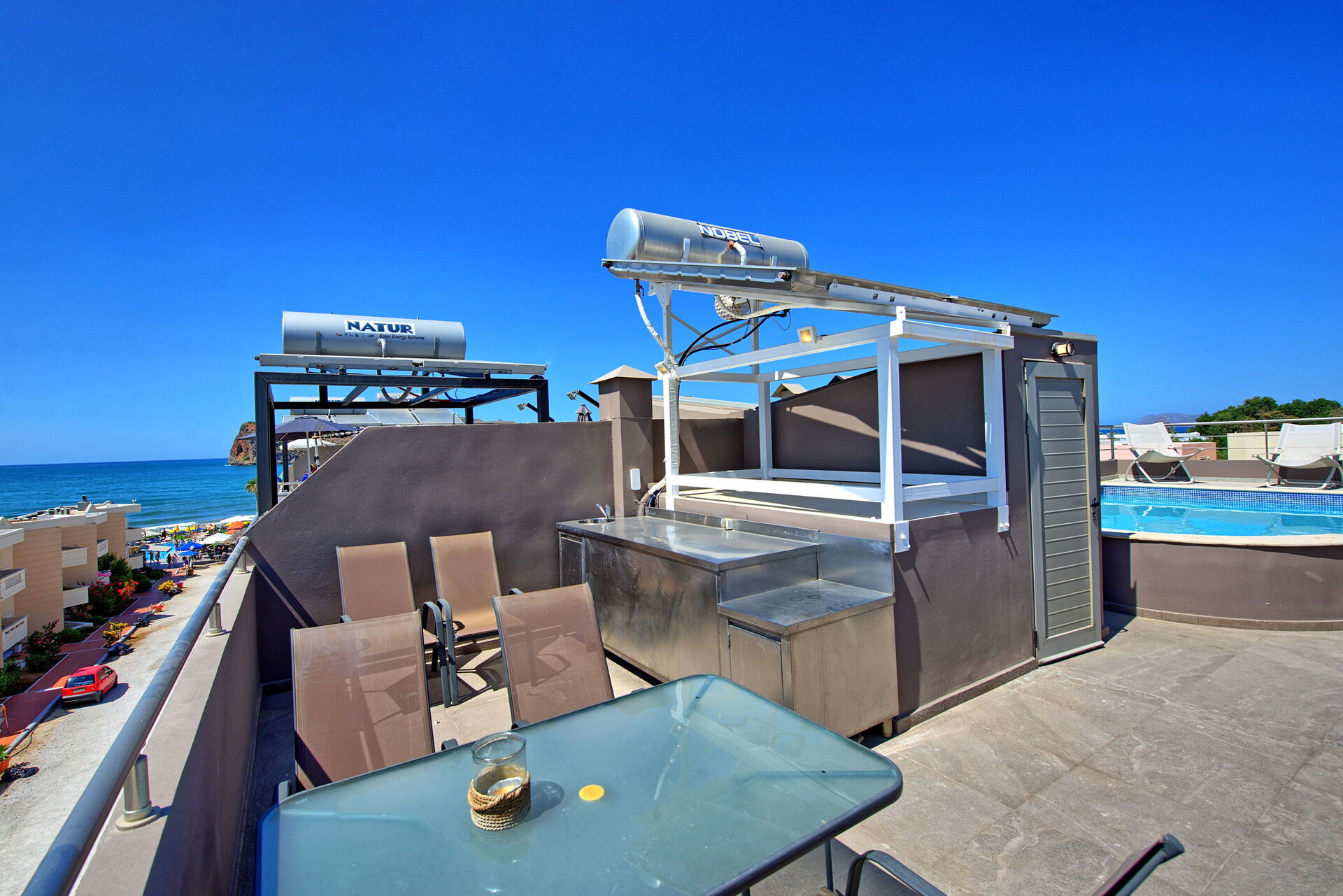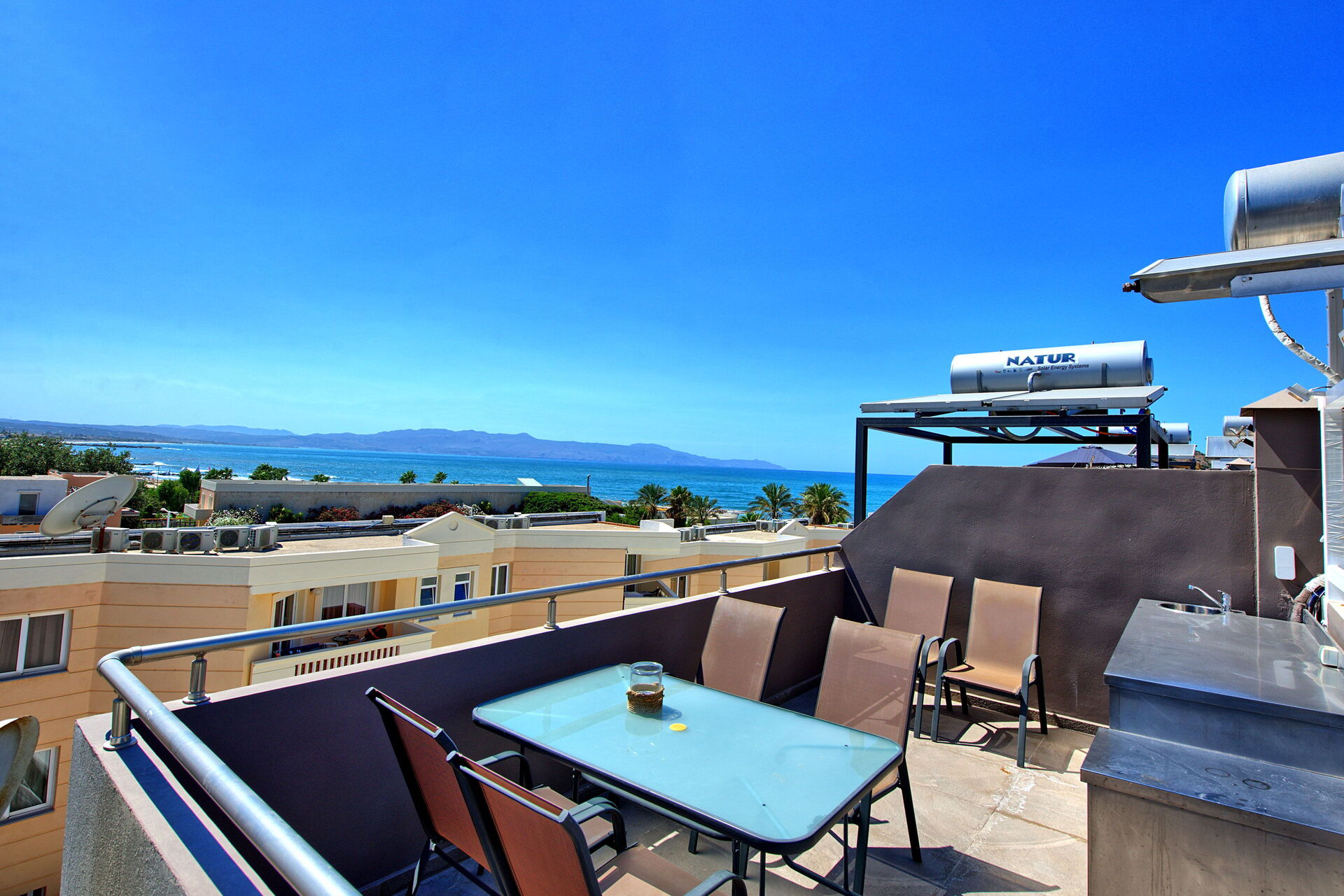 Distances: Mer 100m, Agia Marina (toutes sortes de magasins) 100m, Cabana Mare Beach Club 300m, Chania 11km, aéroport 30km.