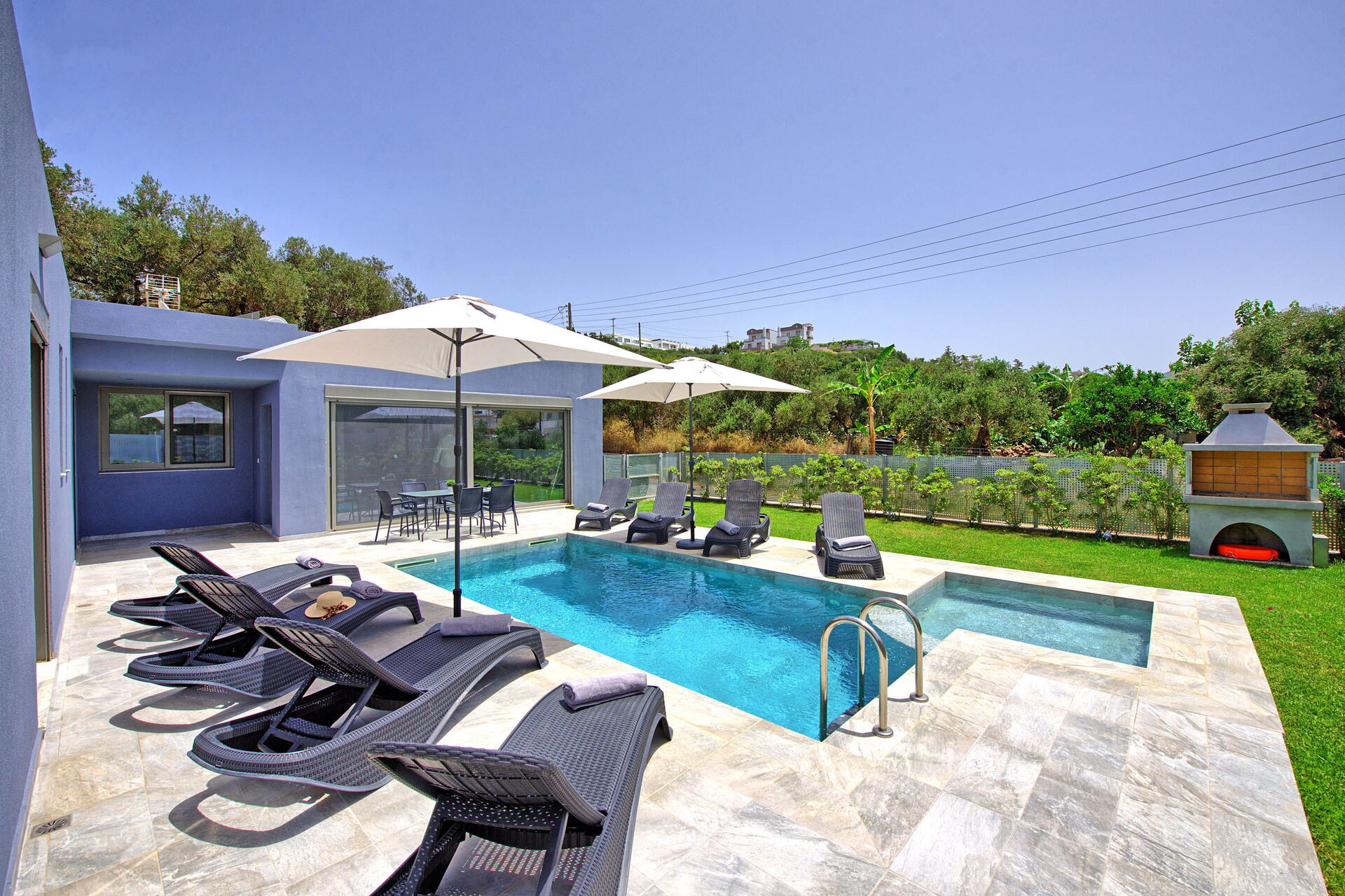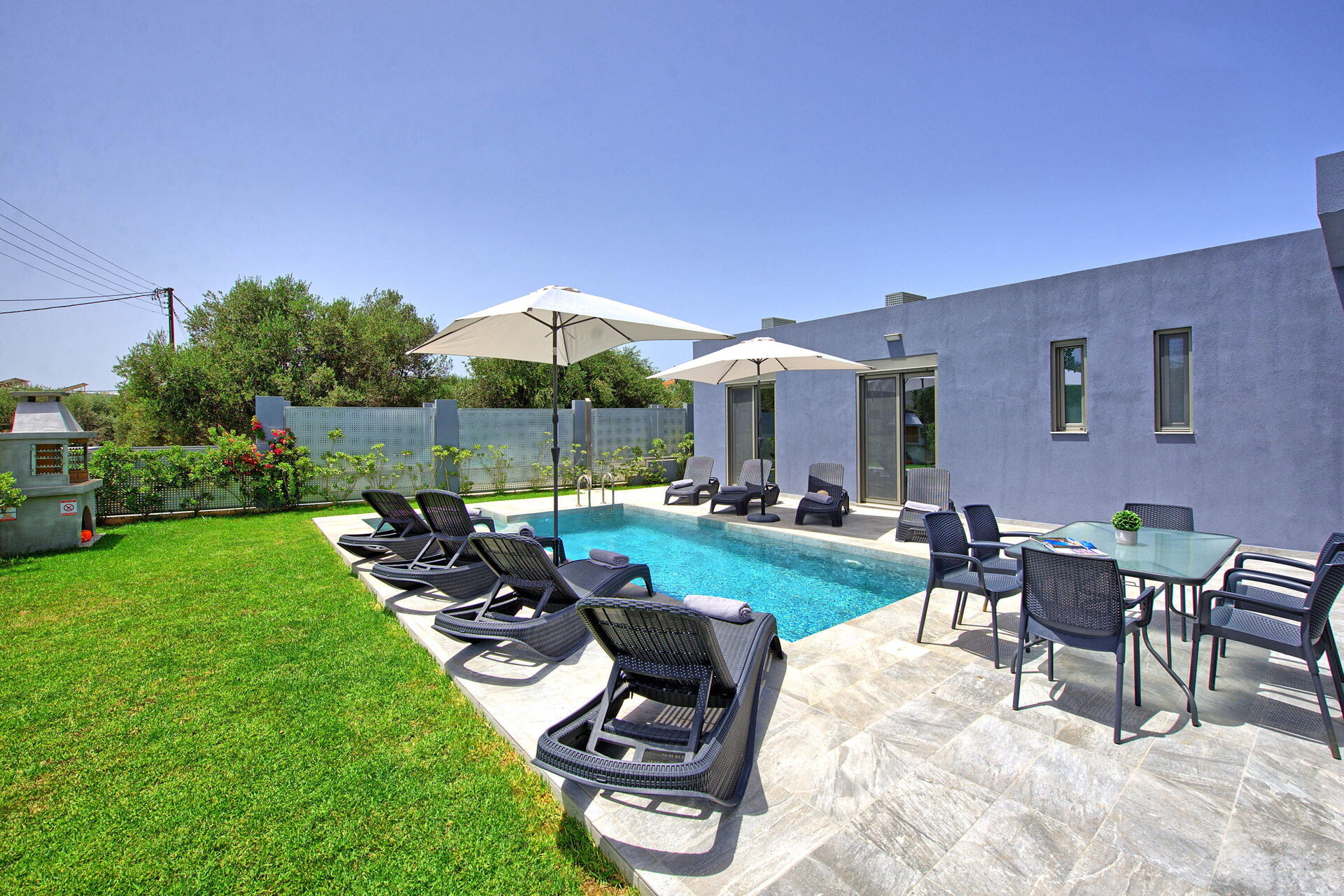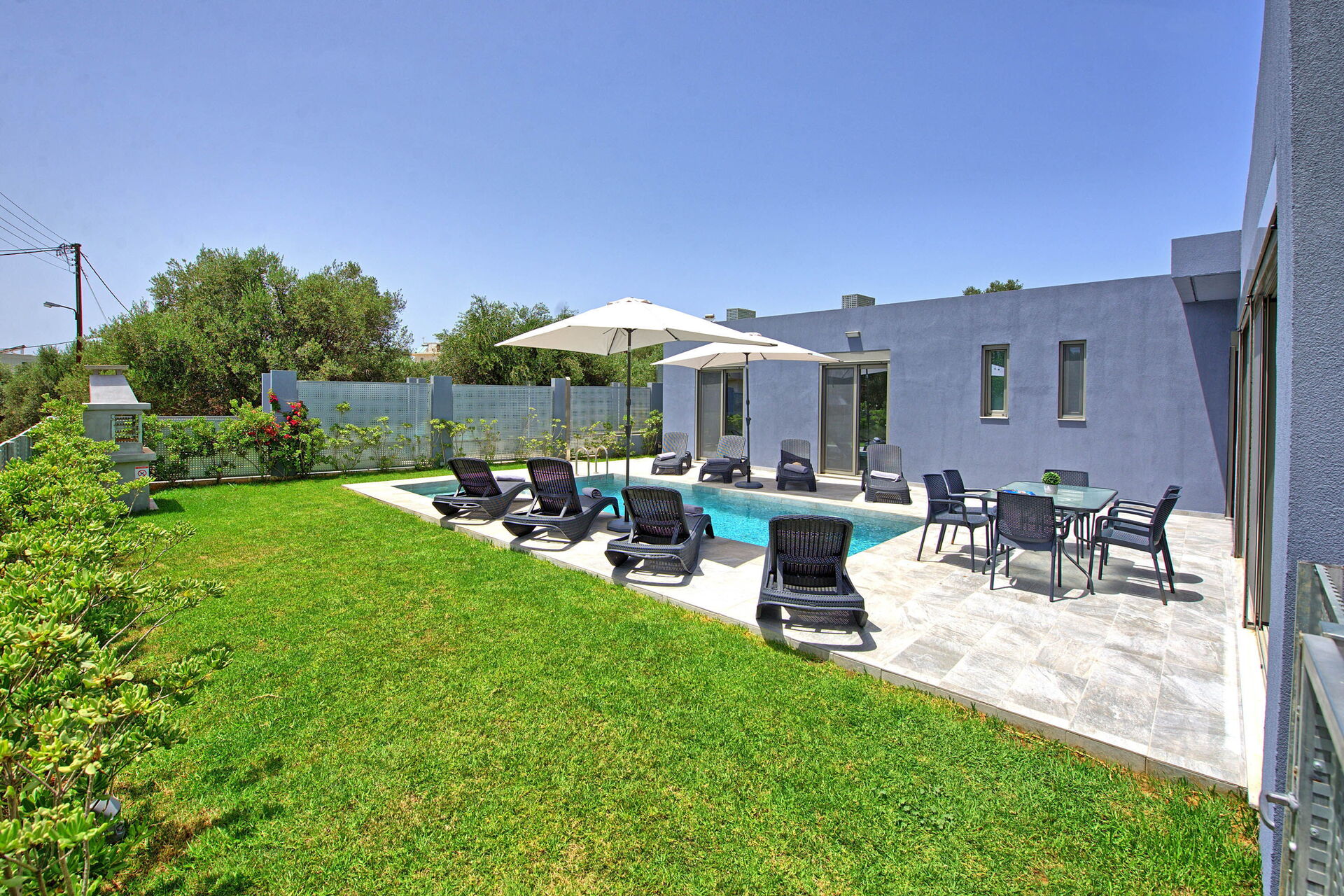 Excellent, well built villa with a good layout and high quality equipment including barbecue. Lovely, well maintained swimming pool too. Perfect setting with everything you need for a relaxing summer holiday 10 minutes or less walk away. Nearest taverna 3 minutes walk (Rokka) lovely food and very friendly. The villa owner was also friendly and efficient and on time for our arrival and departure.