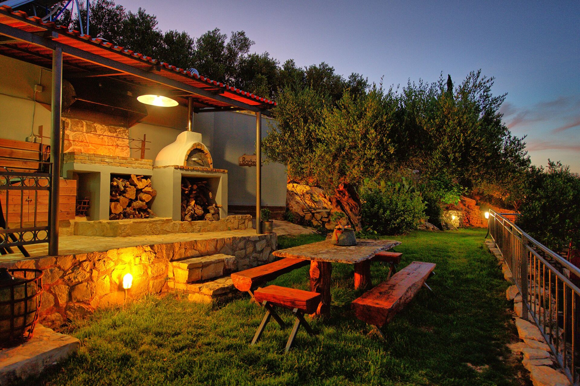 - Grand zone équipée avec barbecue, four à bois, tables et chaises pour les repas en plein air
