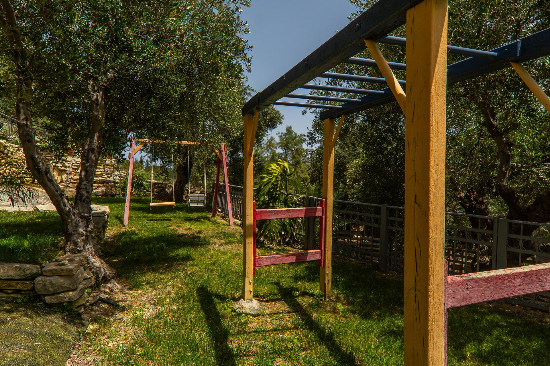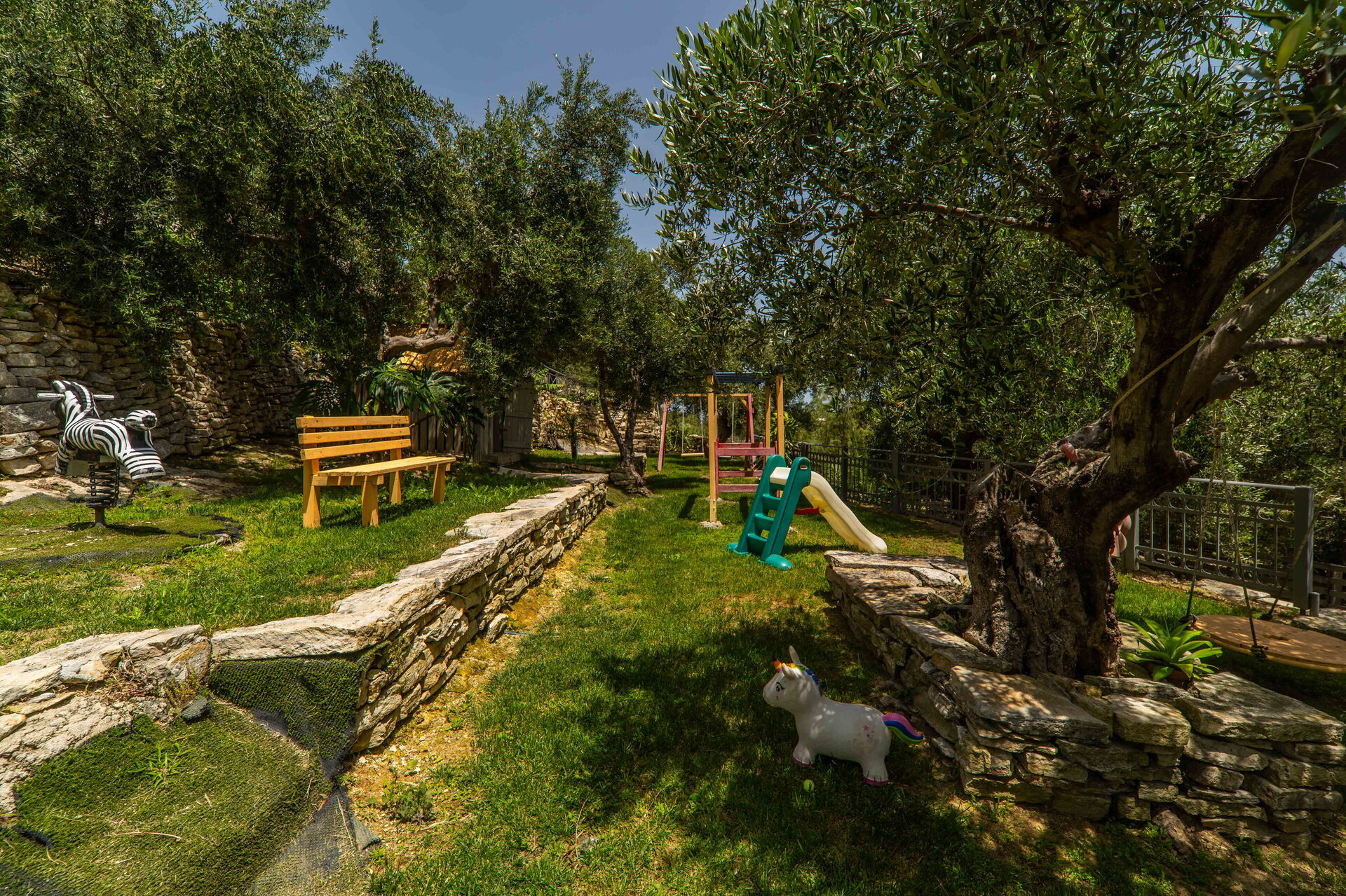 - Aire de jeux pour enfants (toboggan, balançoire, petite maison en bois)