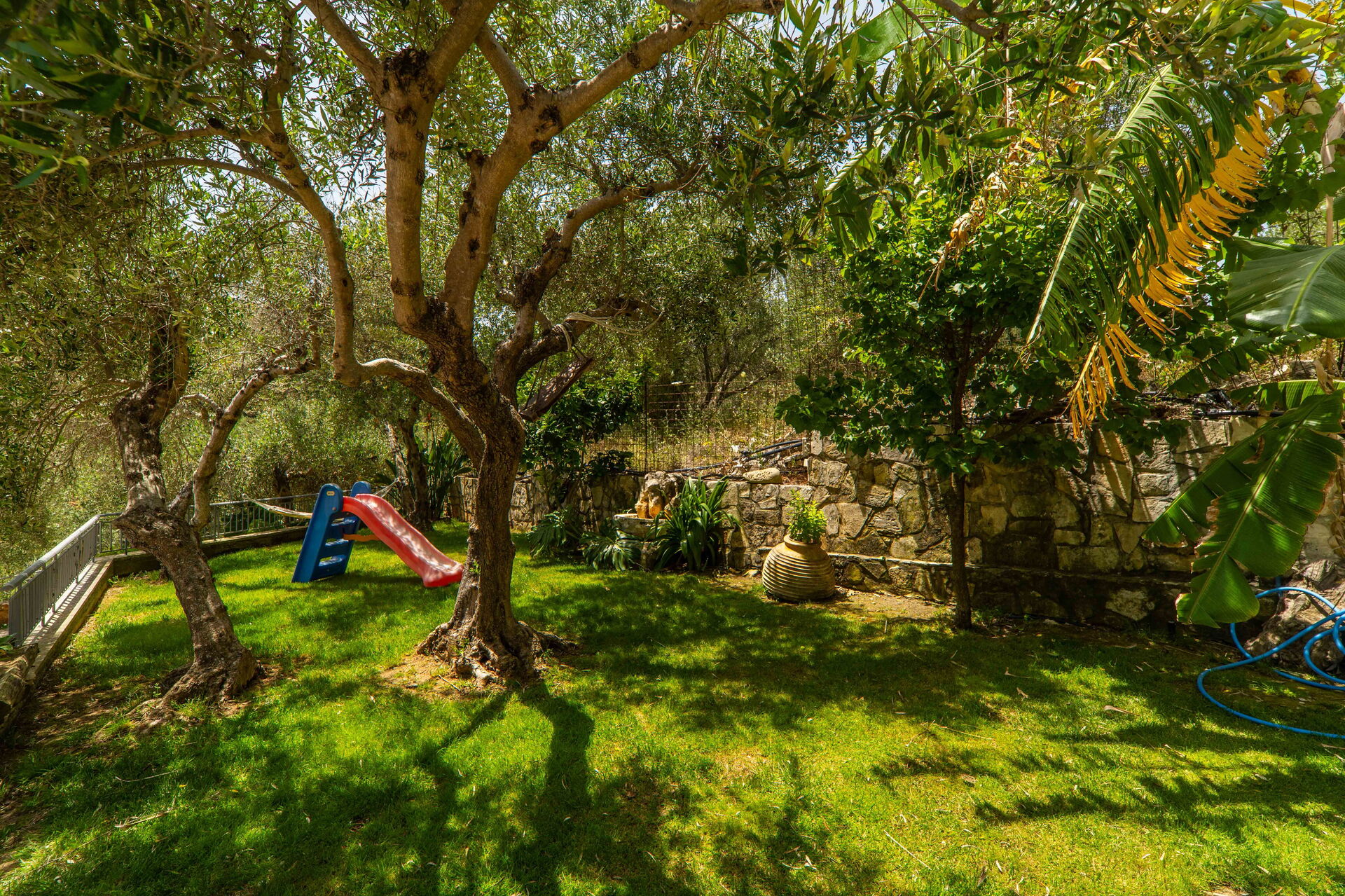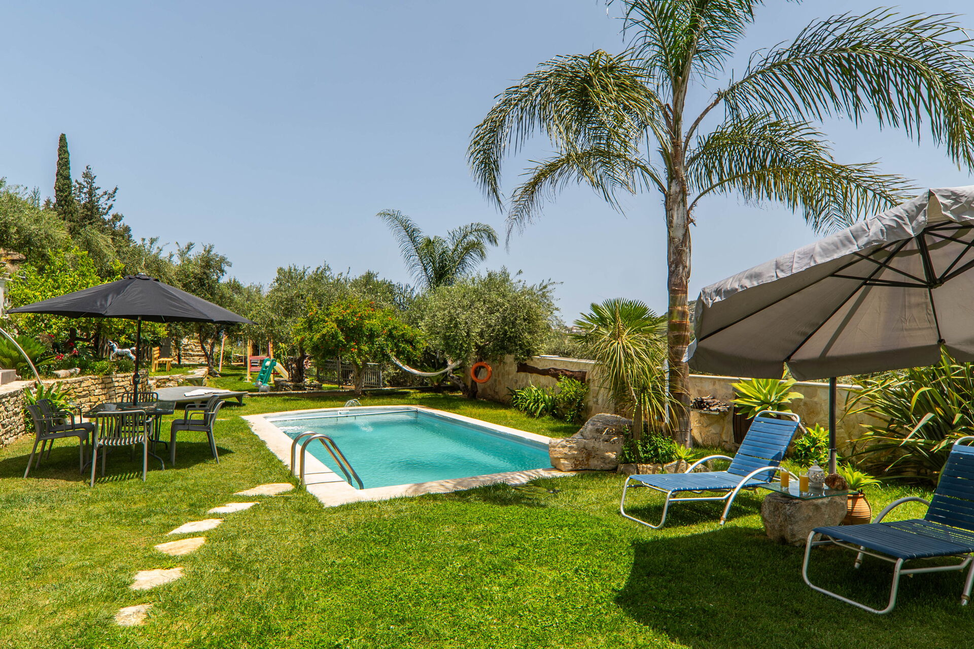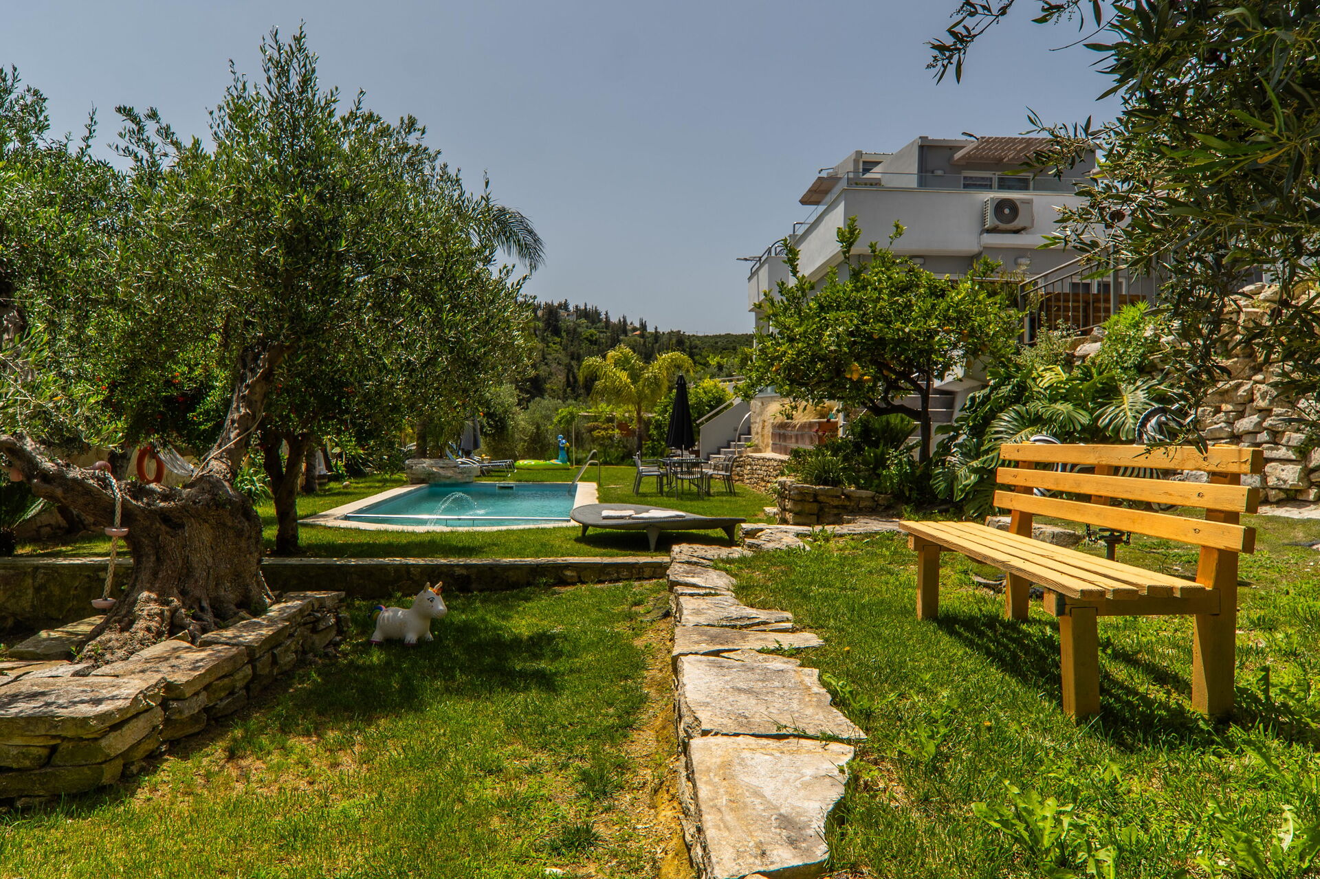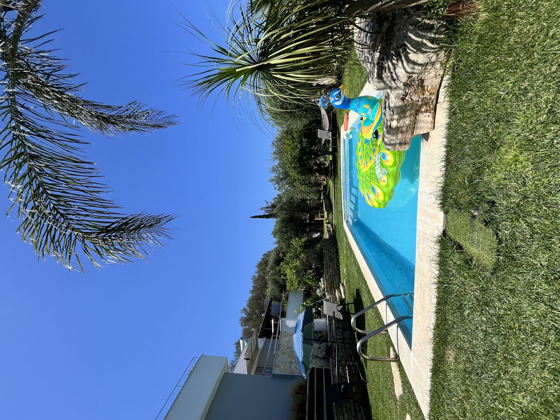 It offers a gorgeous garden, with plenty of trees, plants and flowers , all of them perfectly kept. What impressed us the most were the great number of lovely spots to relax: the 2 hammocks, at least 3 hanging chairs, sunloungers, 3 tables and chairs to sit and eat outside... one in the main garden, one on the first floor terrace, one at the Bbq: you will be spoiled for choices! We used to have breakfast on the terrace on the first floor, to enjoy the lovely view of the hills, and the sea in the distance in early morning, while we prefered the one in the garden, in front of the enlighted pool for dinner! For children a real playground has been created: swings of every kind , slide, a cute wood house, a climbing arch....and the 2 pools!!! Indoor, the property is not less attractive: the master bedroom is dreamy, with a gorgeous view and access to the jacuzzi! The other 2 bedrooms are lovely and both have access also on the garden. Every room is provided with smart tv and Ac. Also the kitchen area is just fabolous: you will find everything you may need: Oven, dishwasher, many tools to cook... and eveything is very convenient: you can access the first floor also from an external staircase for example, there is a nice area to hang clothes after using the washing maschine, the villa is equpped with an alarm system, and the outdoor automatic light system works perfectly. But what makes this property so special, are of course the owners and their welcome.