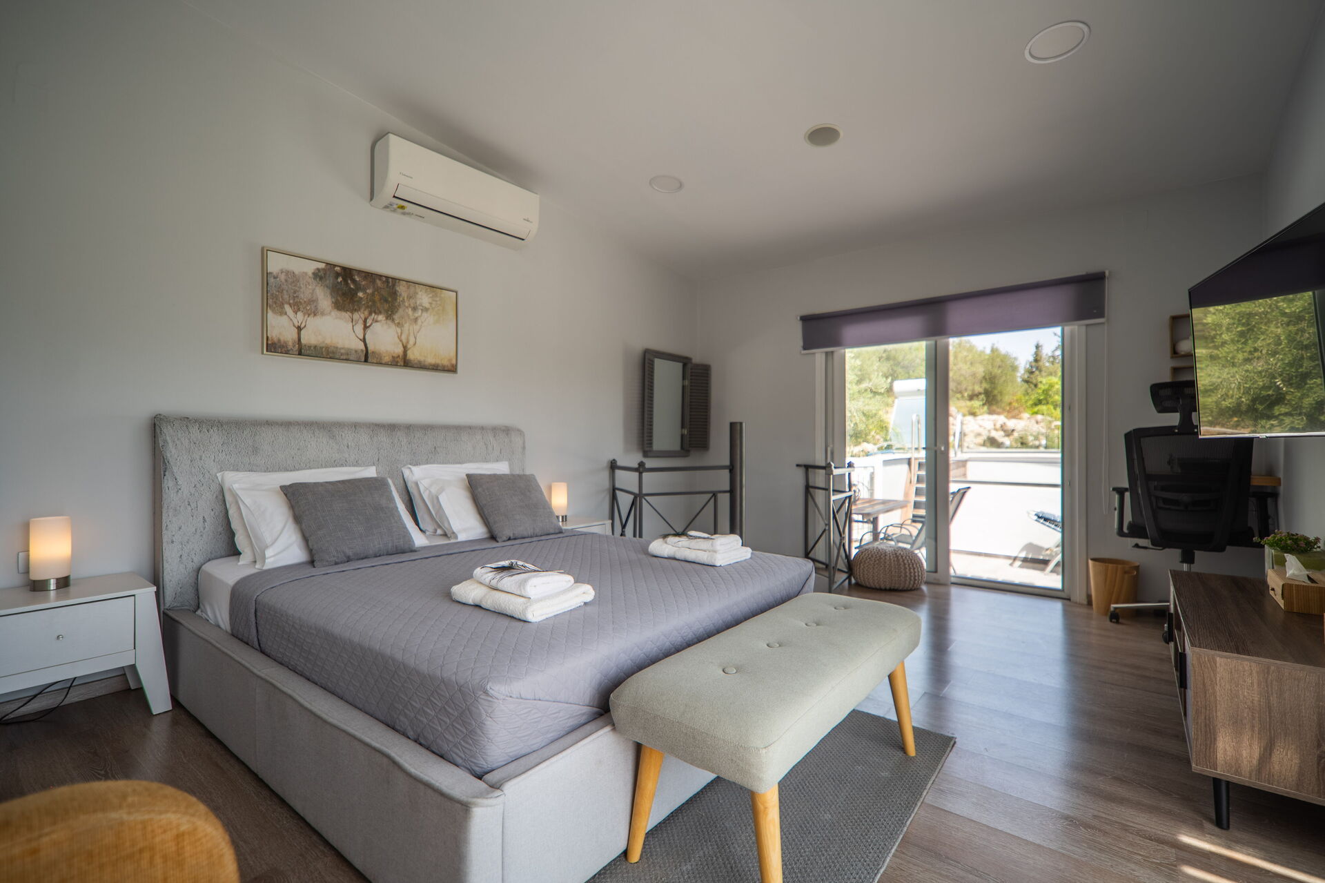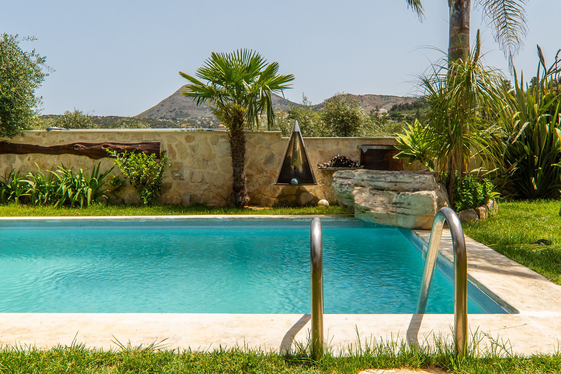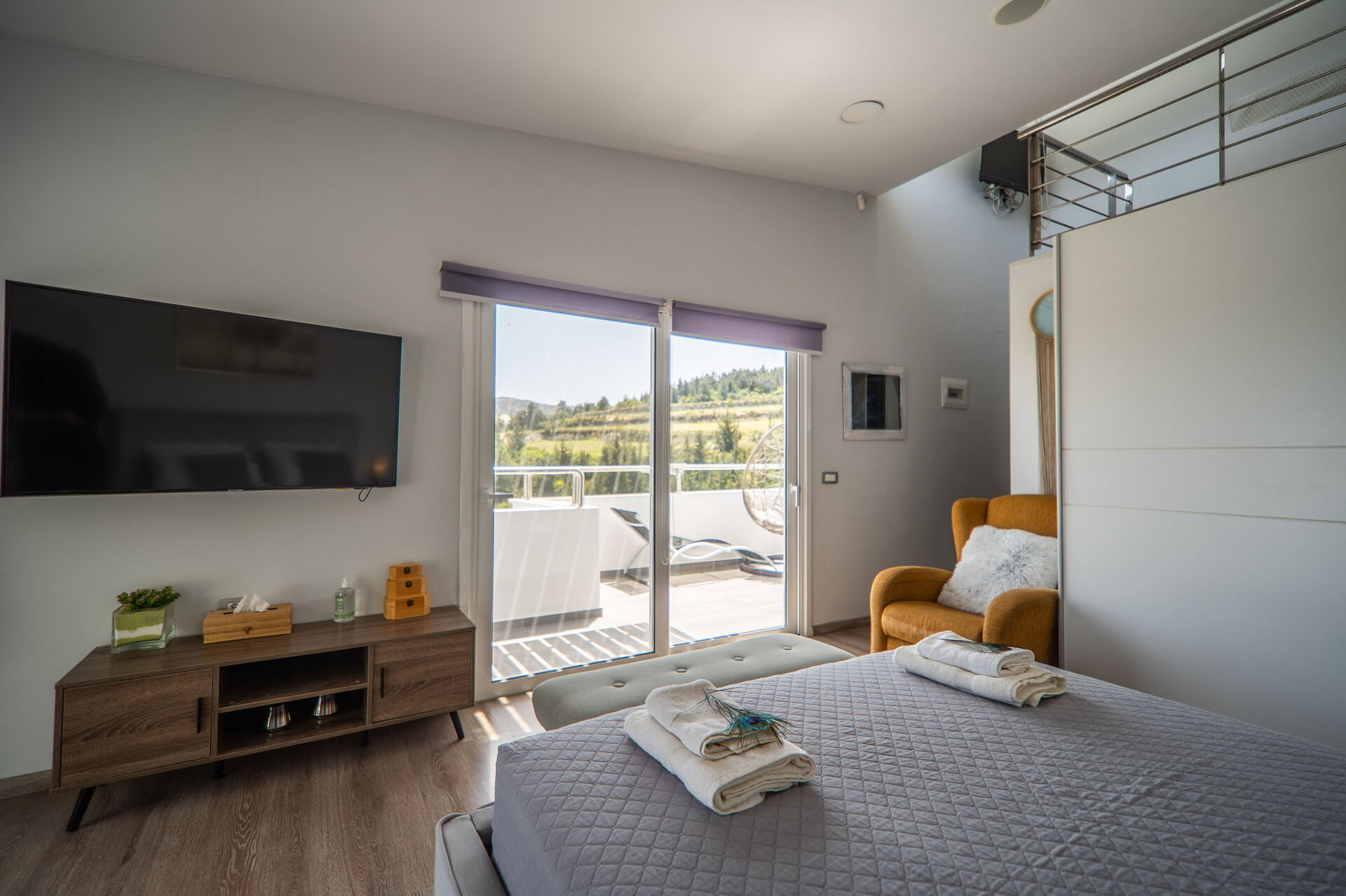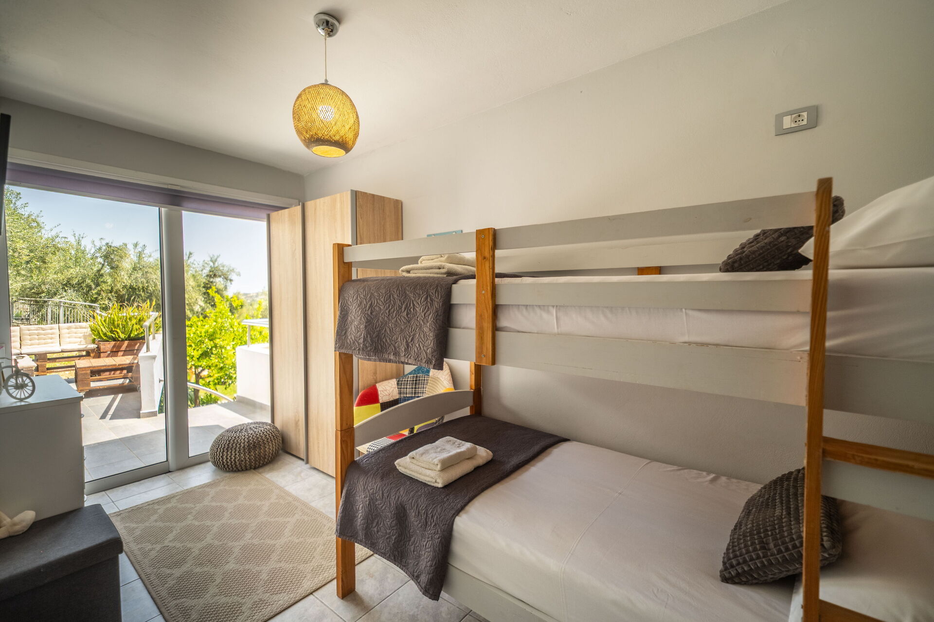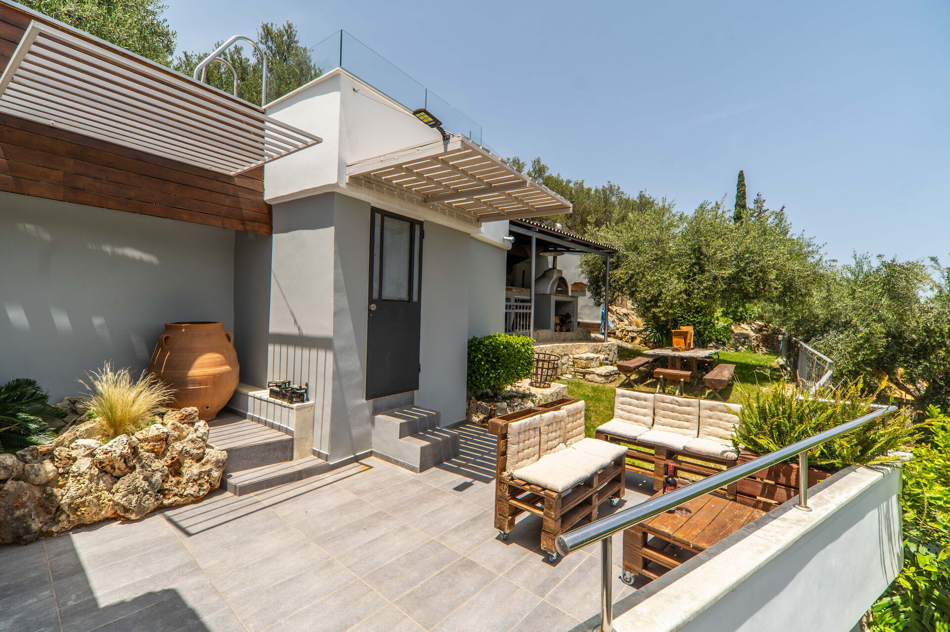 It offers a gorgeous garden, with plenty of trees, plants and flowers , all of them perfectly kept. What impressed us the most were the great number of lovely spots to relax: the 2 hammocks, at least 3 hanging chairs, sunloungers, 3 tables and chairs to sit and eat outside... one in the main garden, one on the first floor terrace, one at the Bbq: you will be spoiled for choices! We used to have breakfast on the terrace on the first floor, to enjoy the lovely view of the hills, and the sea in the distance in early morning, while we prefered the one in the garden, in front of the enlighted pool for dinner! For children a real playground has been created: swings of every kind , slide, a cute wood house, a climbing arch....and the 2 pools!!! Indoor, the property is not less attractive: the master bedroom is dreamy, with a gorgeous view and access to the jacuzzi! The other 2 bedrooms are lovely and both have access also on the garden. Every room is provided with smart tv and Ac. Also the kitchen area is just fabolous: you will find everything you may need: Oven, dishwasher, many tools to cook... and eveything is very convenient: you can access the first floor also from an external staircase for example, there is a nice area to hang clothes after using the washing maschine, the villa is equpped with an alarm system, and the outdoor automatic light system works perfectly. But what makes this property so special, are of course the owners and their welcome.