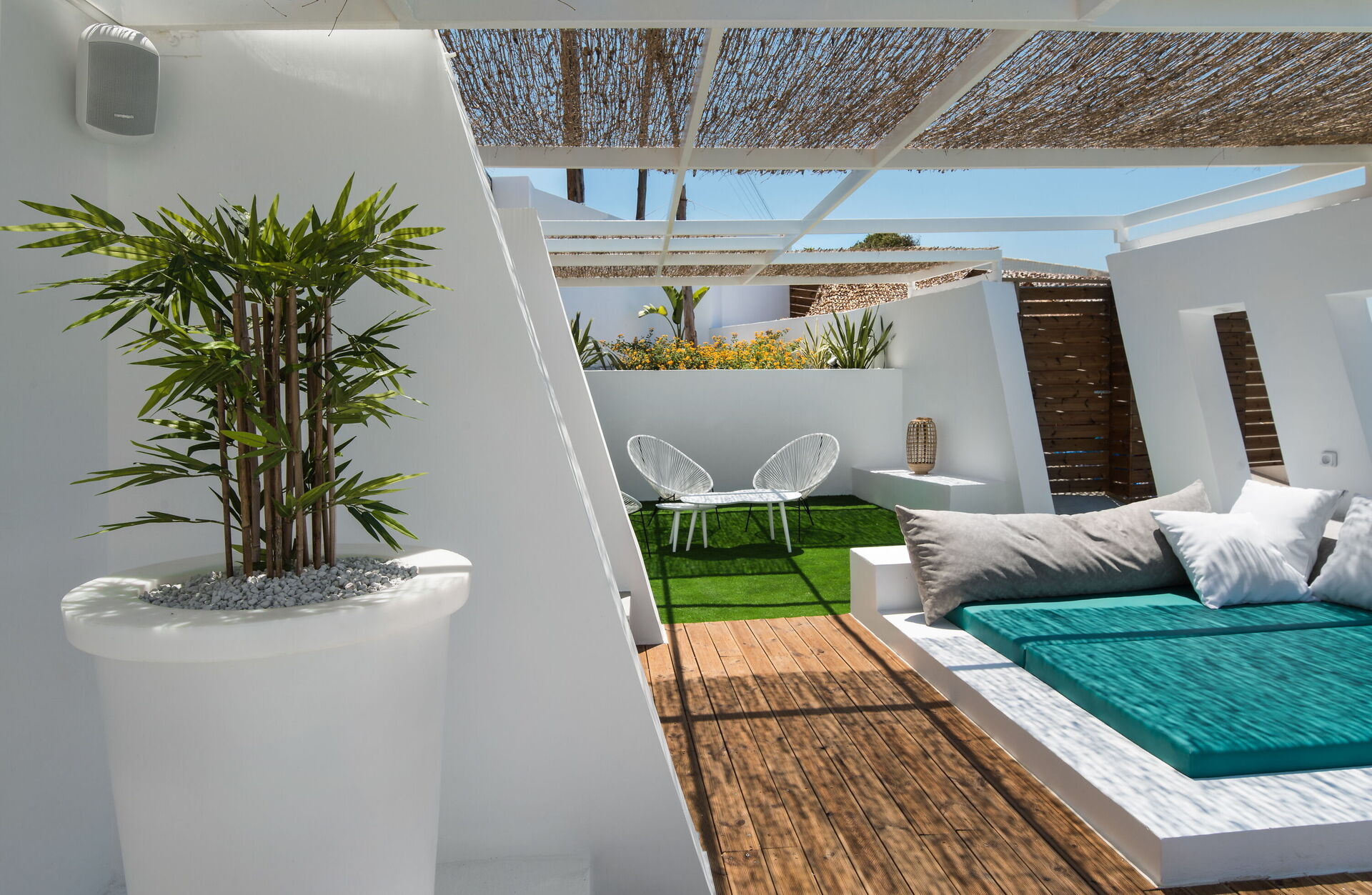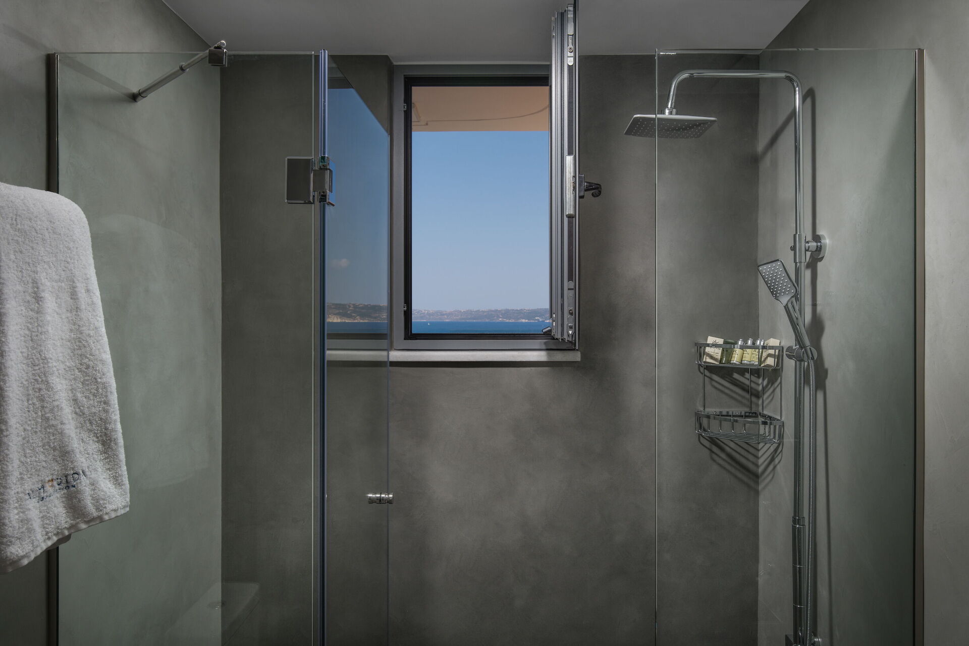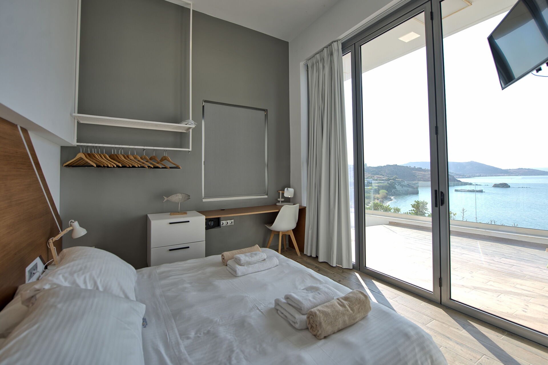 Depuis la chambre et le séjour, on accède à une terrasse panoramique avec vue sur la mer.