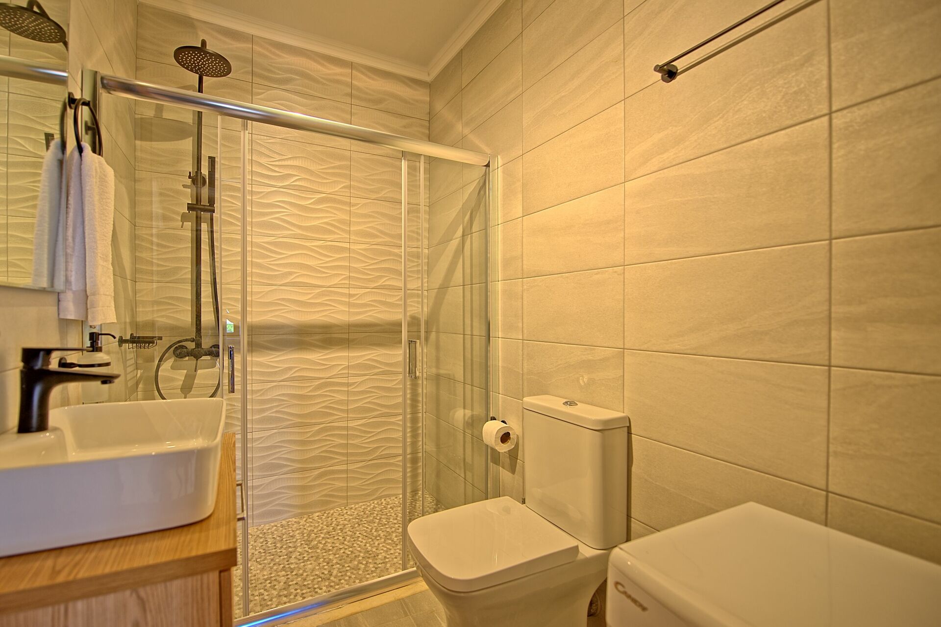 Die Ausstattung ist modern, neuwertig und mit voll ausgestatteter Küche, großem Kühlschrank mit Tiefkühler, Waschmaschine, Geschirrspüler, TV und starkem WiFi. Der Pool ist eine tolle Ergänzung, haben wir oft und gern zur Erfrischung genutzt. Wir haben nichts vermisst.